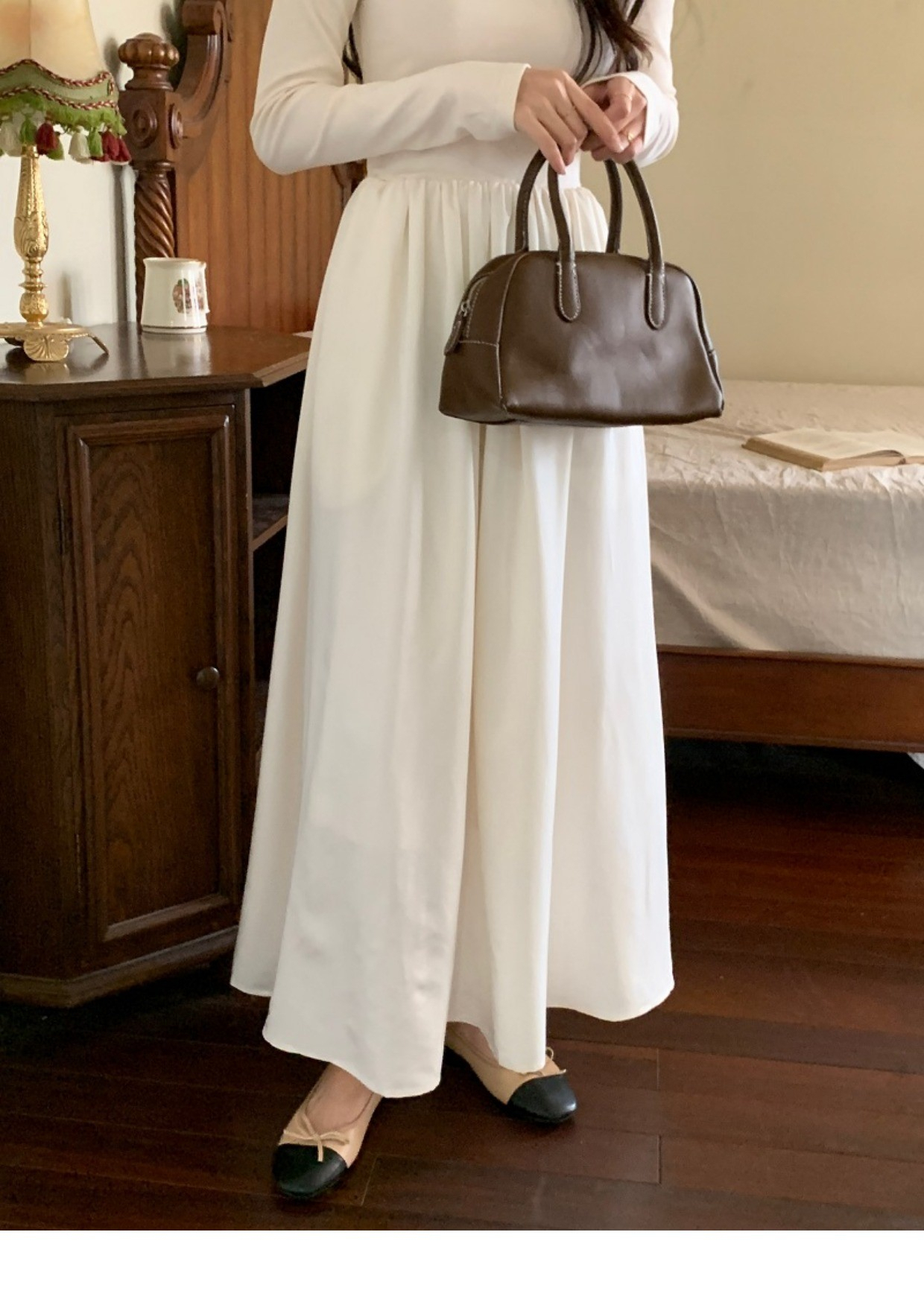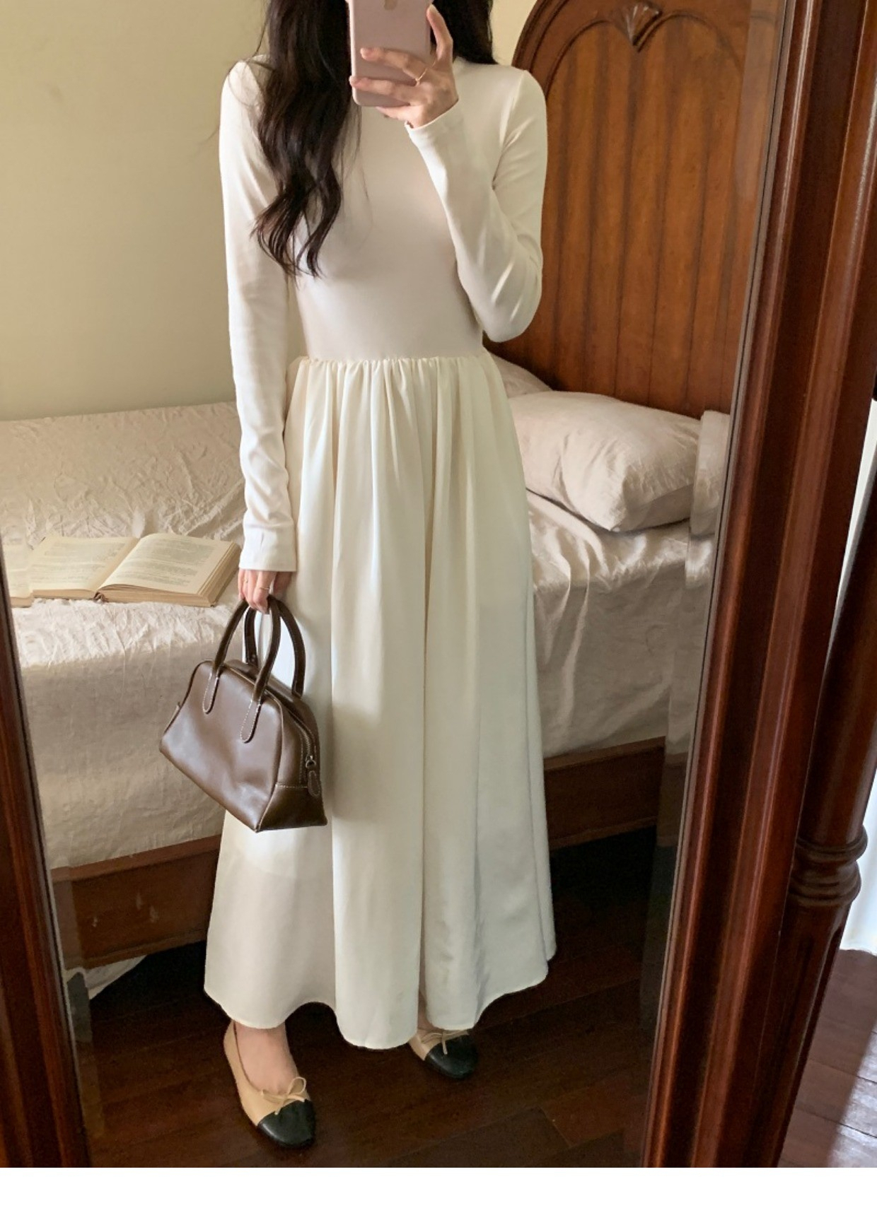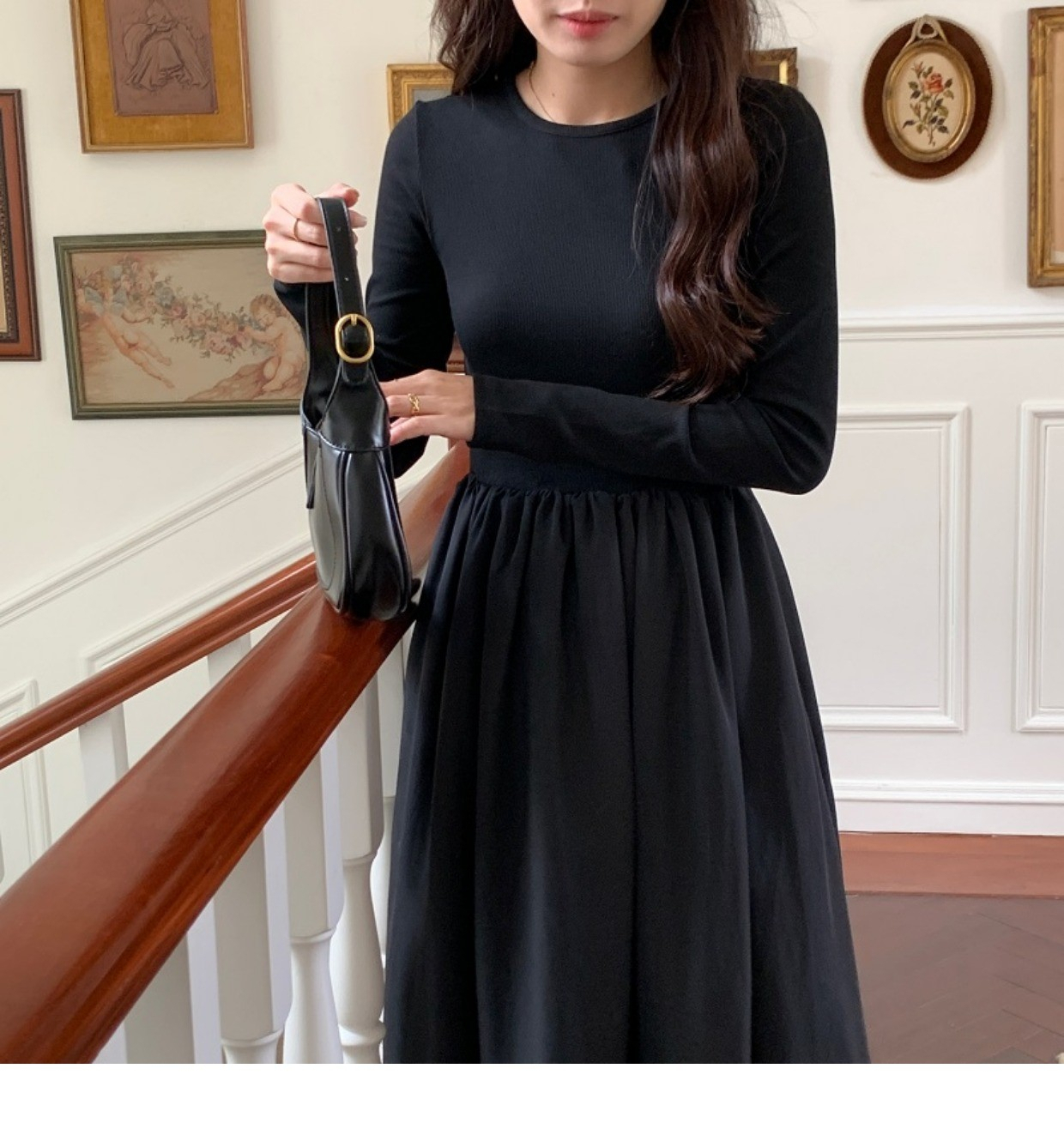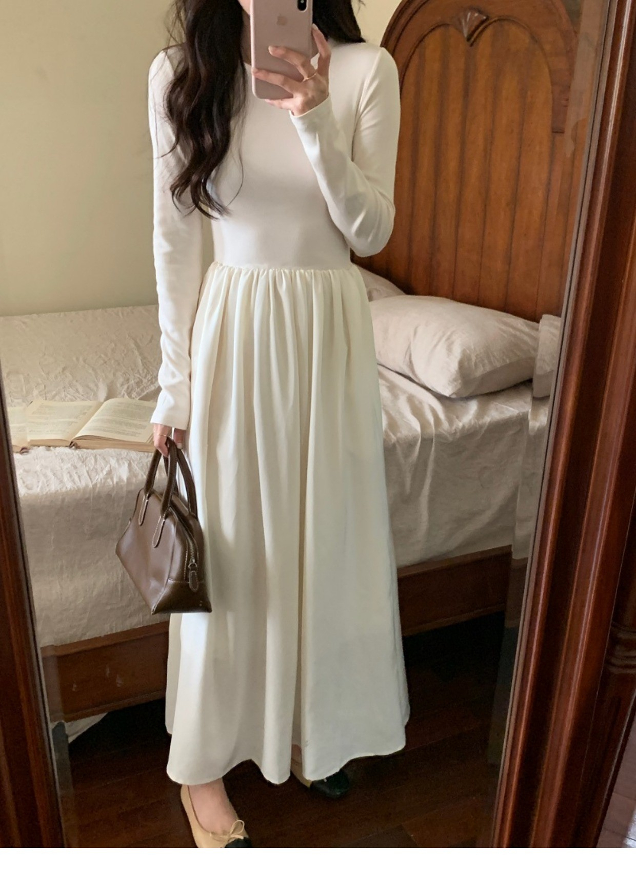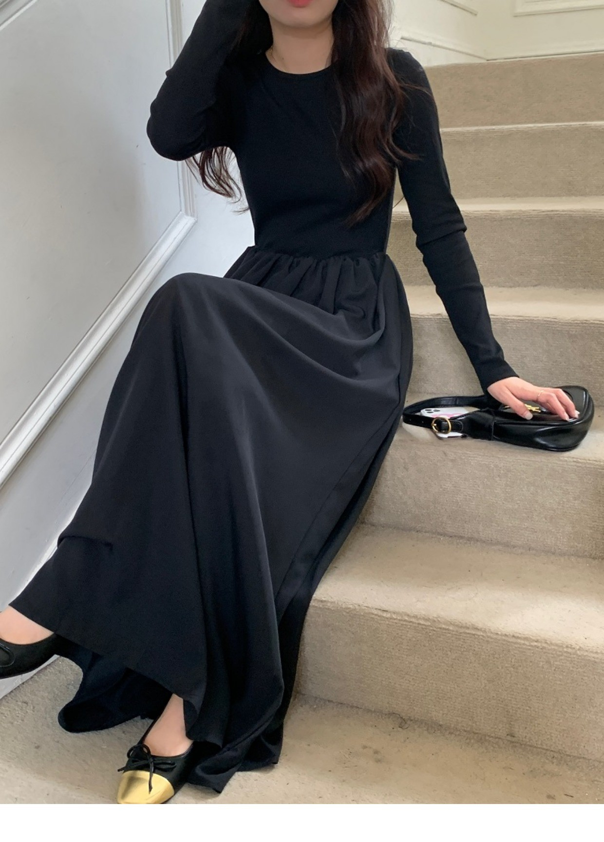 • A stylish backless long-sleeved fitted dress for early autumn, exuding French elegance with a round neck and a pullover design.