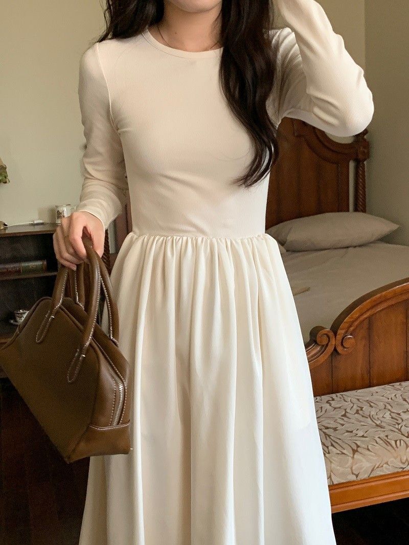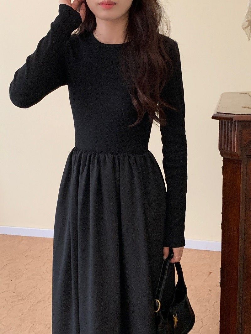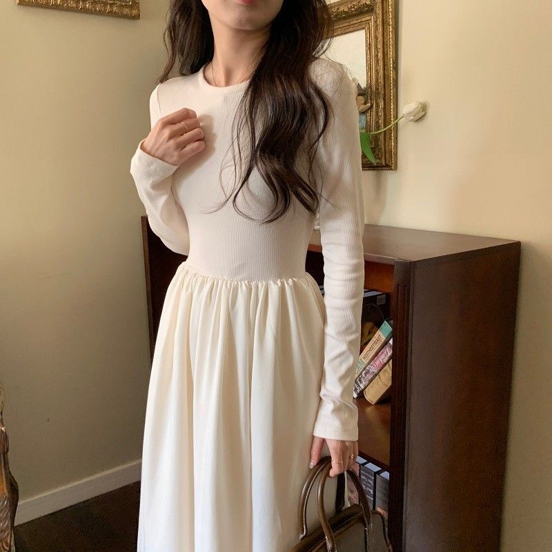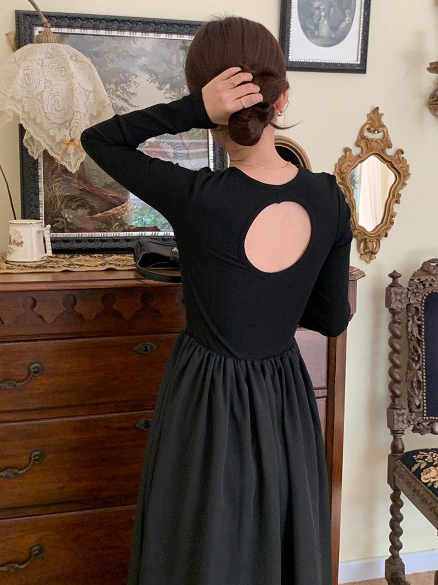 A stylish backless long-sleeved fitted dress for early autumn, exuding French elegance with a round neck and a pullover design.