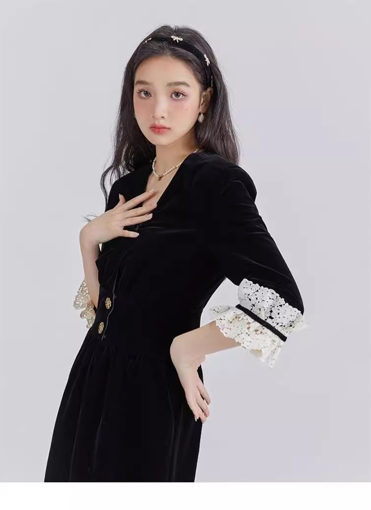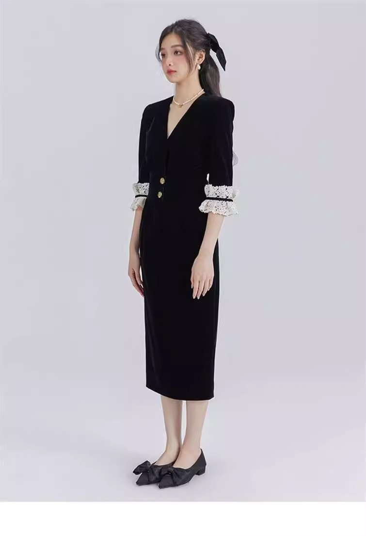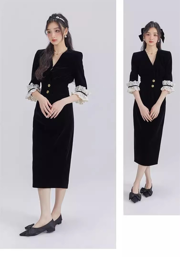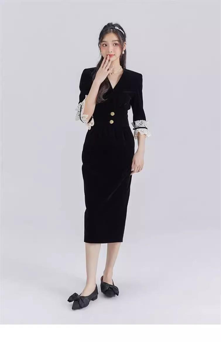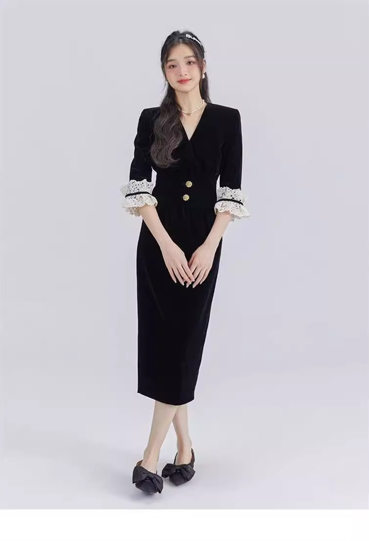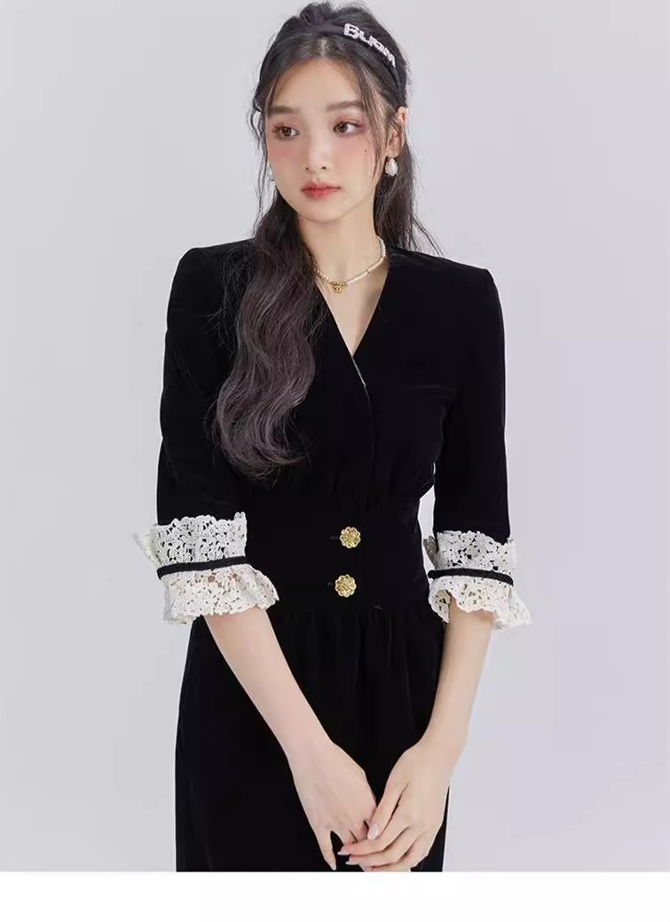• High-end sexy velvet classic elegant spring French style black V-neck retro commuter high waist slimming new arrival for mid-winter
