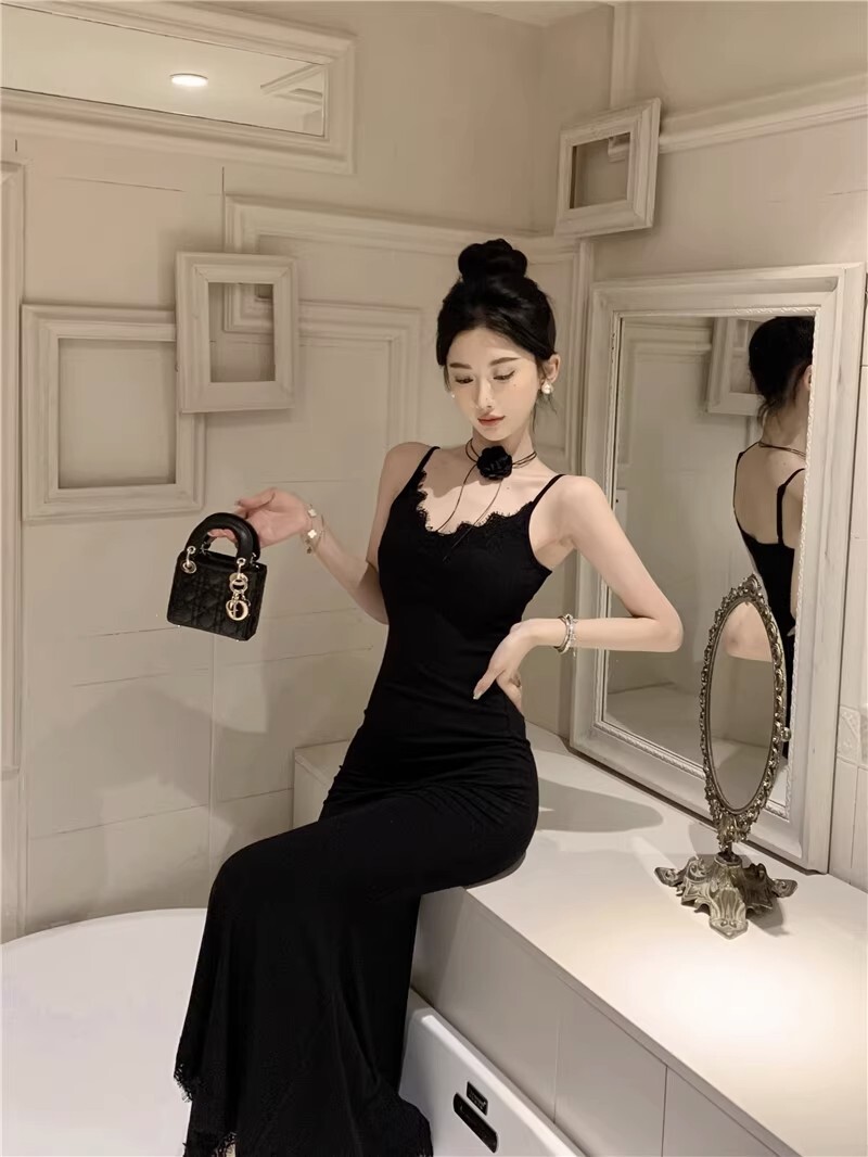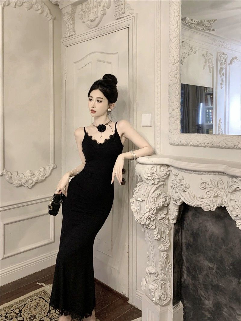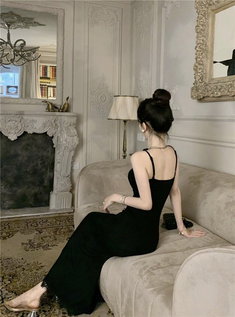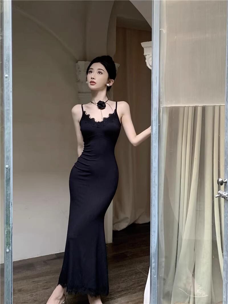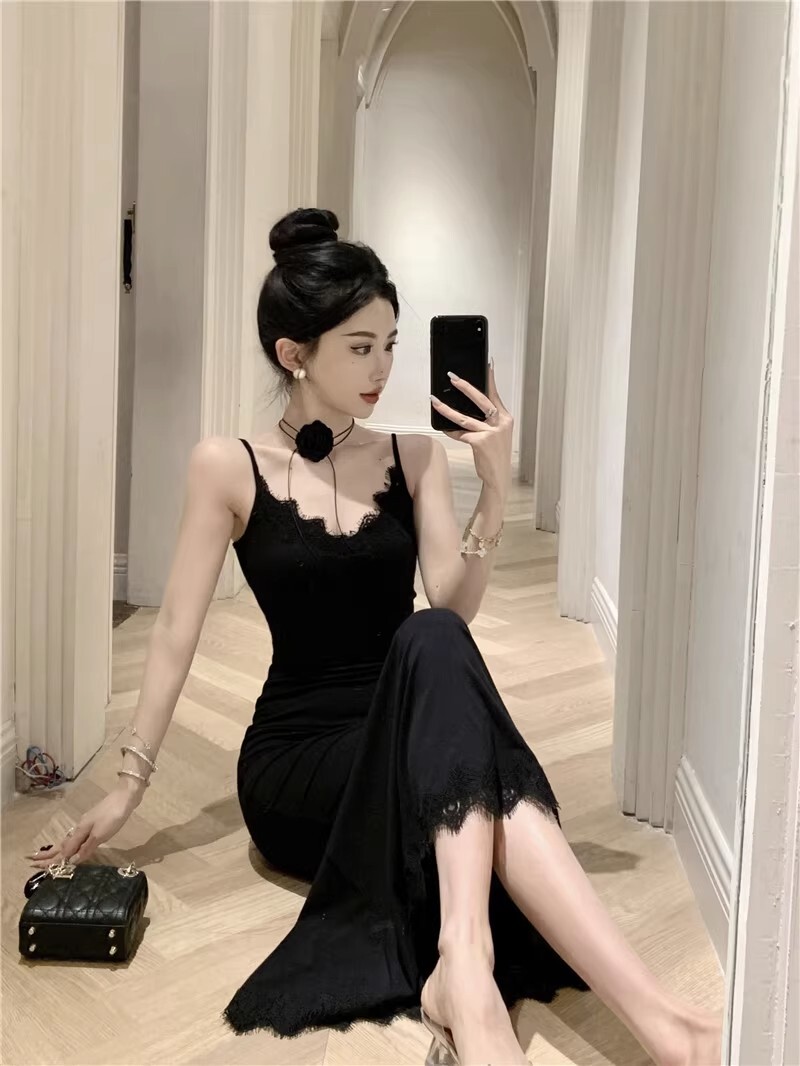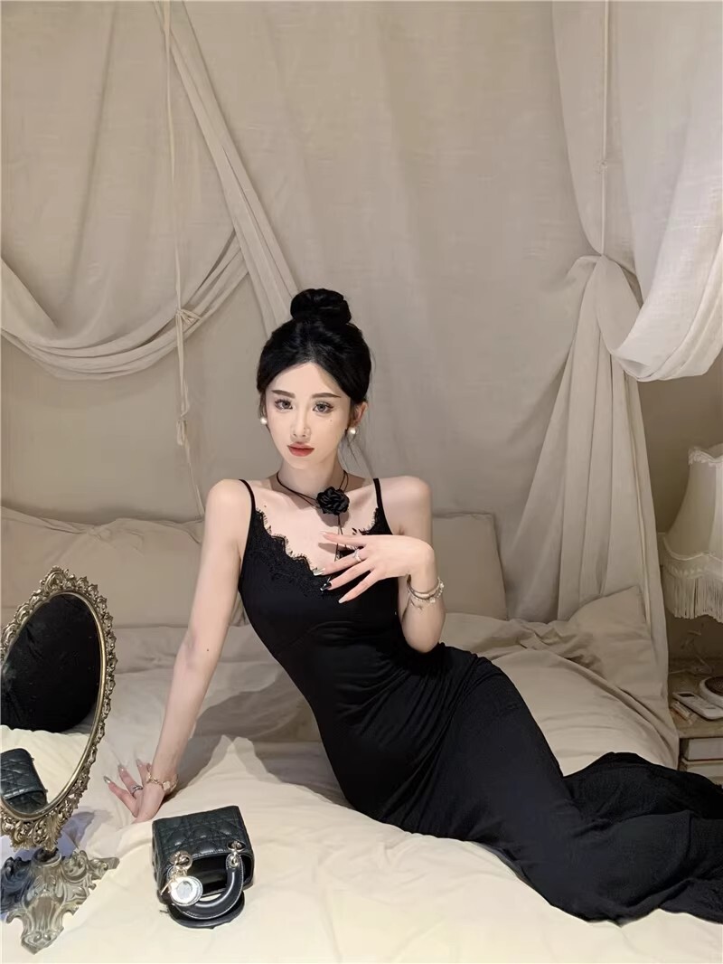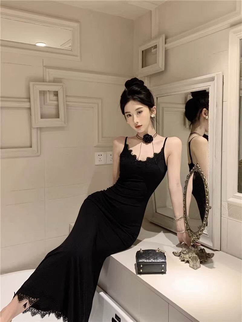 • Slim-fitting lace bodycon dress, women's spring and autumn sleeveless base layer, rich heiress style suspender dress long skirt