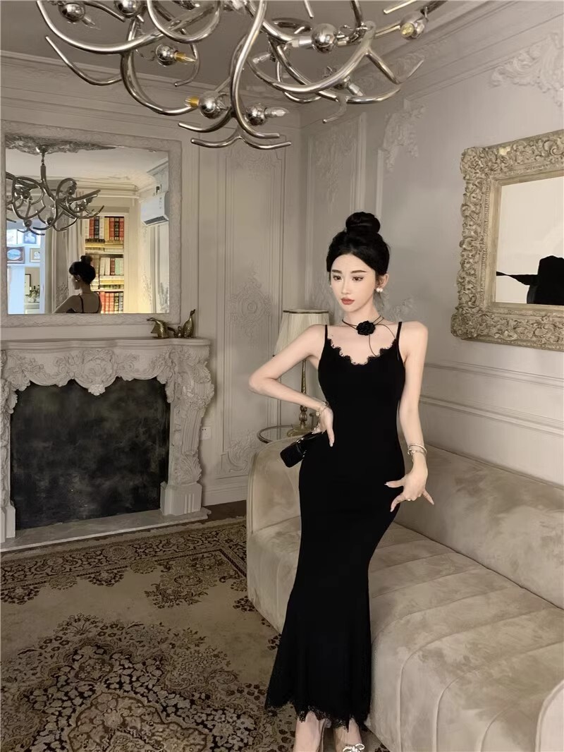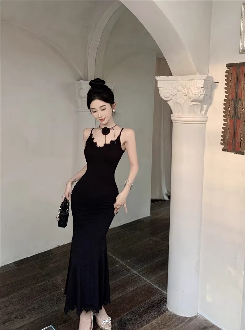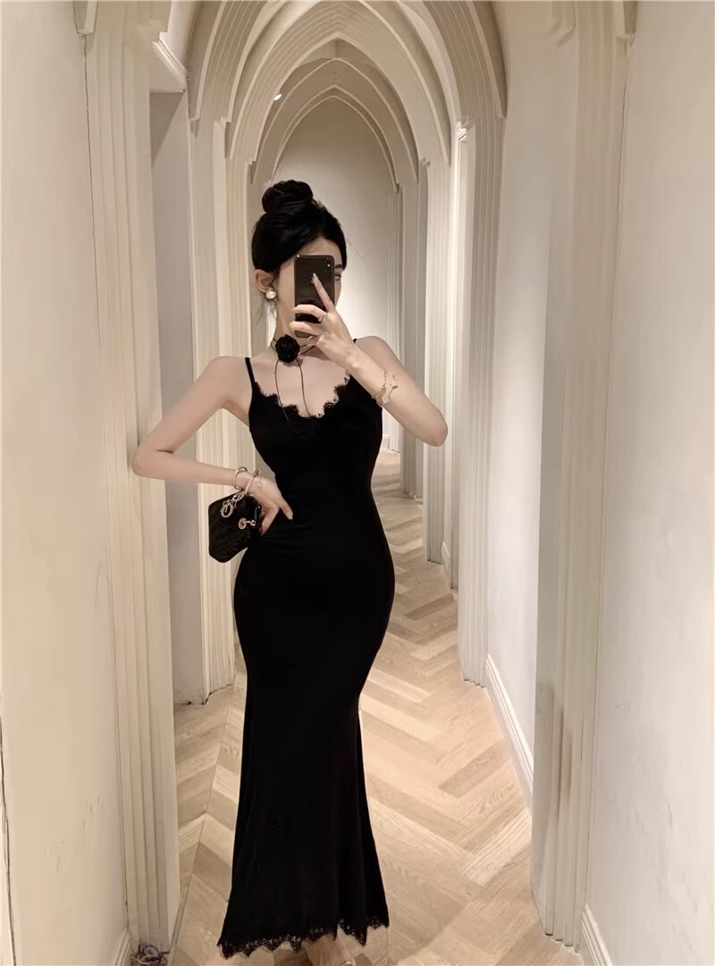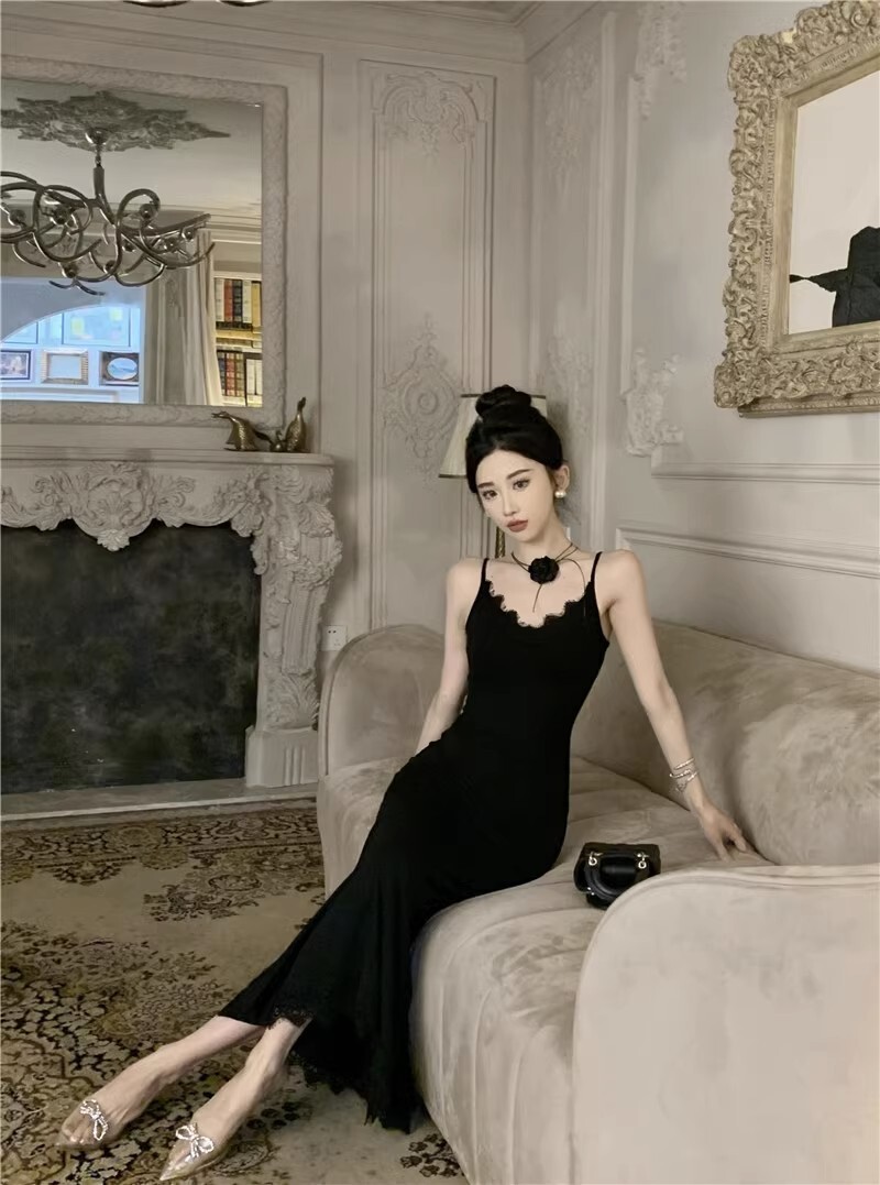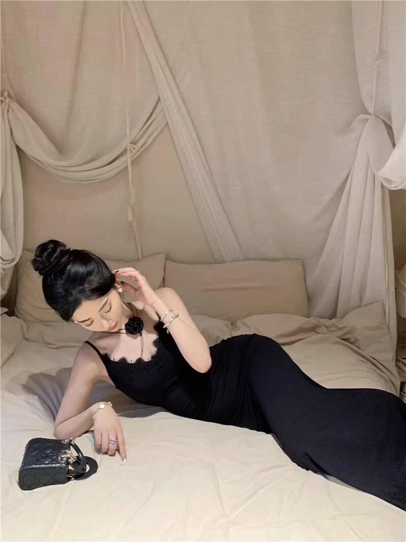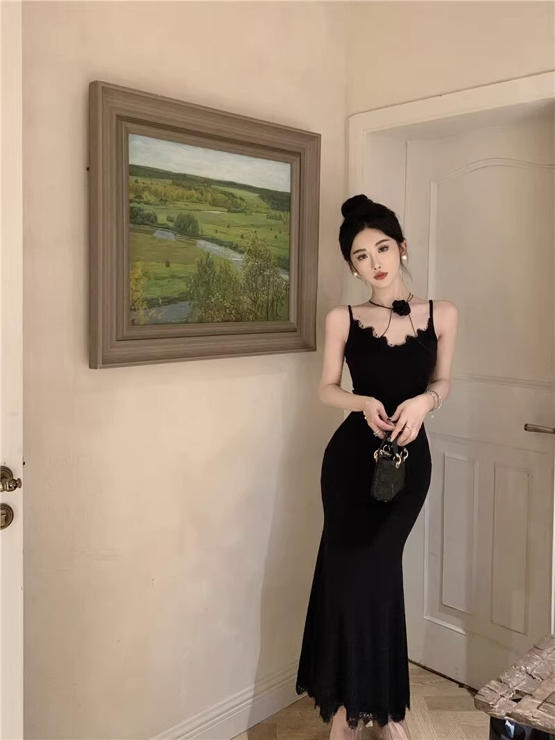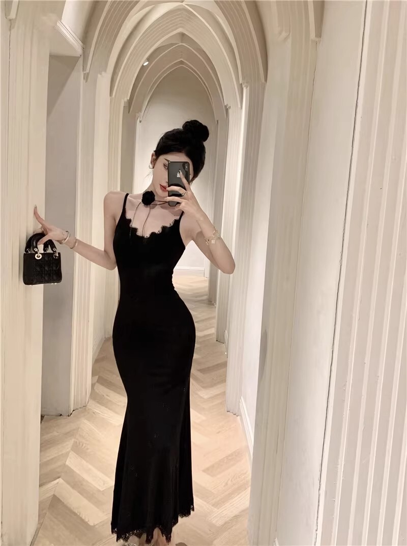 • Slim-fitting lace bodycon dress, women's spring and autumn sleeveless base layer, rich heiress style suspender dress long skirt