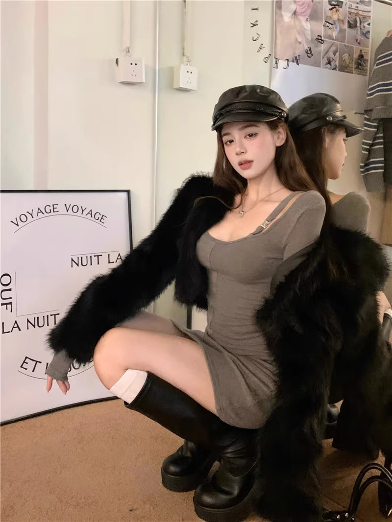 Grey U-neck bodycon mini skirt for women, sexy autumn and winter base layer, tight-fitting and slimming, pure and sexy long-sleeved dress