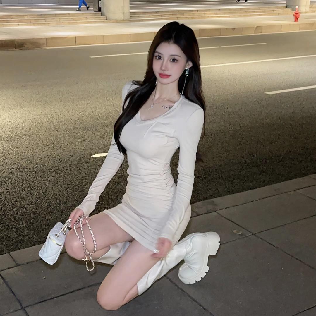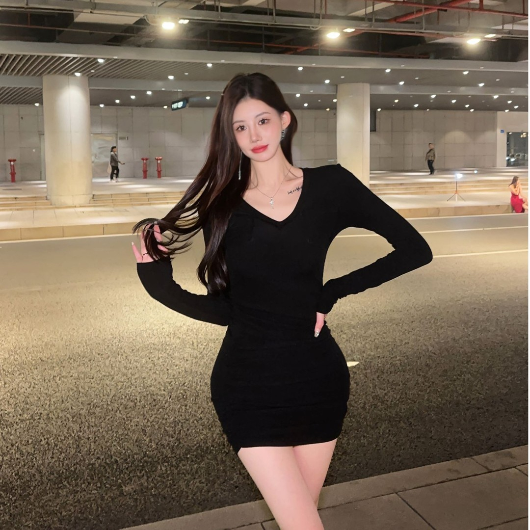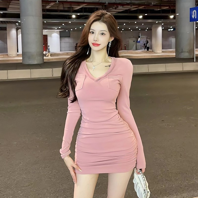 Pure and alluring V-neck bodycon dress with pleats, long sleeves, and fleece lining, perfect for autumn and winter.