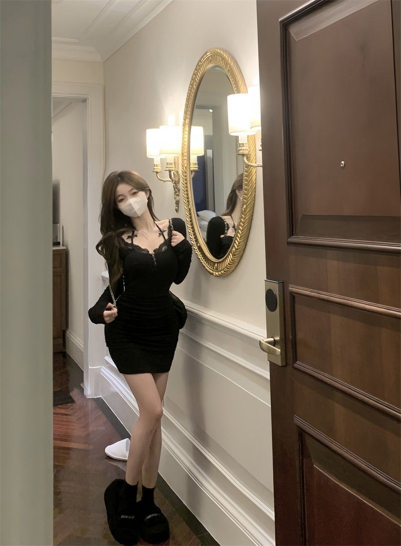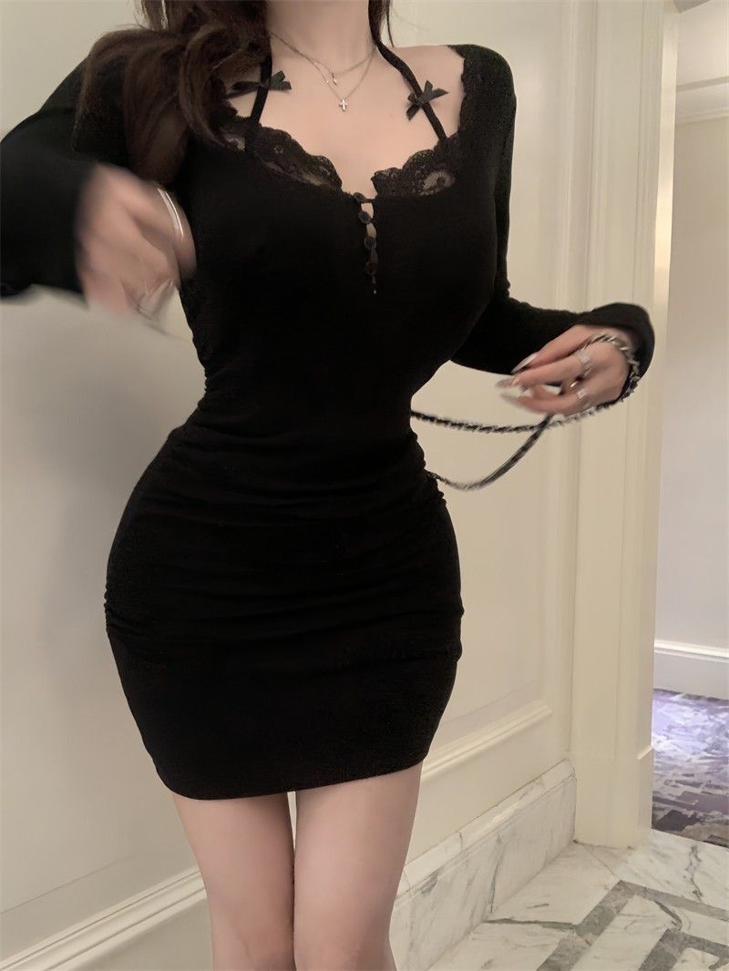 • Off-the-shoulder halter neck lace dress for women, autumn and winter, pure and sexy, bodycon dress, beautiful mother-dress, white inner dress.