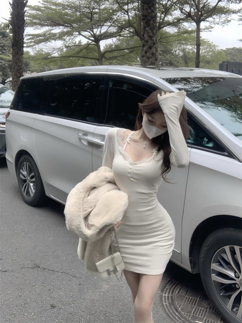 Off-the-shoulder halter neck lace dress for women, autumn and winter, pure and sexy, bodycon dress, beautiful mother-dress, white inner dress.