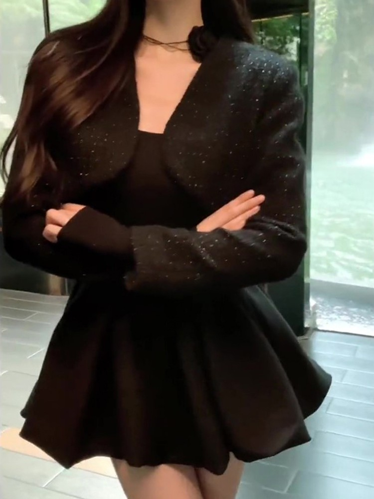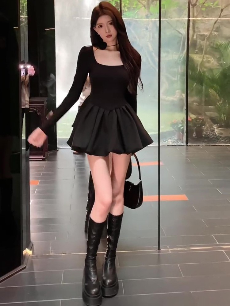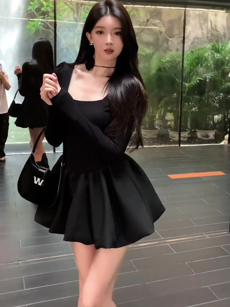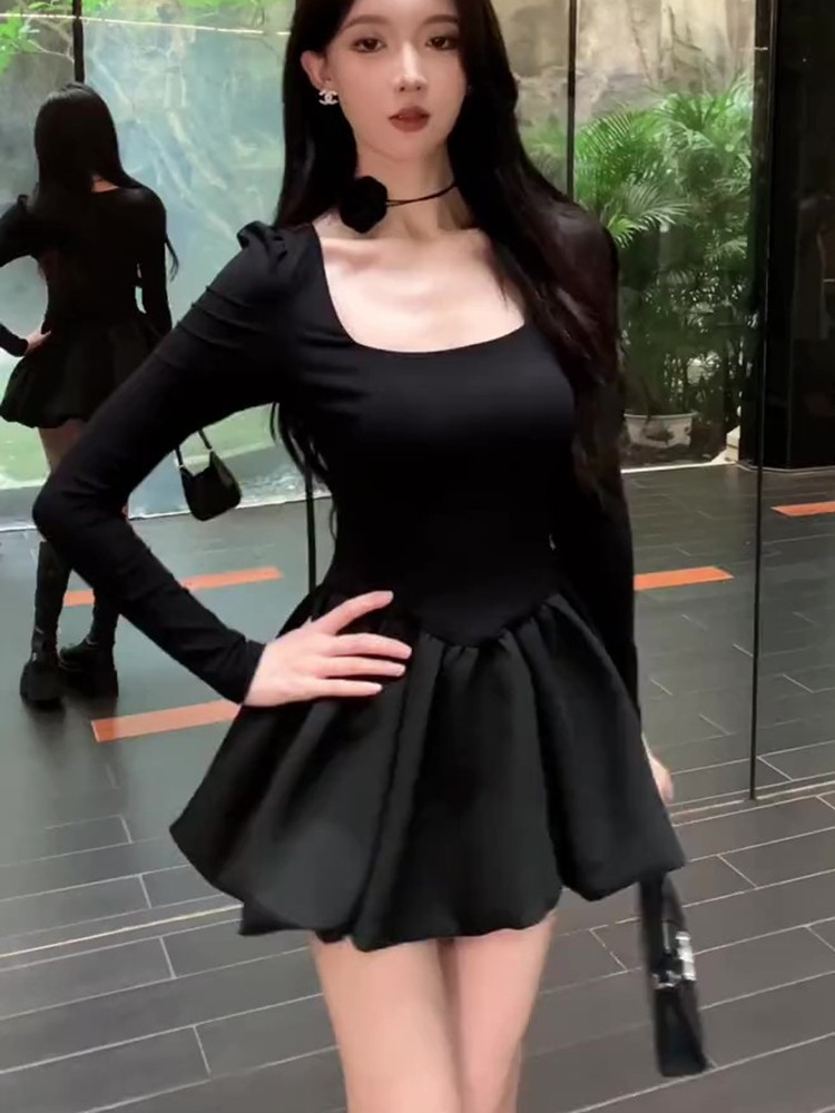 • Petite, stylish, fitted little black dress with long sleeves, A-line tulip skirt, and puffy princess dress.