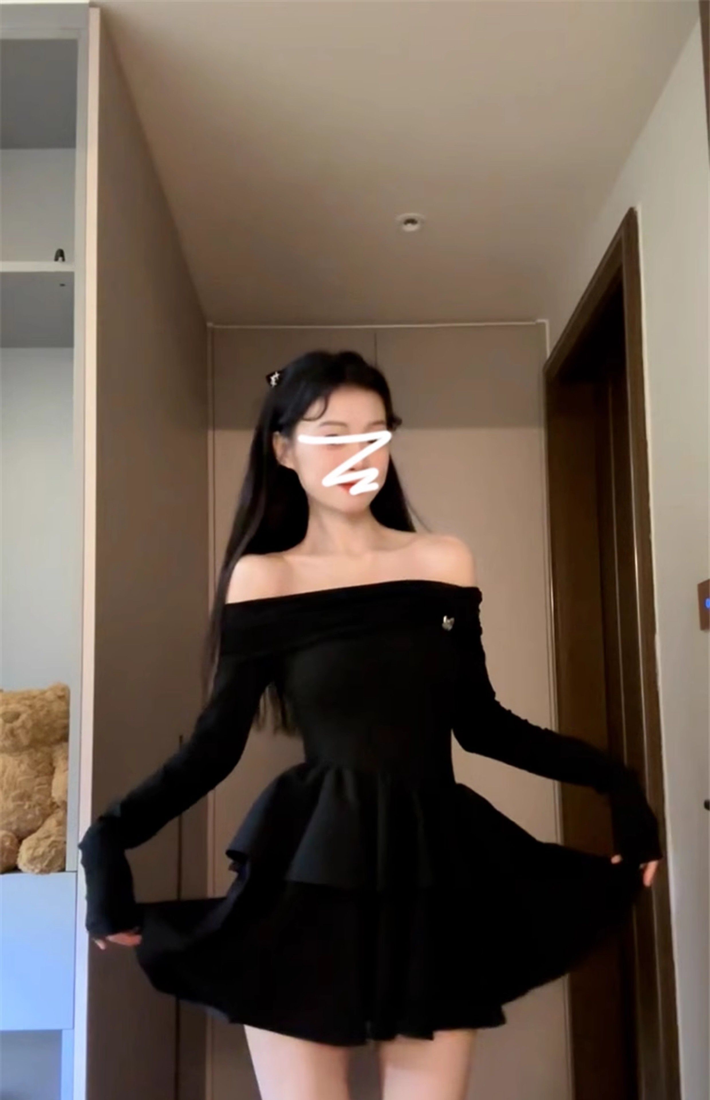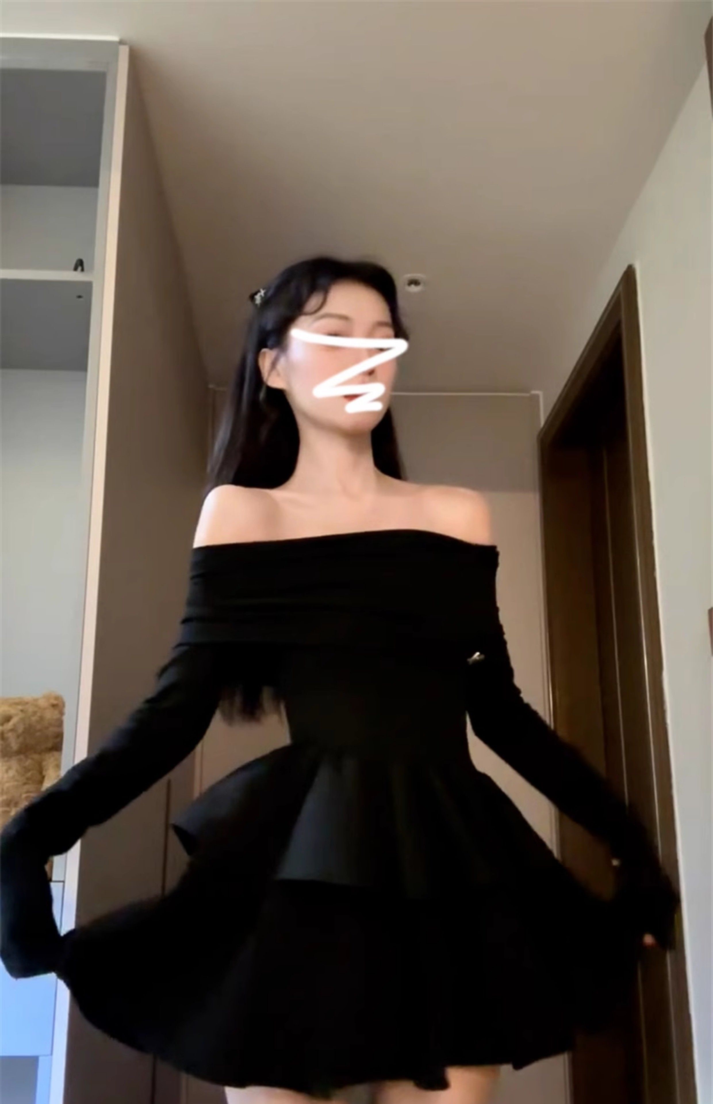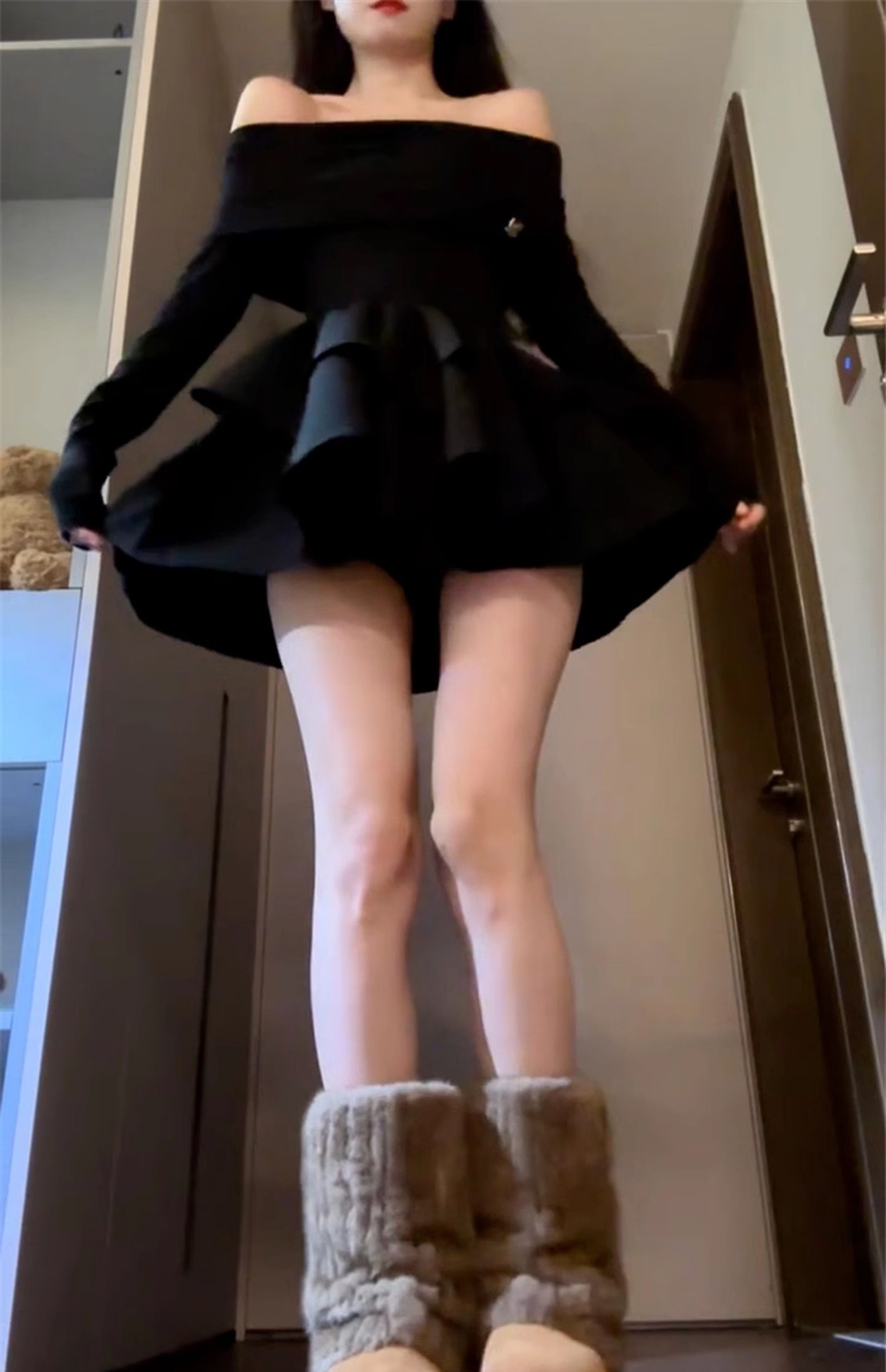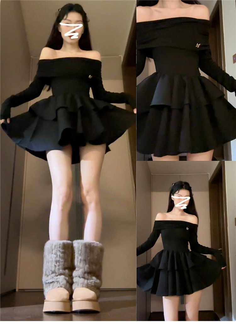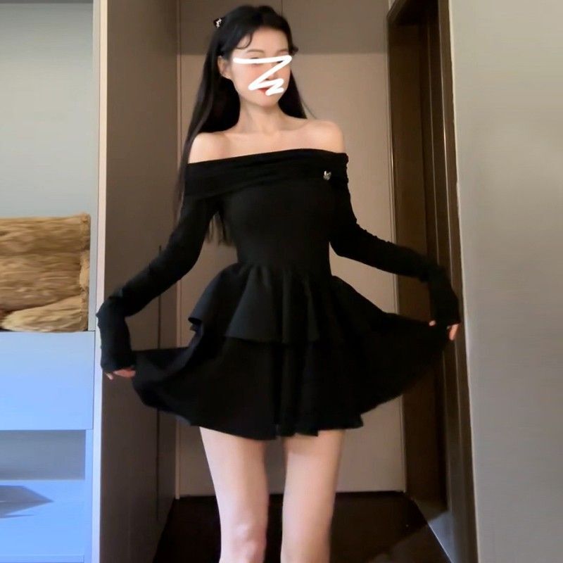 • Hepburn-style French high-end off-shoulder dress for autumn, pure and alluring, waist-cinching, cake princess dress, puffy skirt.