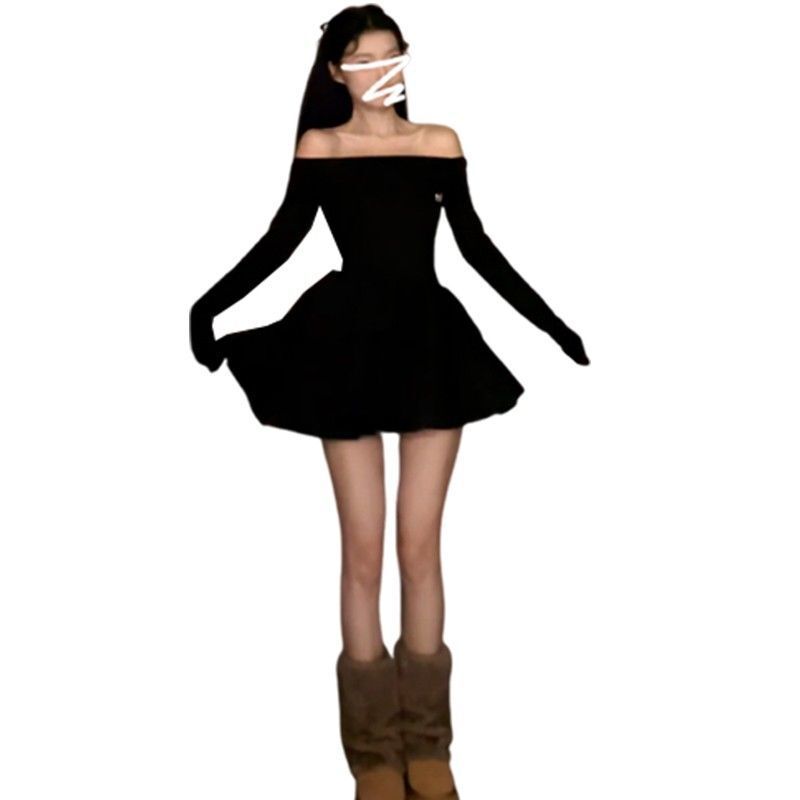 Hepburn-style French high-end off-shoulder dress for autumn, pure and alluring, waist-cinching, cake princess dress, puffy skirt.