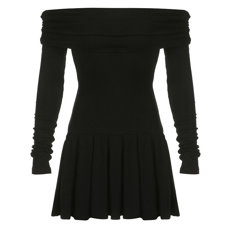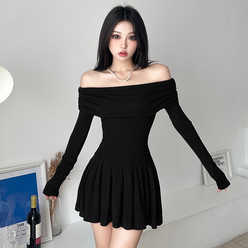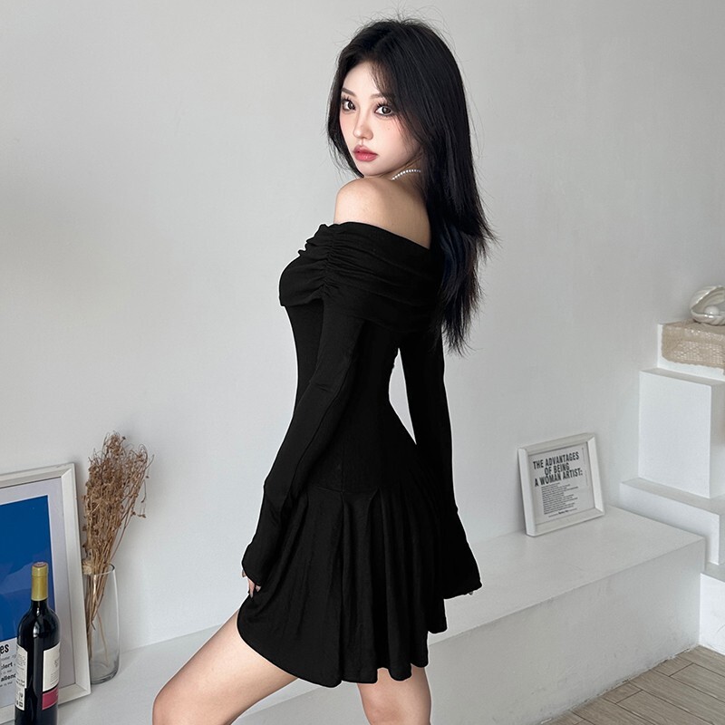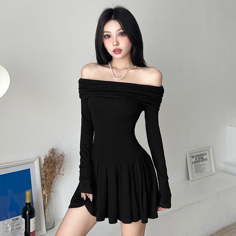 Pure and alluring off-the-shoulder black A-line fitted waist dress for autumn, sexy and hot, slim-fitting short skirt.