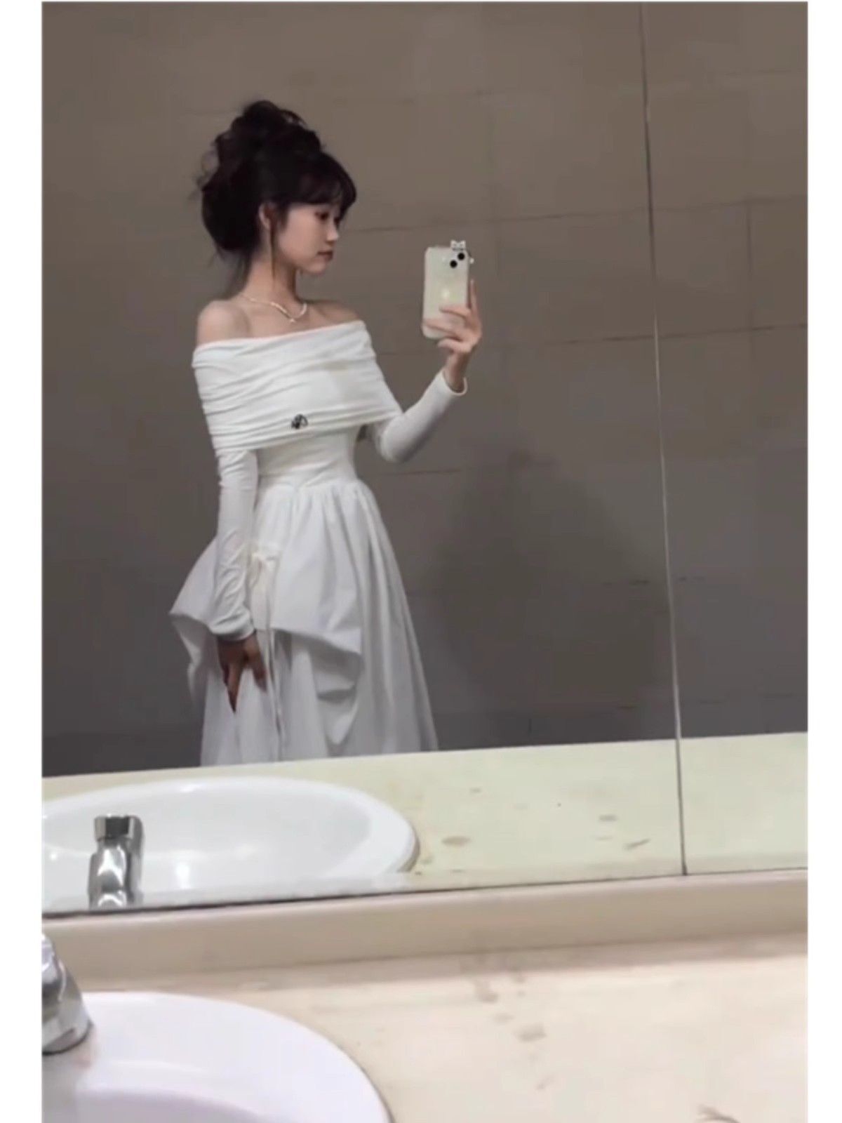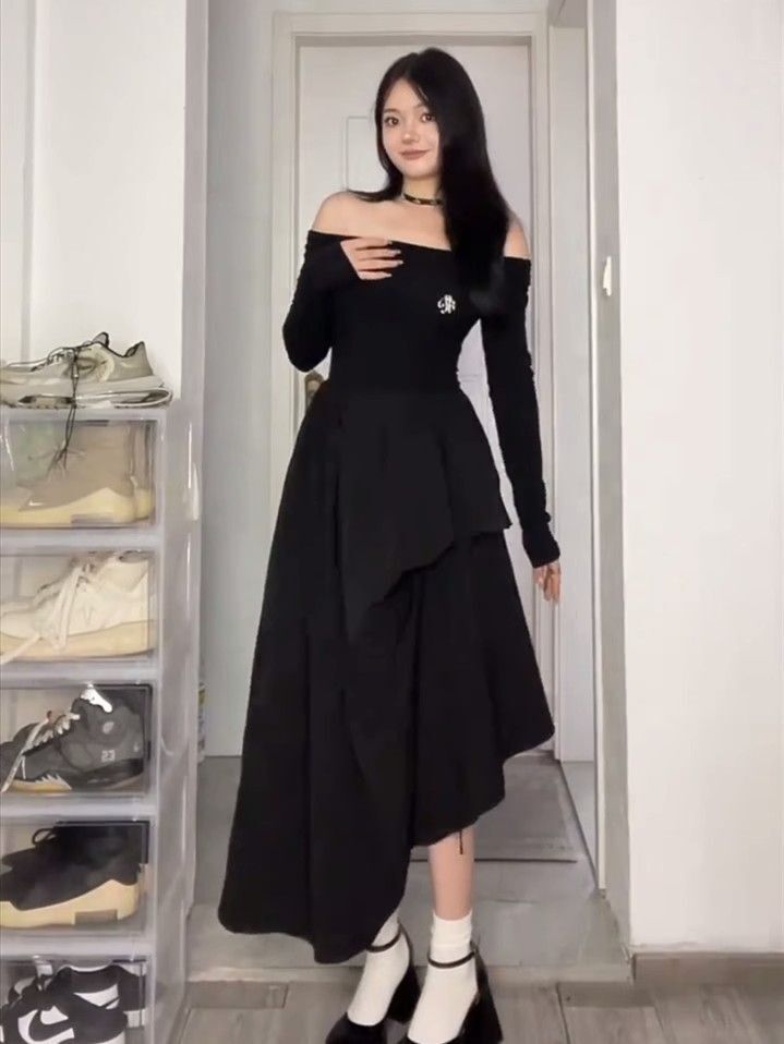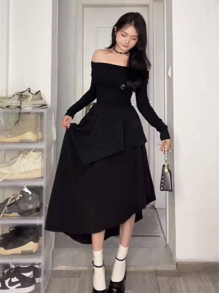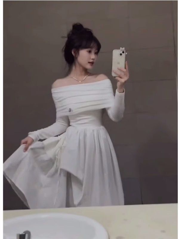 • French-style off-the-shoulder long-sleeved white dress, high-quality and elegant, a new early autumn style for 2024.
