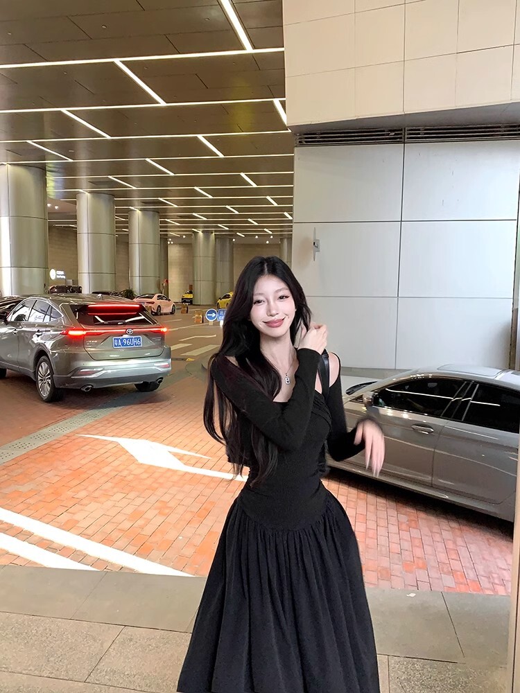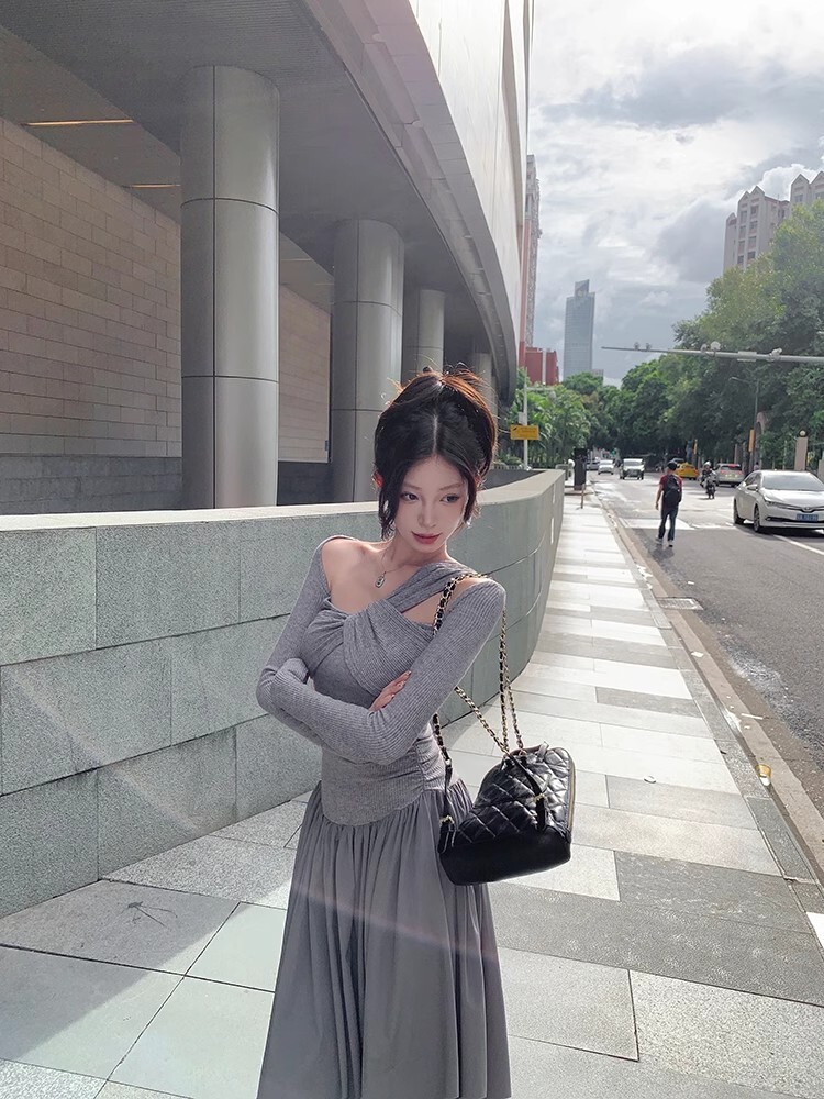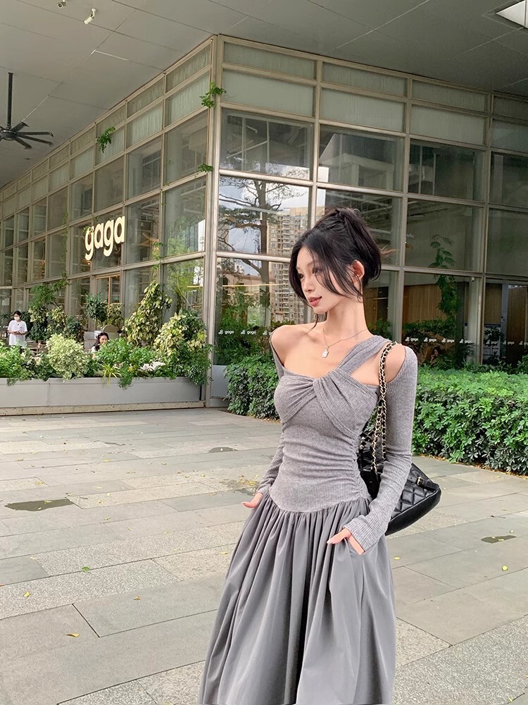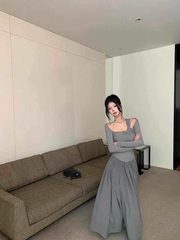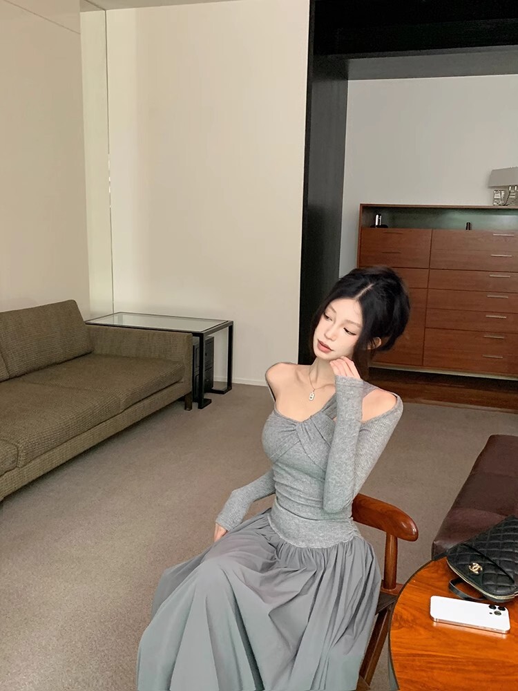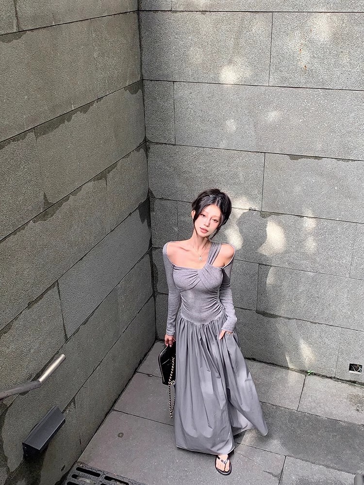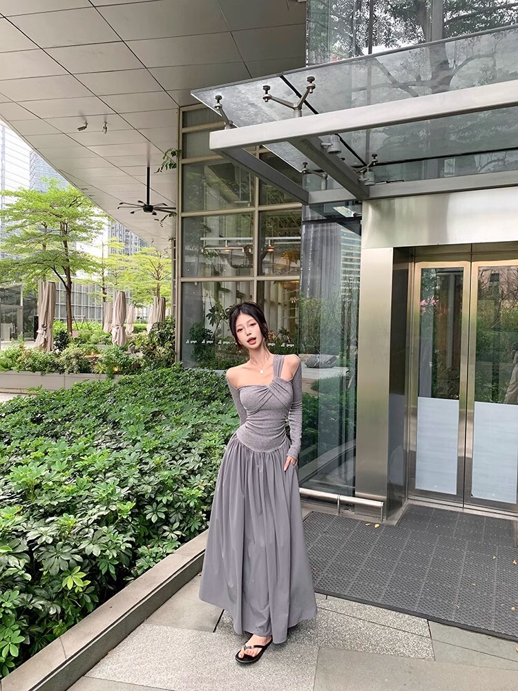 • Grey off-shoulder long-sleeved dress for women, new autumn/winter style, French chic, slim fit, waist-cinching, A-line long skirt