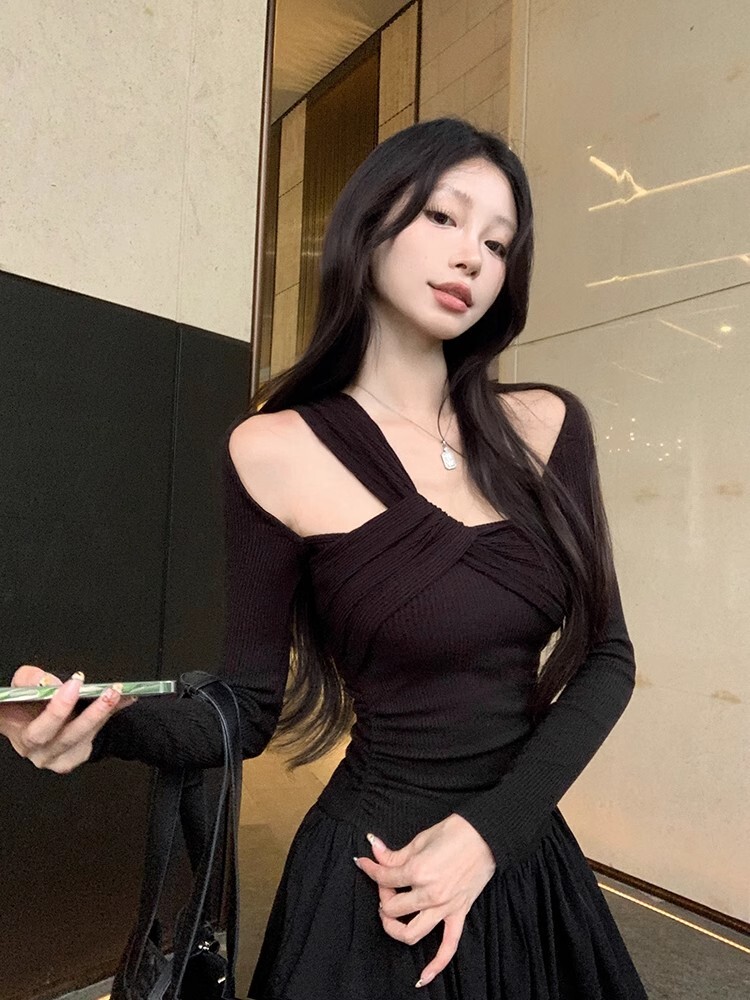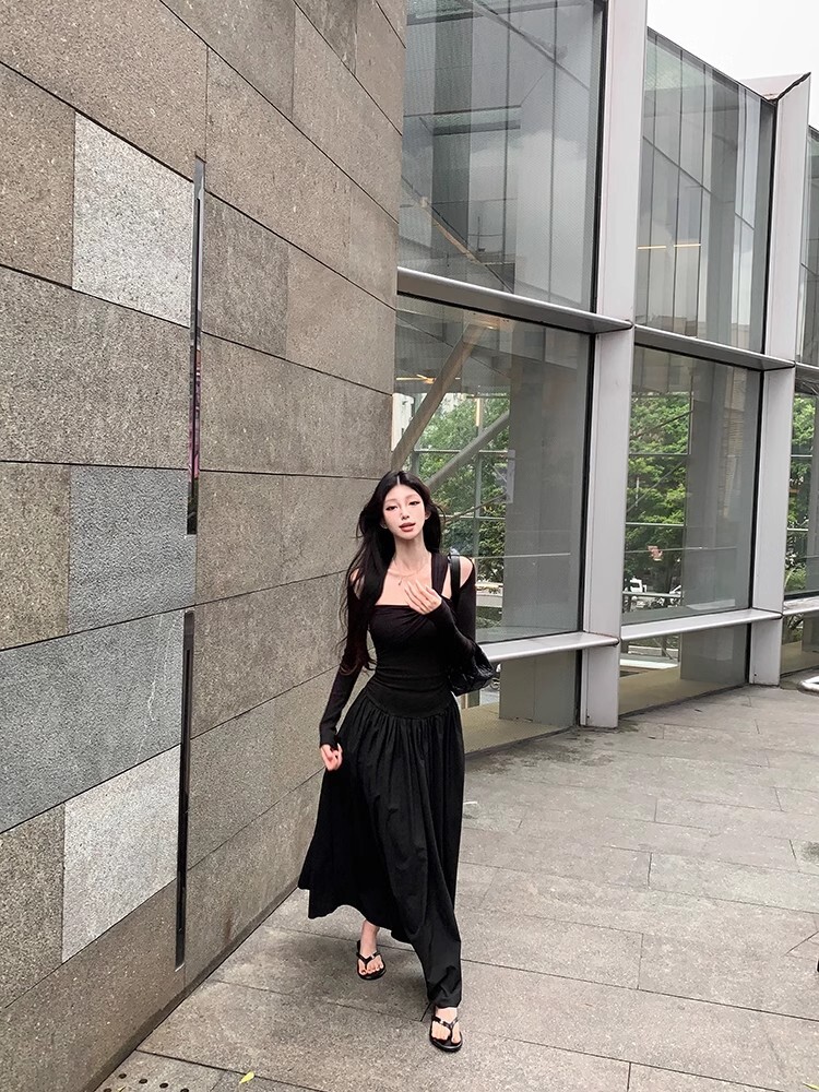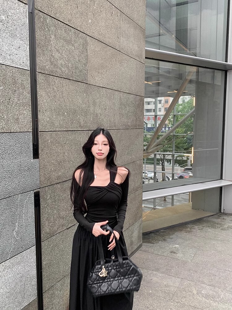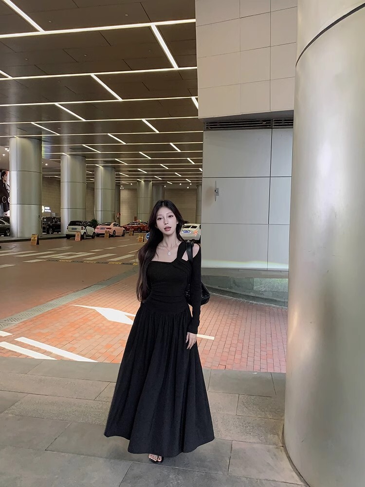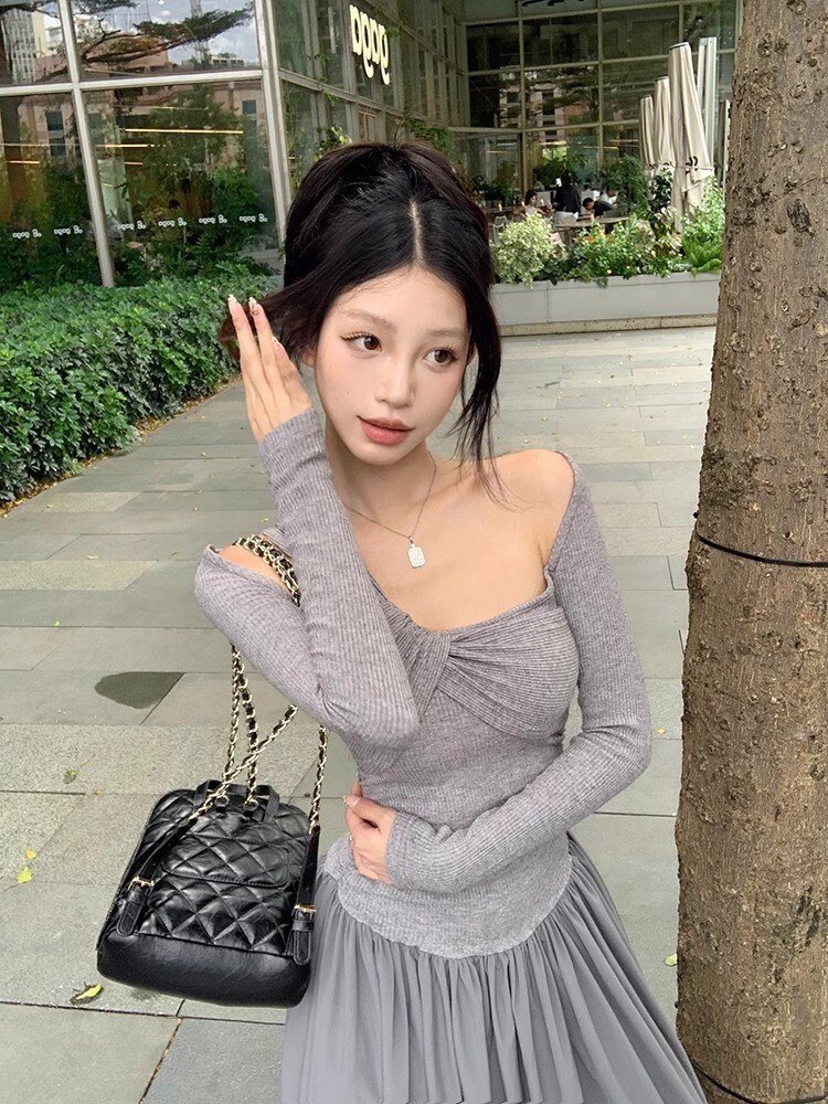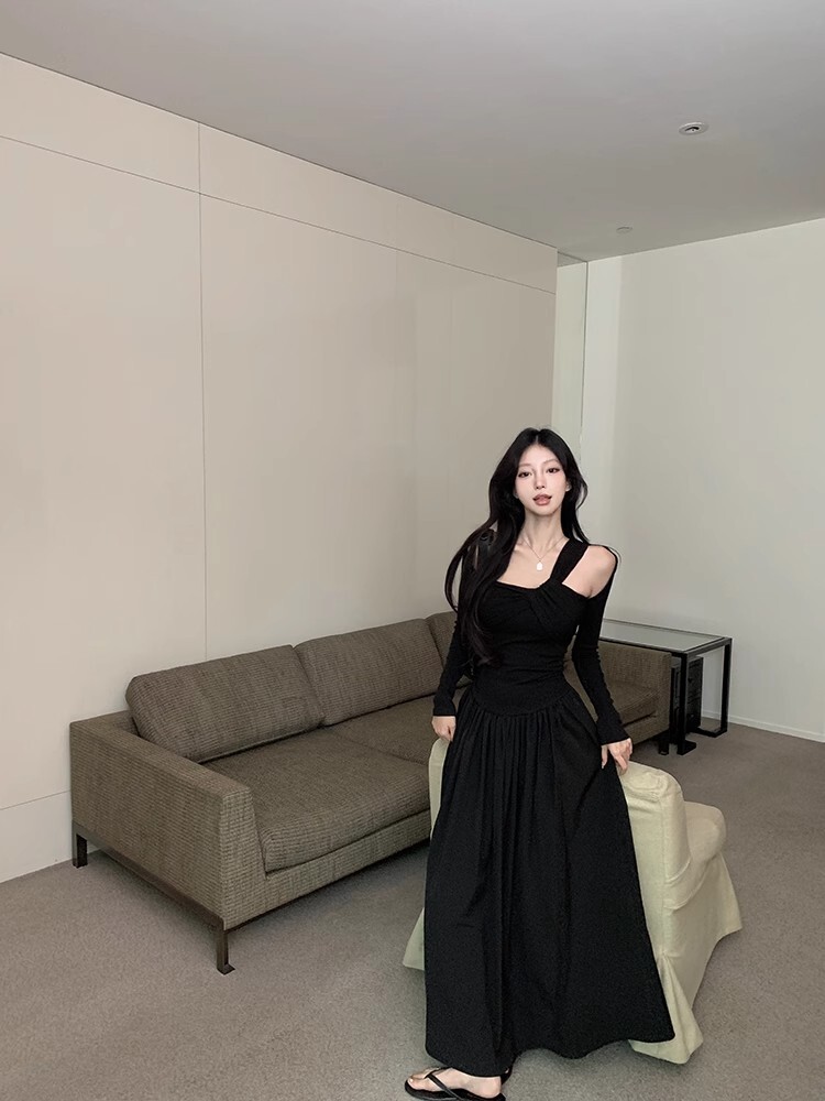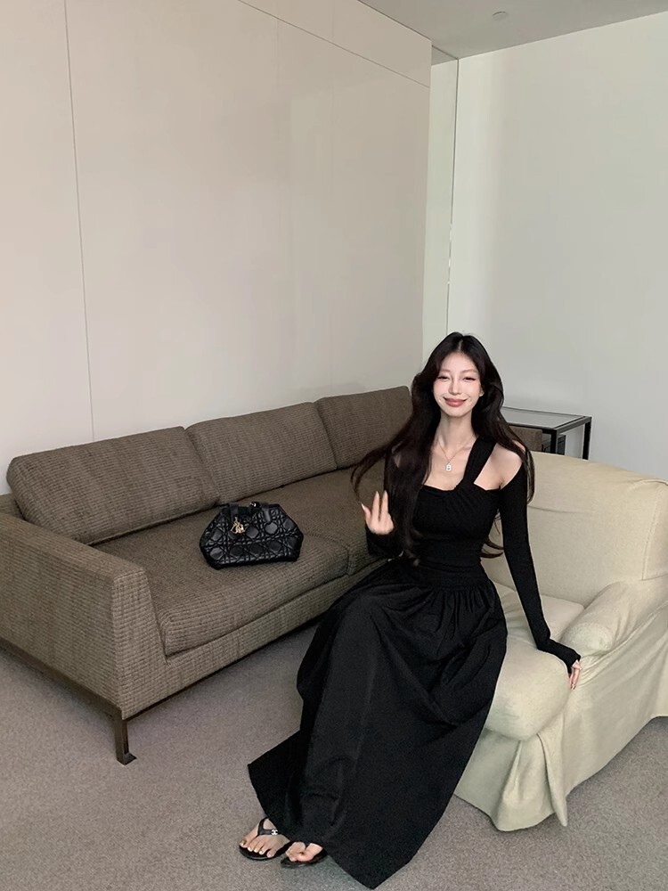 • Grey off-shoulder long-sleeved dress for women, new autumn/winter style, French chic, slim fit, waist-cinching, A-line long skirt