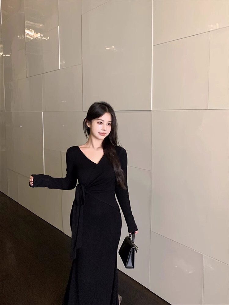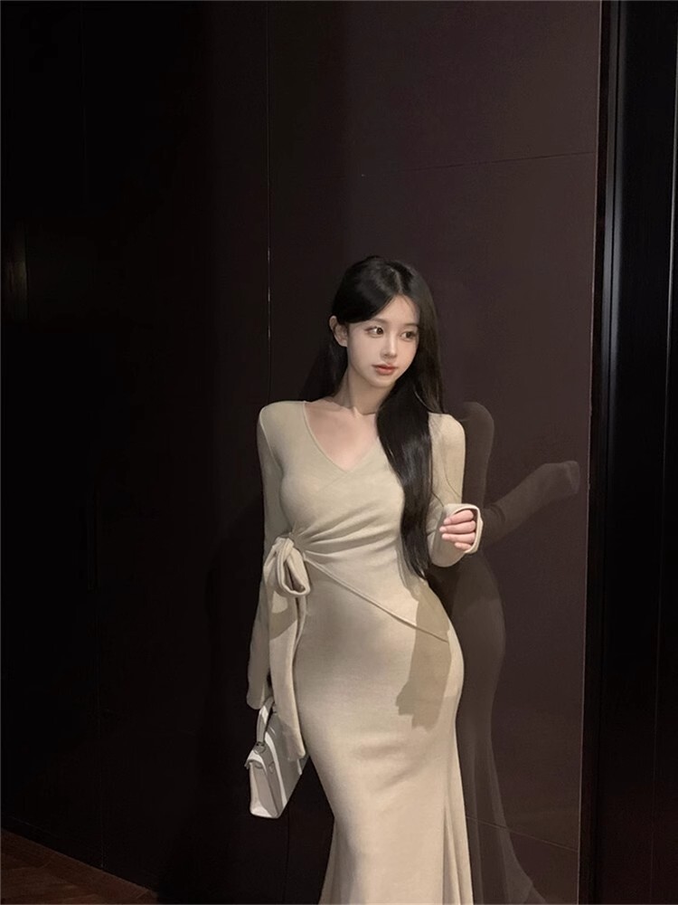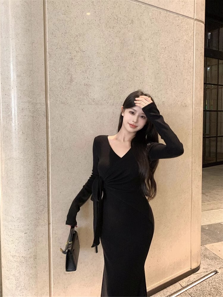 Pure and alluring sexy V-neck long-sleeved dress for autumn, French style lace-up fishtail skirt, high-end bodycon maxi skirt