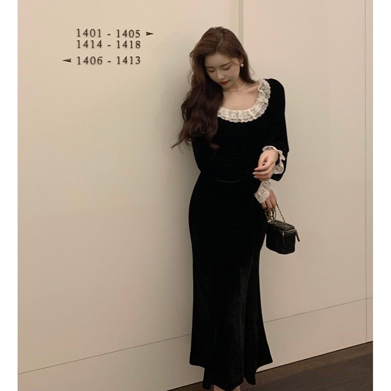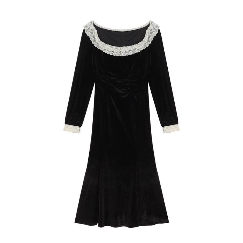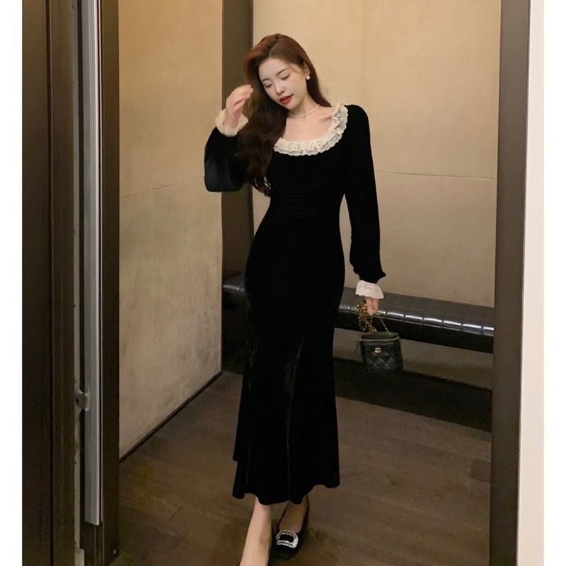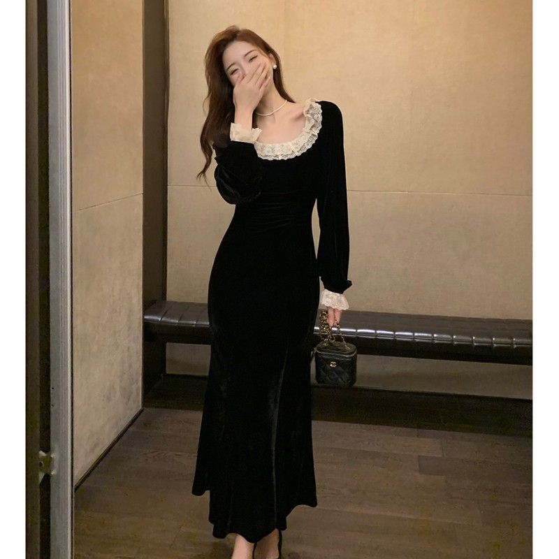 • French-style black velvet lace dress for women, autumn and winter, Hepburn style little black dress, slim fit, bodycon fishtail long skirt.