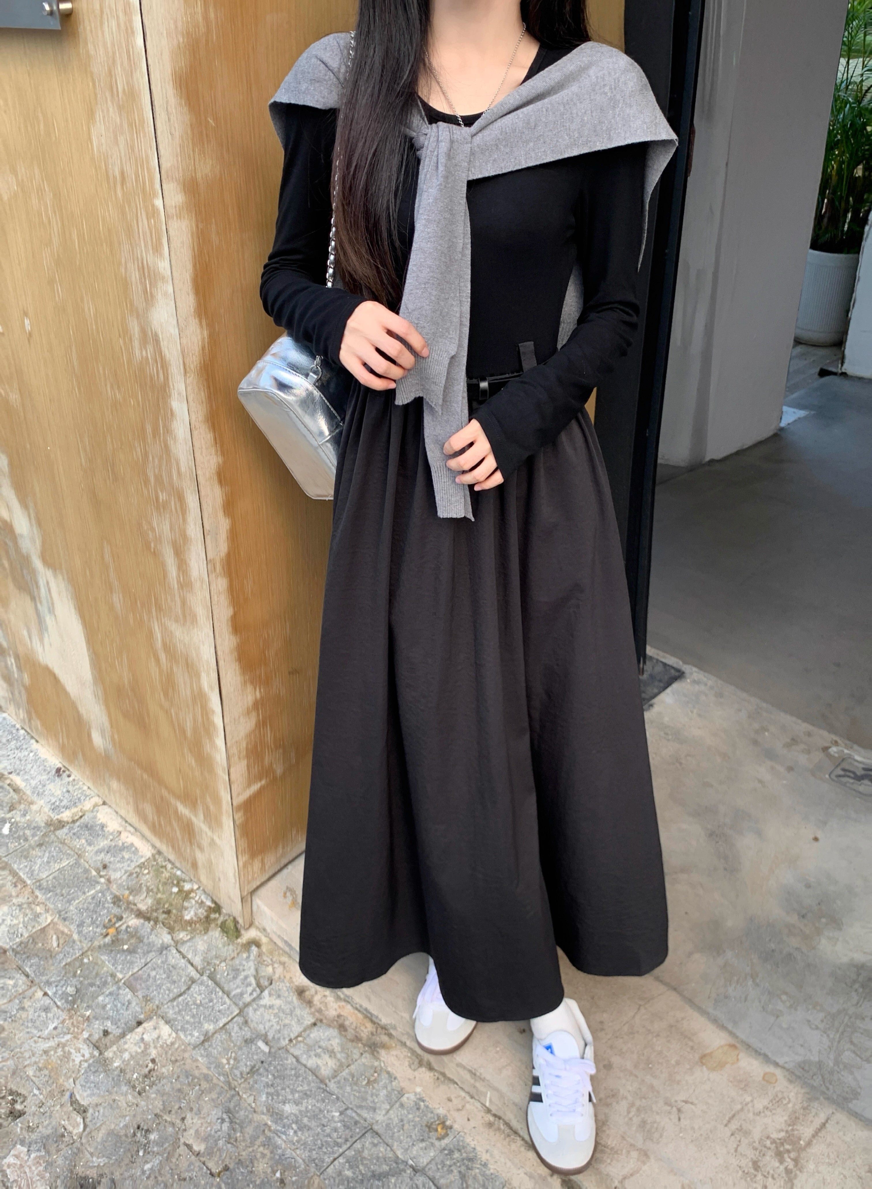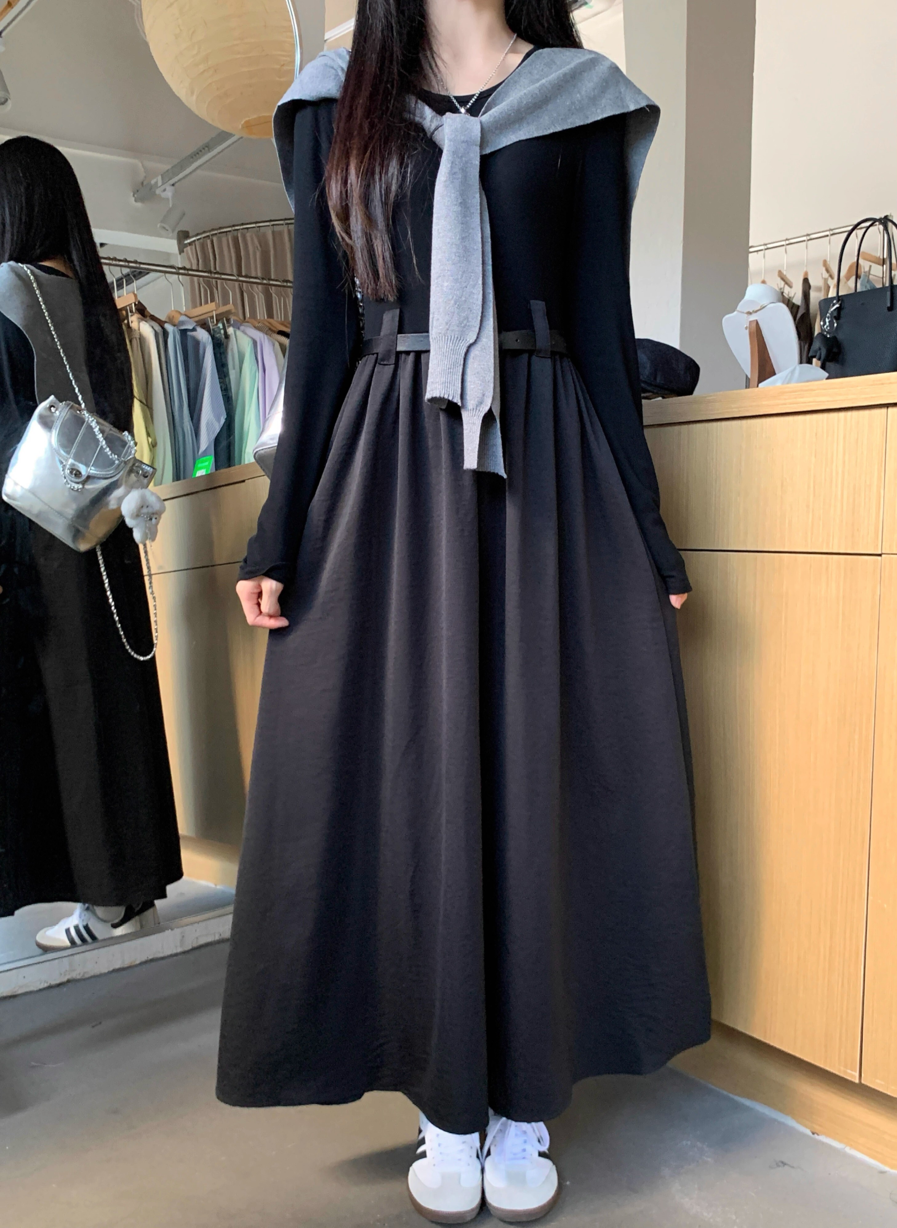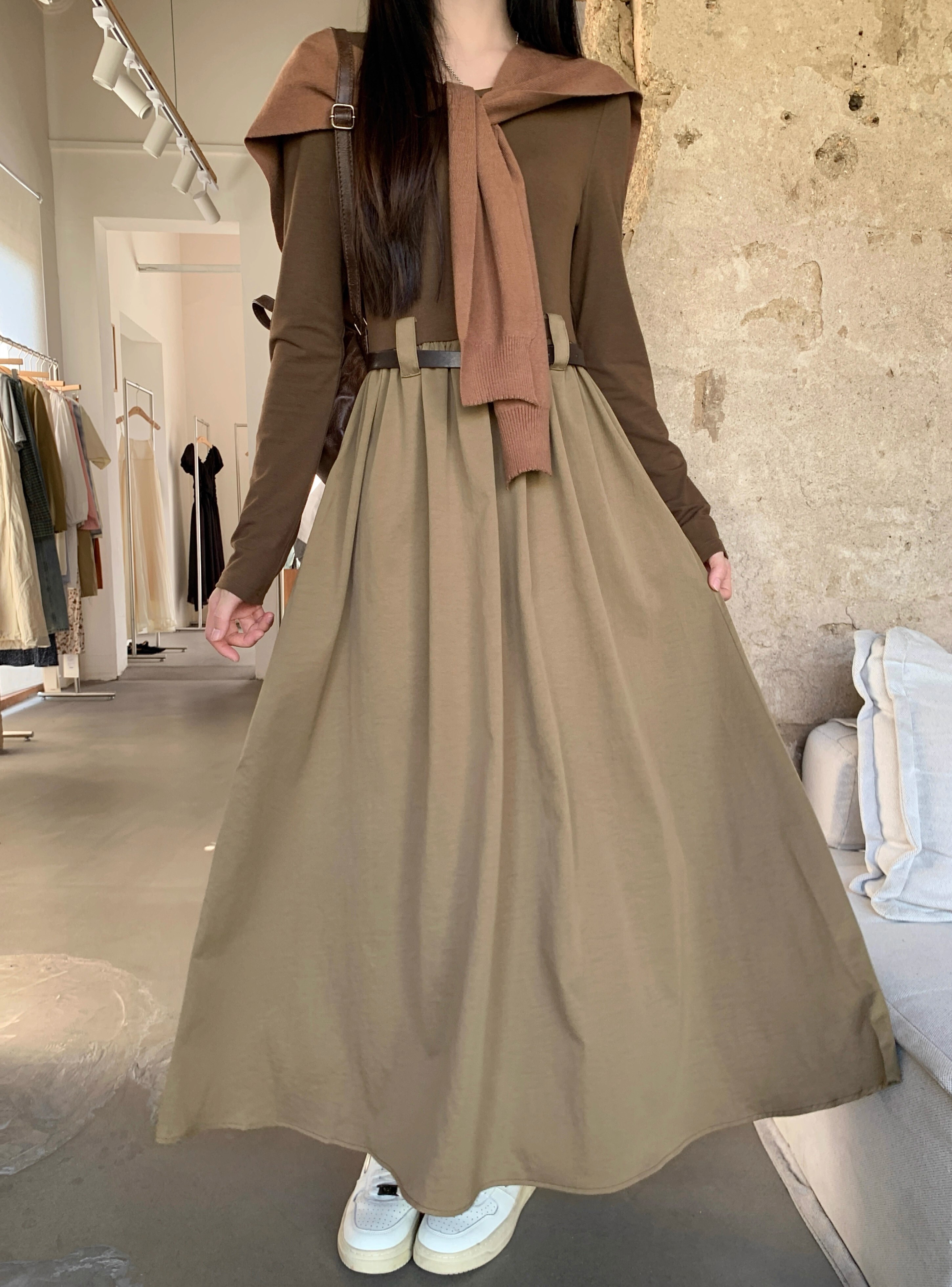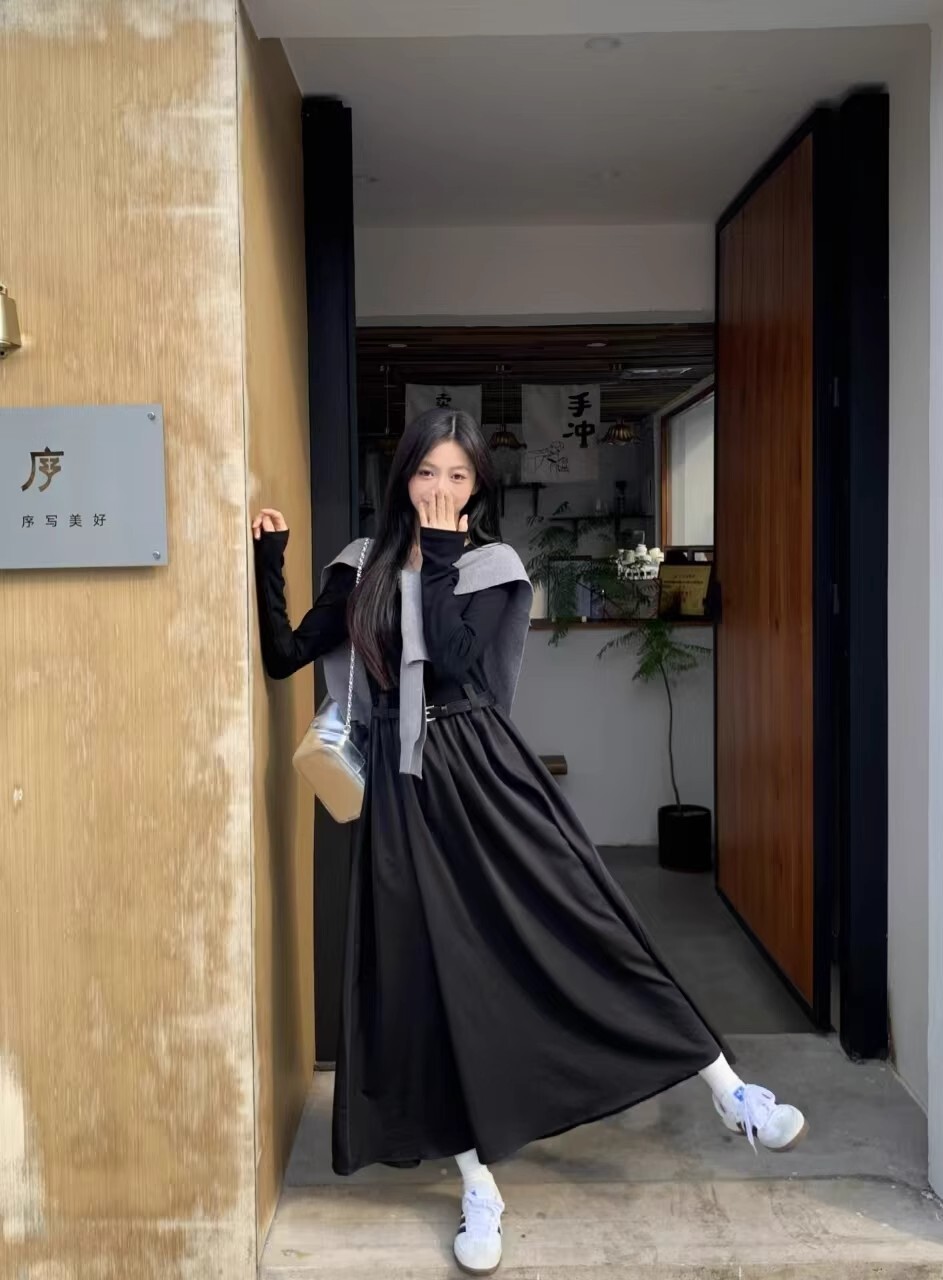 • Retro-style solid color round neck slimming long-sleeved dress for women, autumn design with long sleeves and A-line skirt with shawl.