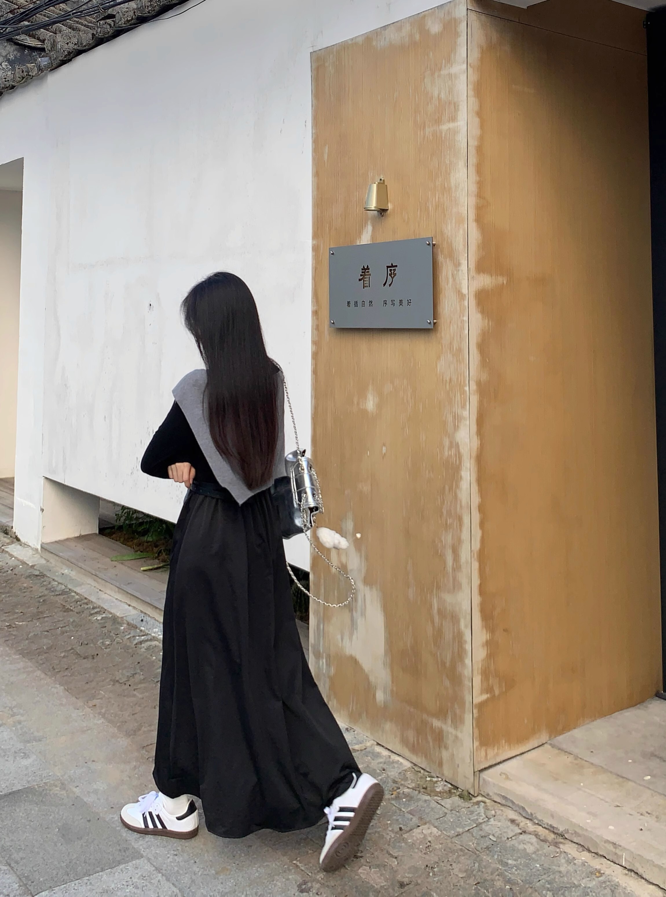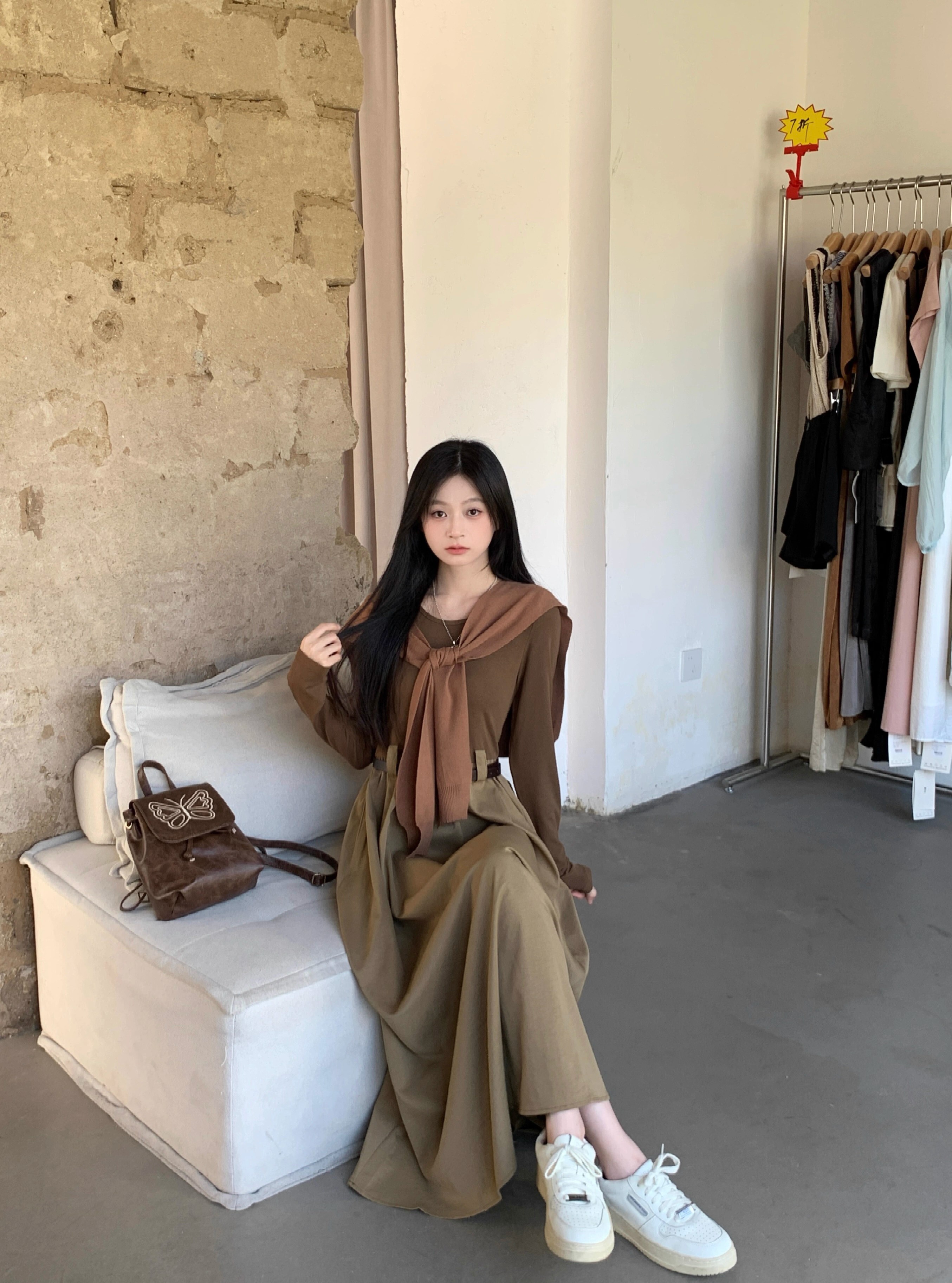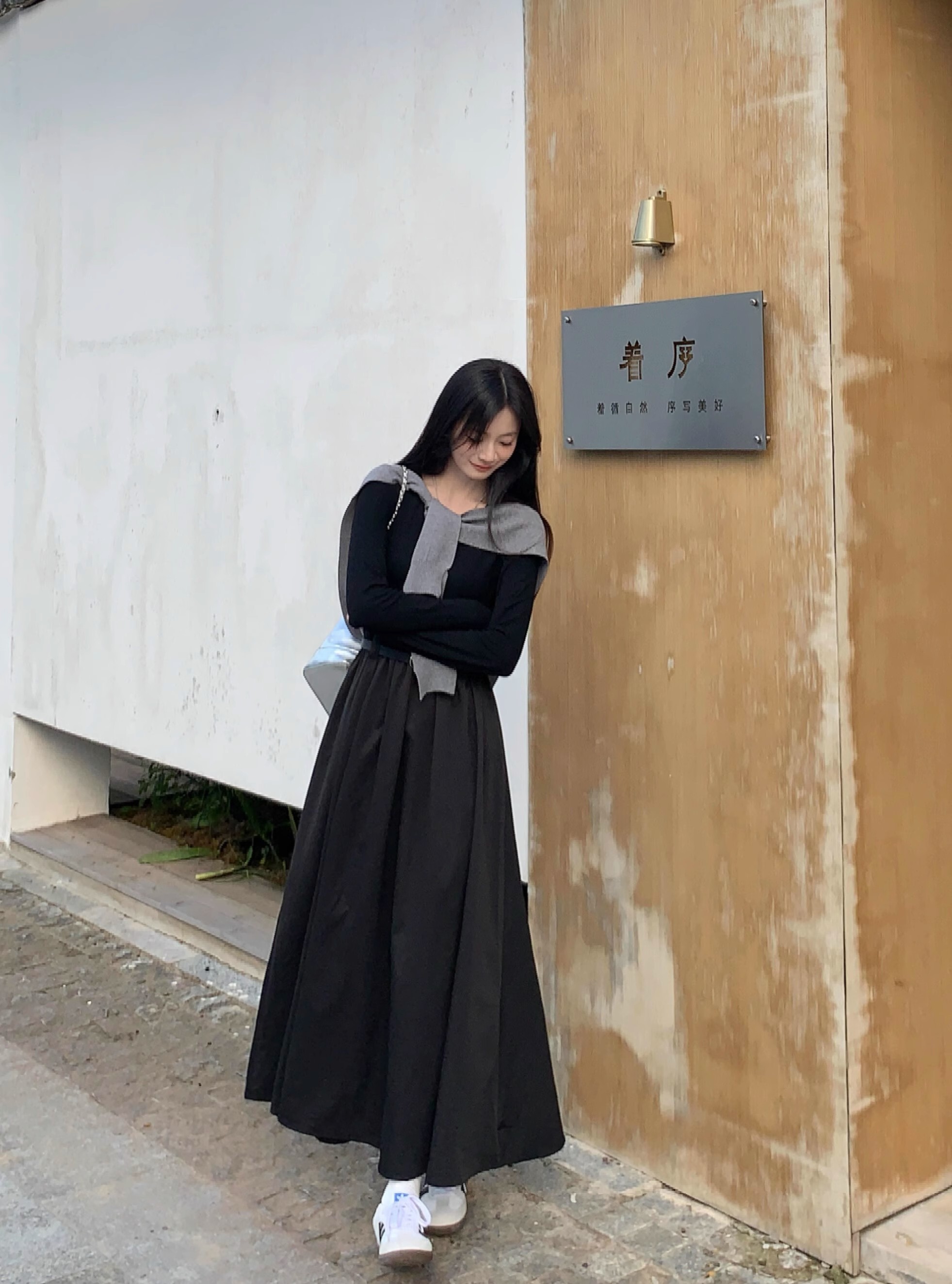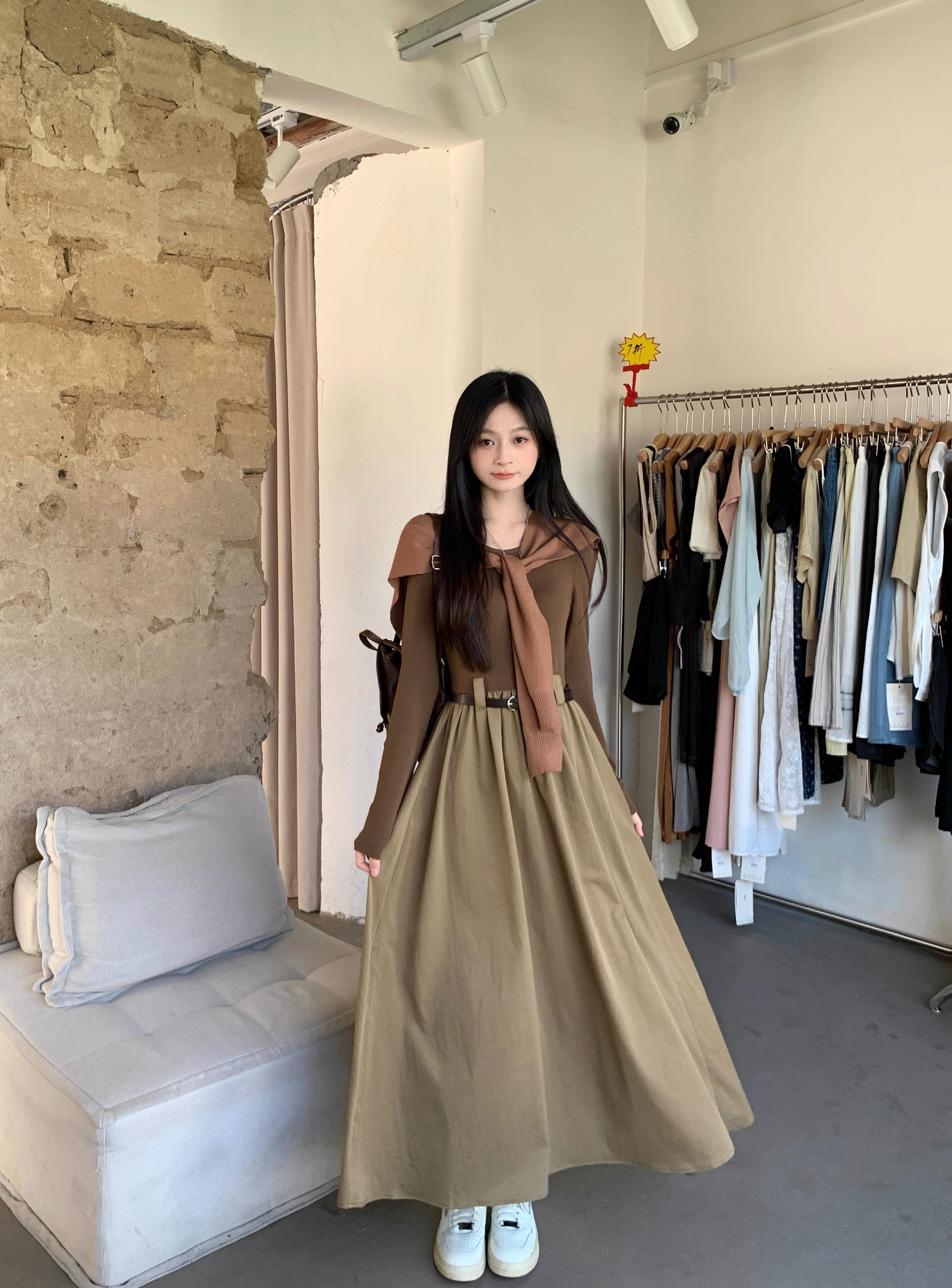 • Retro-style solid color round neck slimming long-sleeved dress for women, autumn design with long sleeves and A-line skirt with shawl.