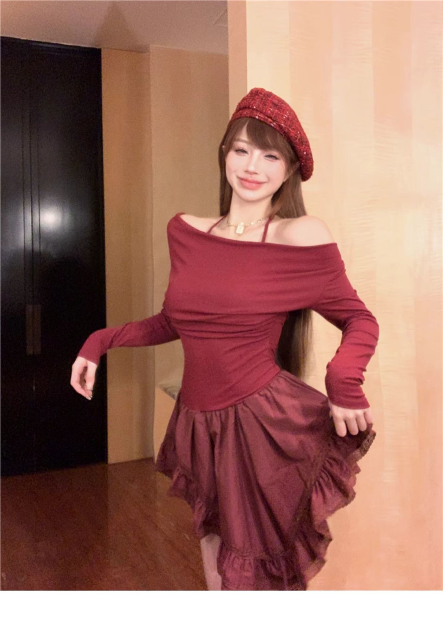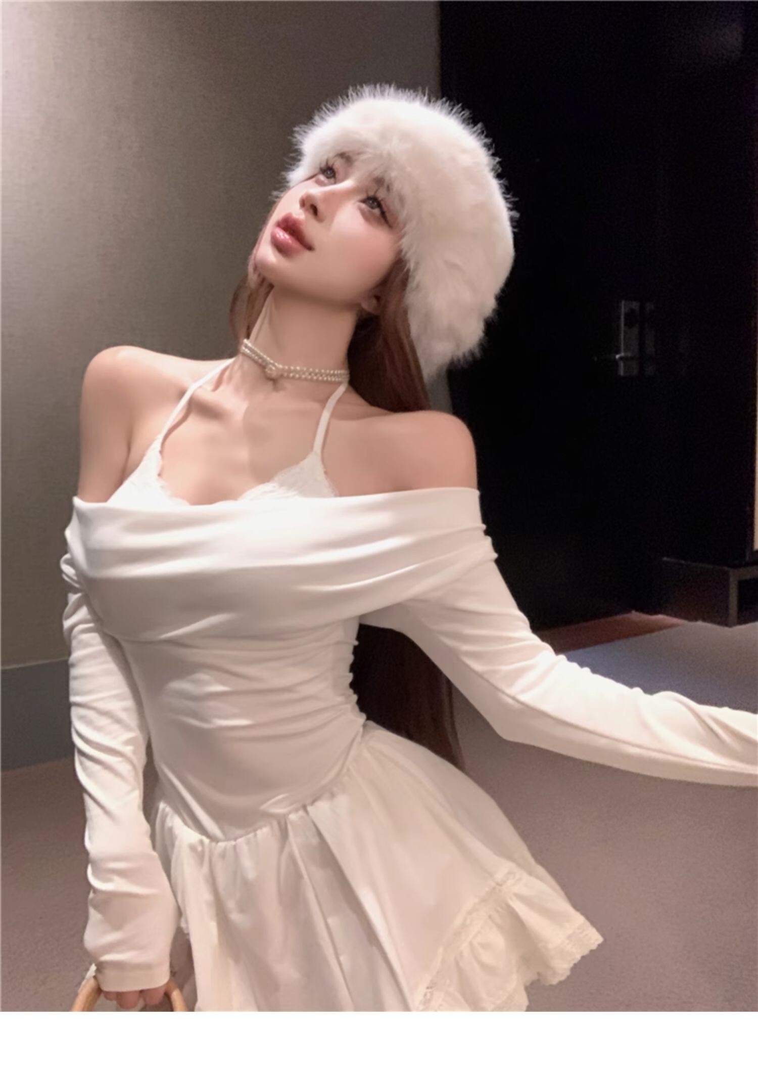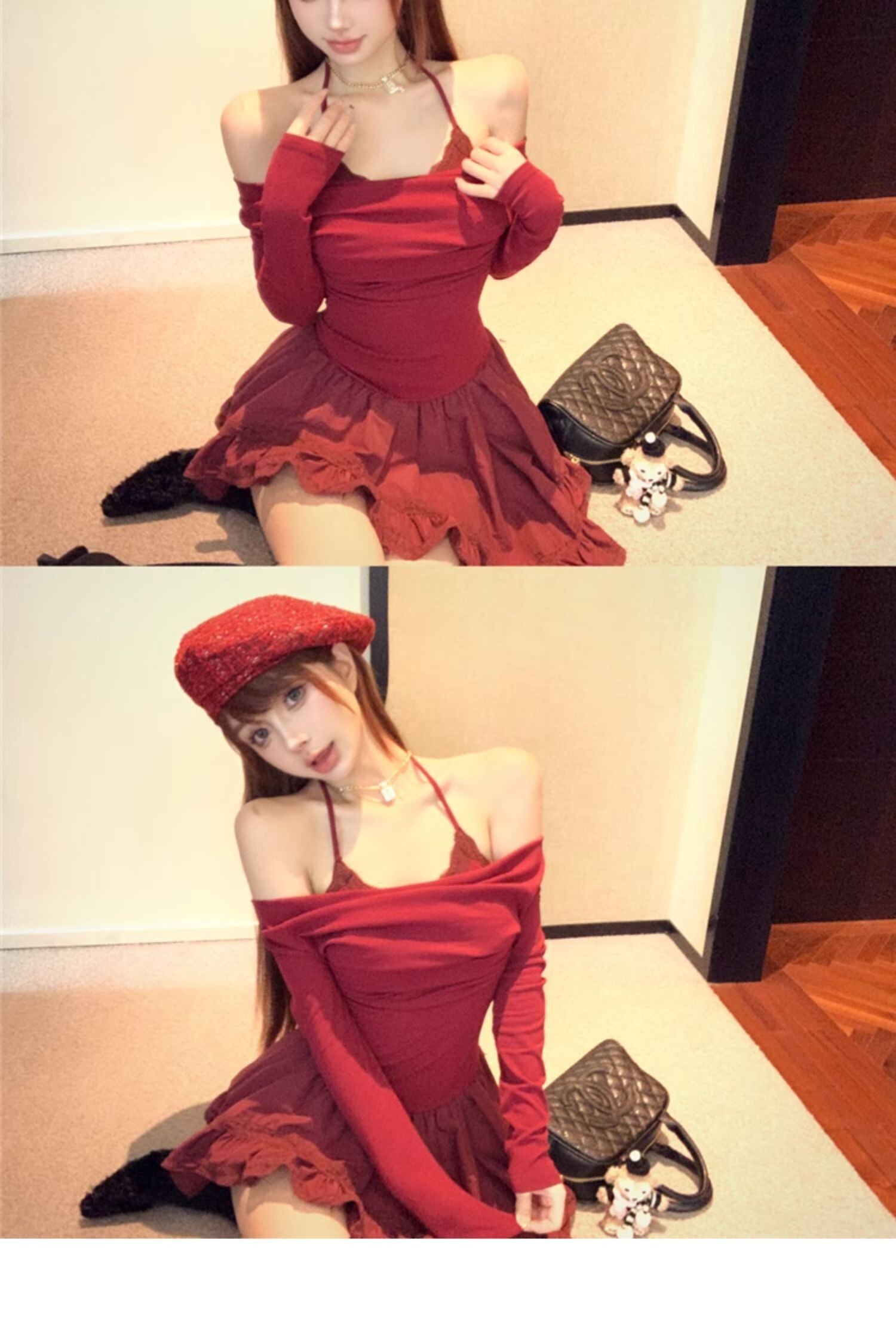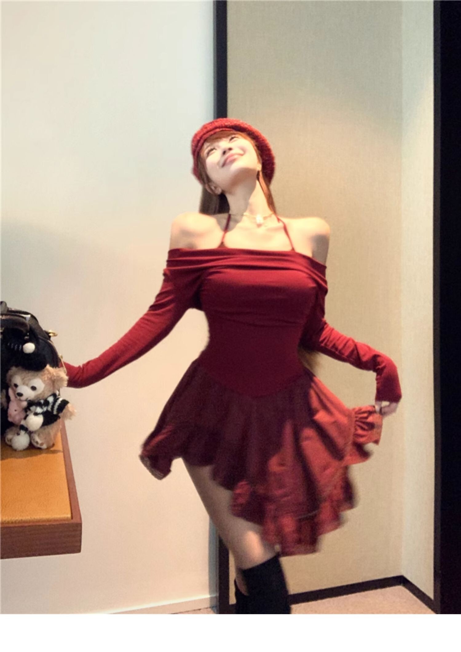 • Sexy off-shoulder halter neck halter long-sleeved dress for spring and autumn, revealing back and fitted waist, irregular skirt.