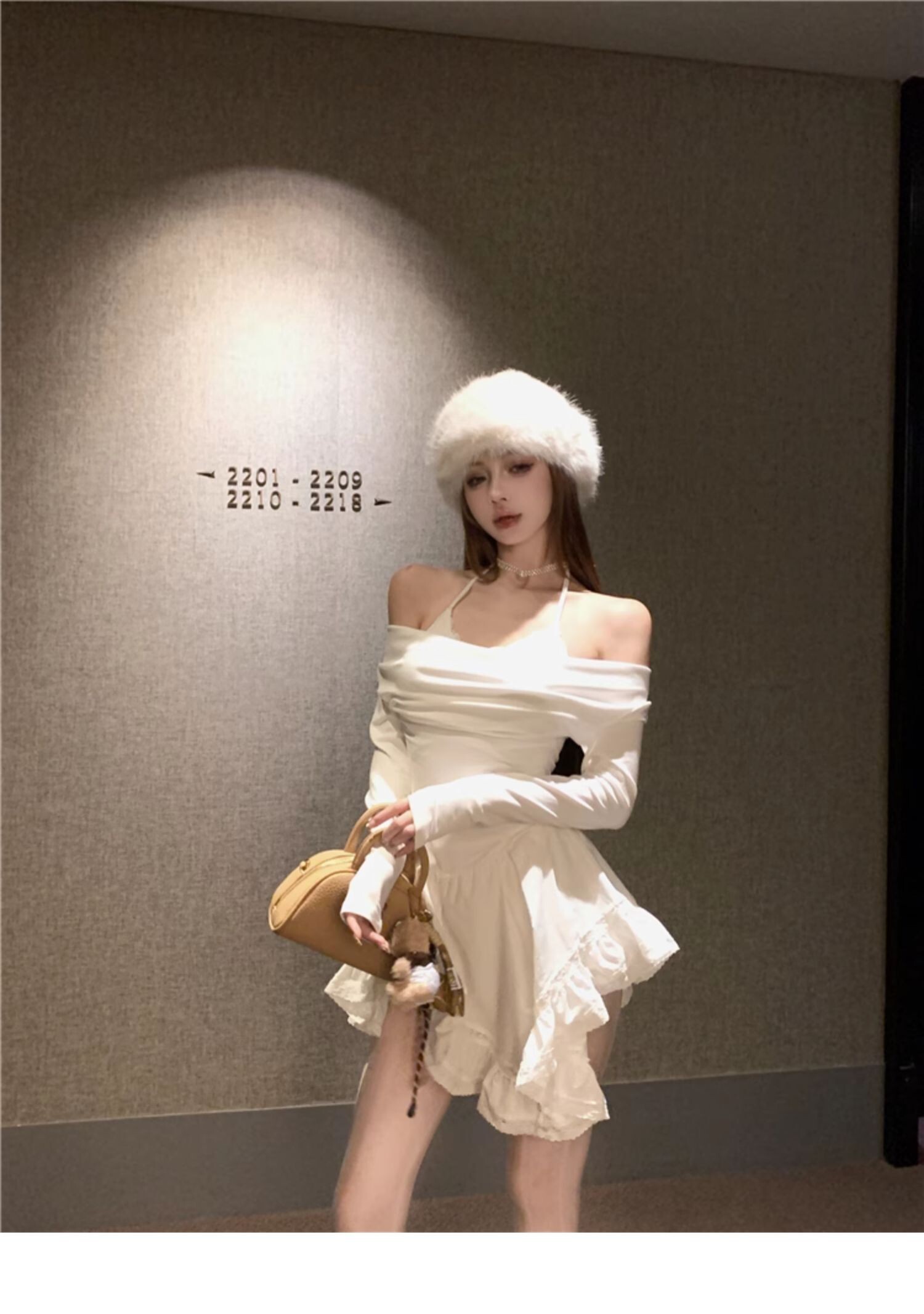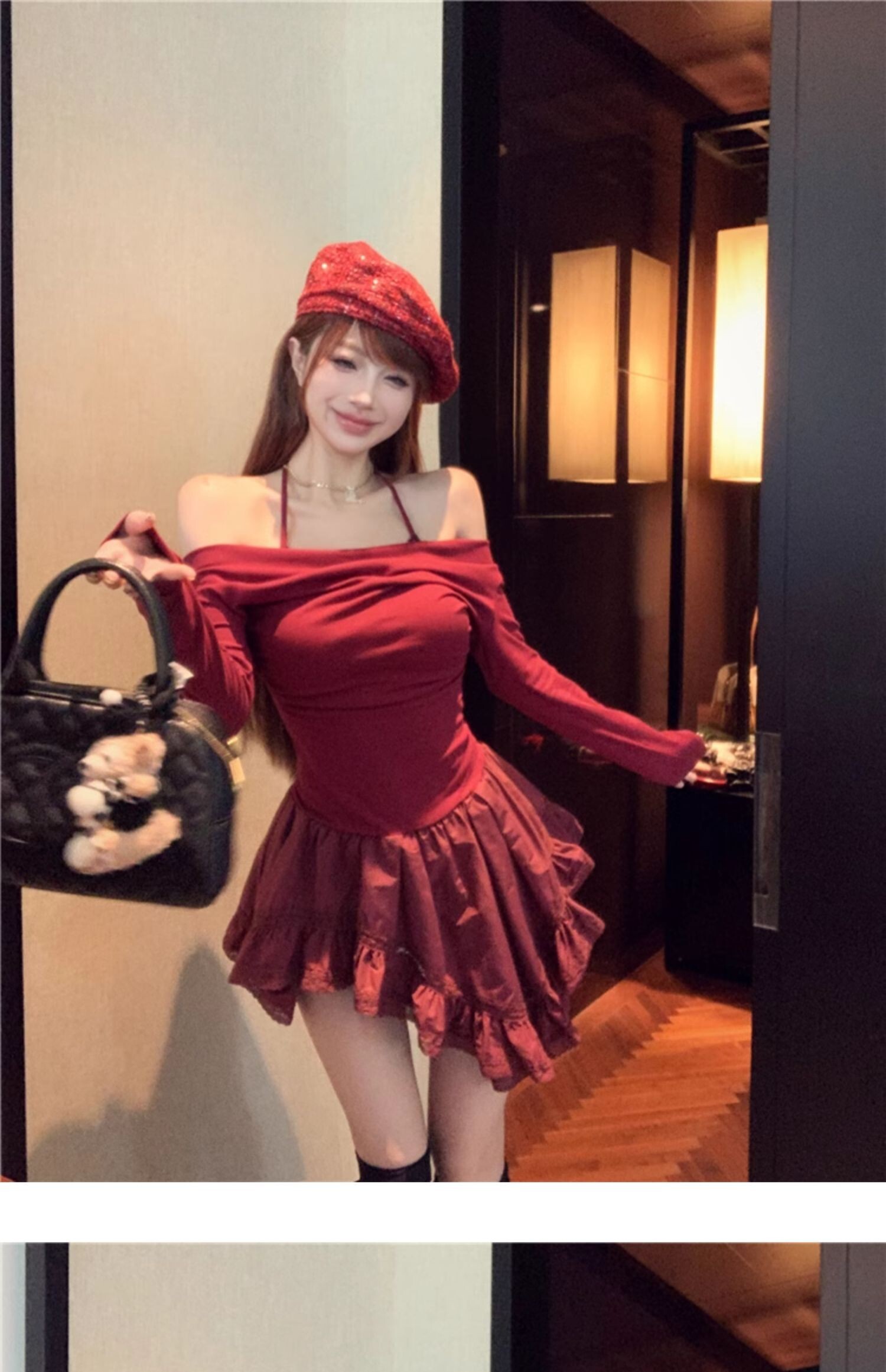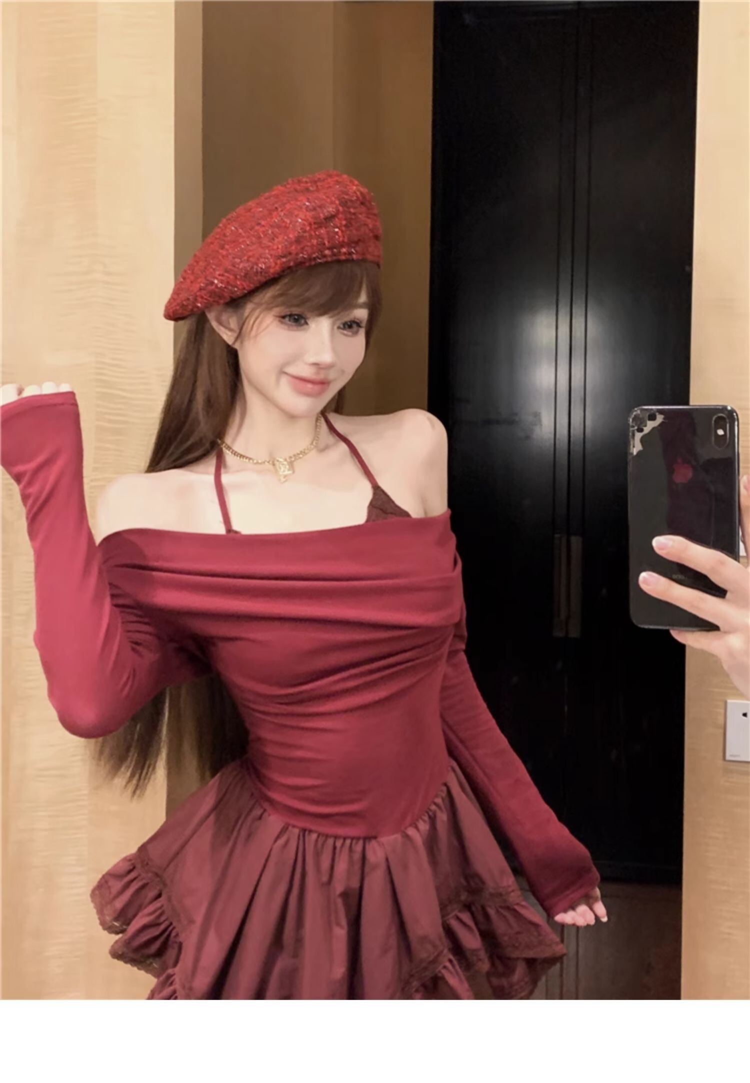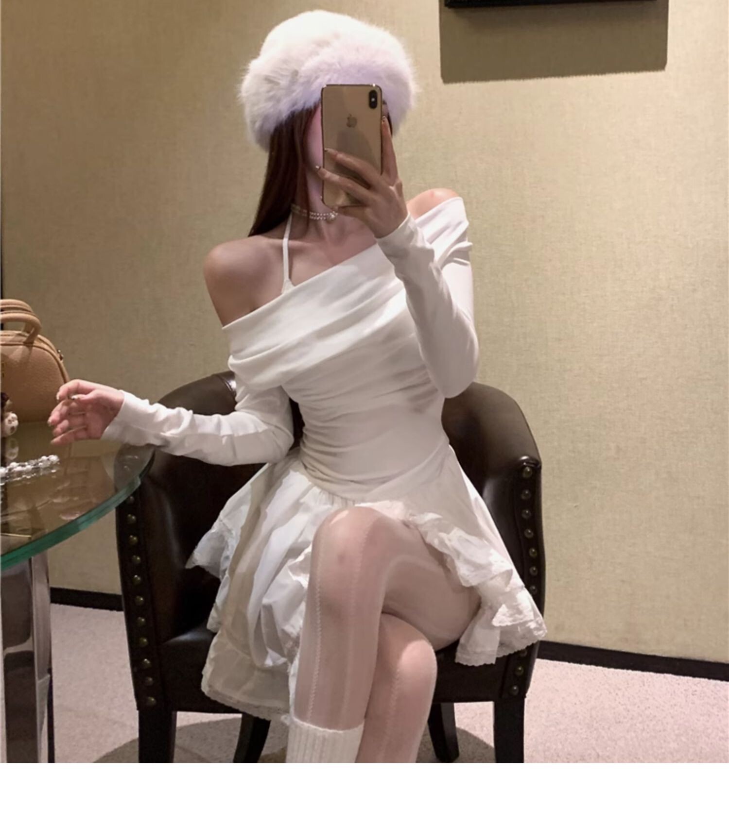 • Sexy off-shoulder halter neck halter long-sleeved dress for spring and autumn, revealing back and fitted waist, irregular skirt.