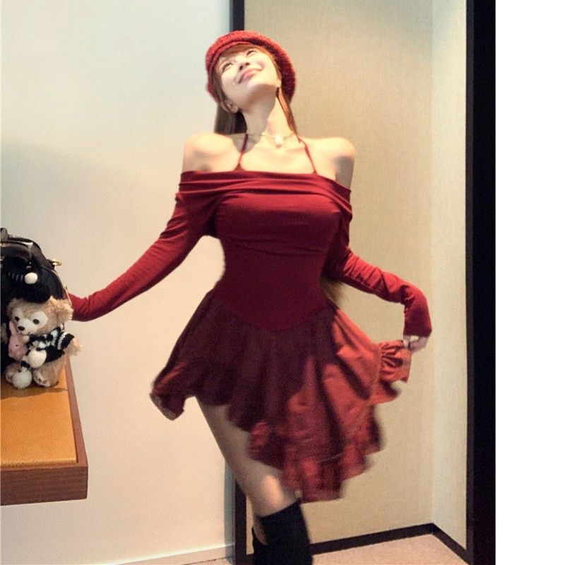 Sexy off-shoulder halter neck halter long-sleeved dress for spring and autumn, revealing back and fitted waist, irregular skirt.