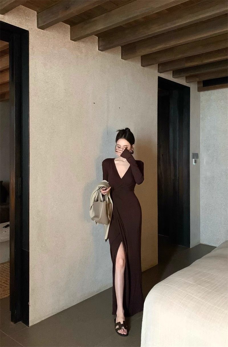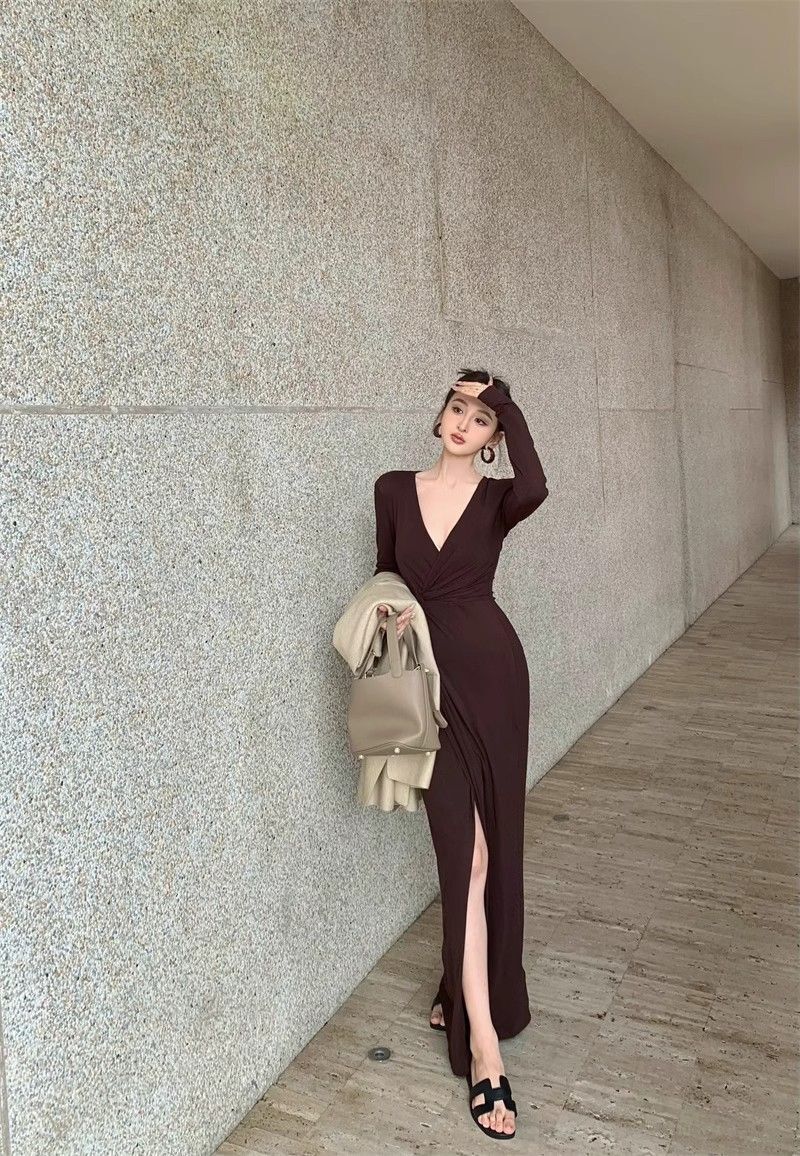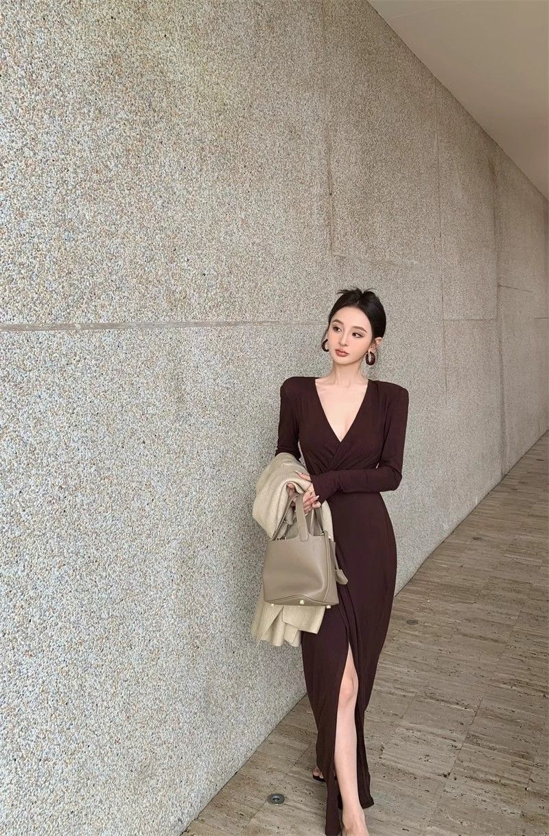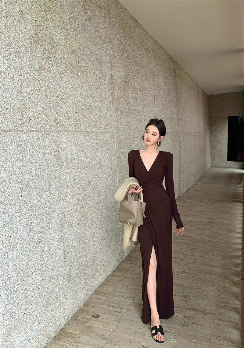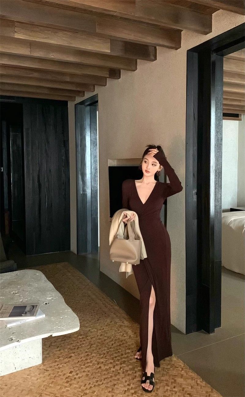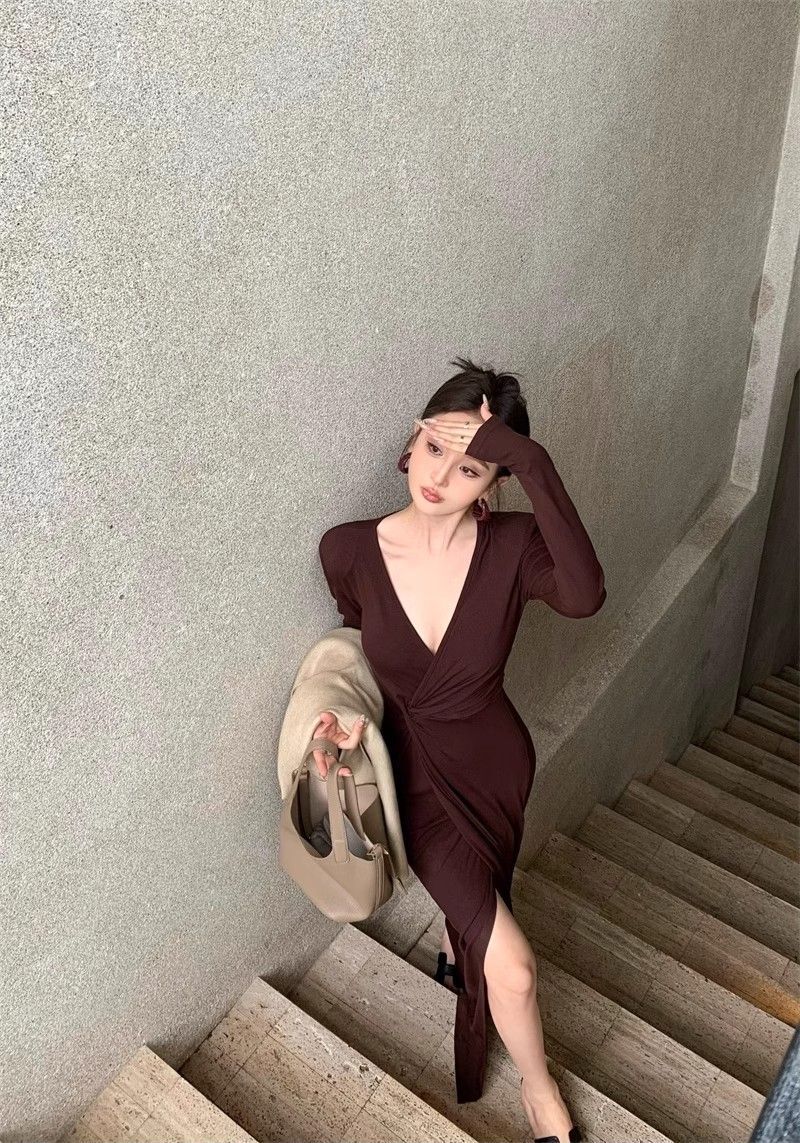 French-style alluring V-neck knotted long-sleeved dress, slim-fitting, slit maxi skirt, elegant, waist-cinching, bodycon dress.