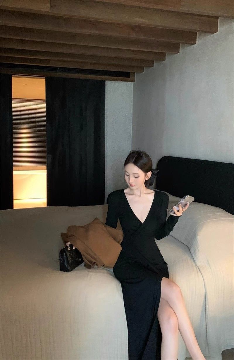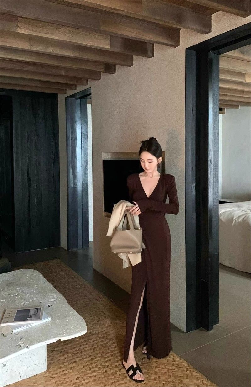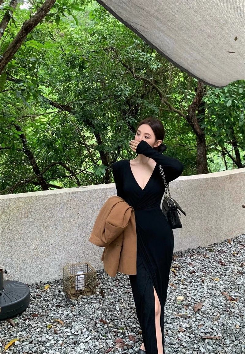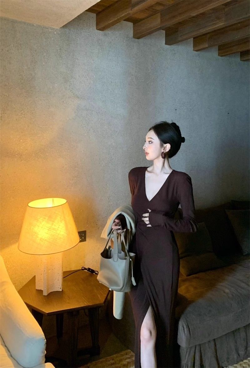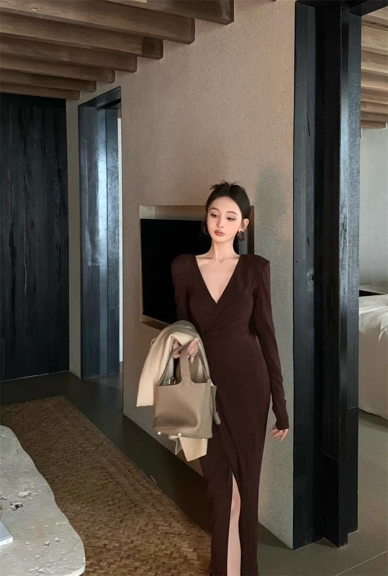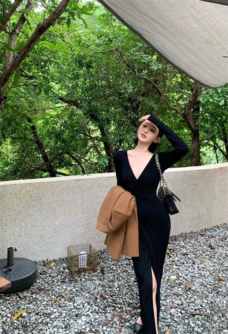 French-style alluring V-neck knotted long-sleeved dress, slim-fitting, slit maxi skirt, elegant, waist-cinching, bodycon dress.