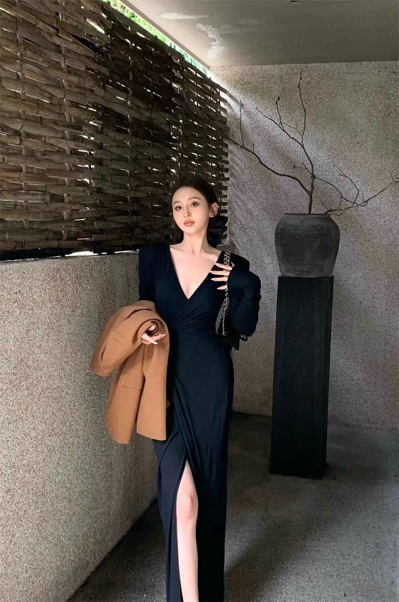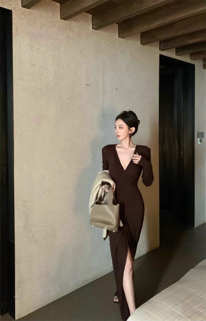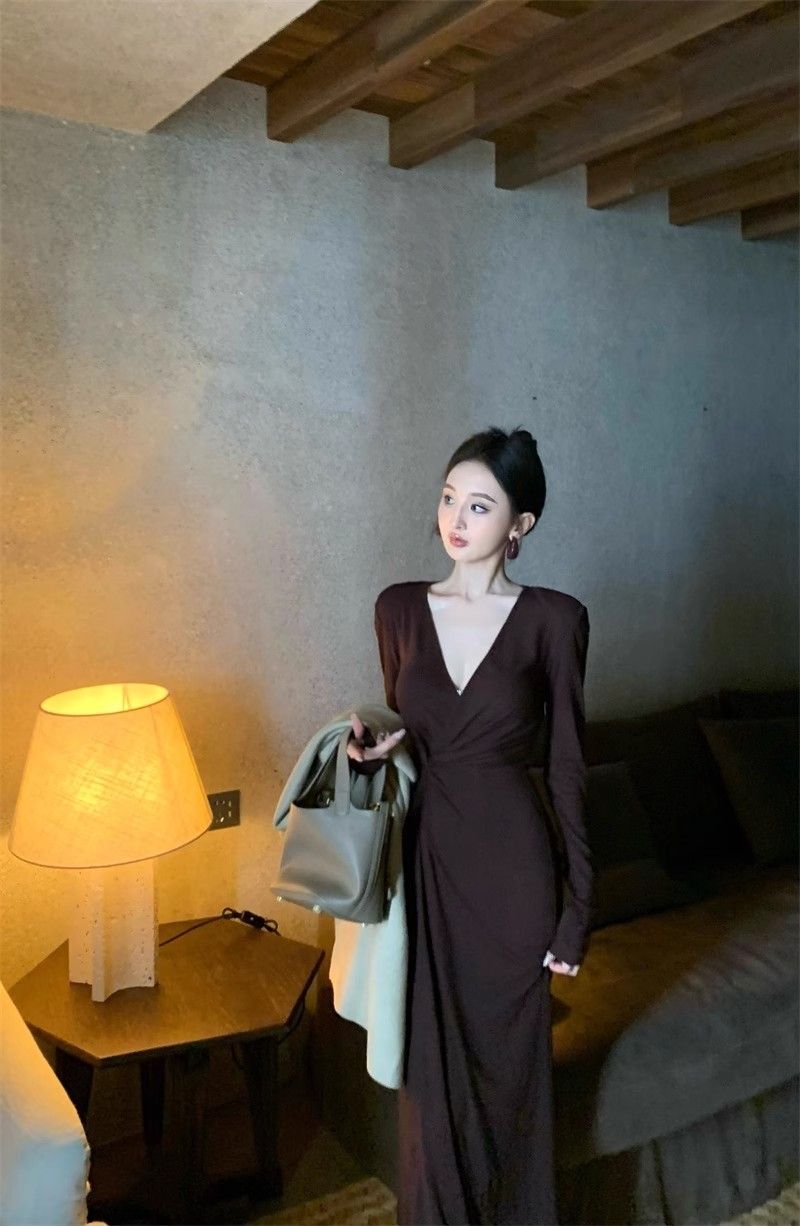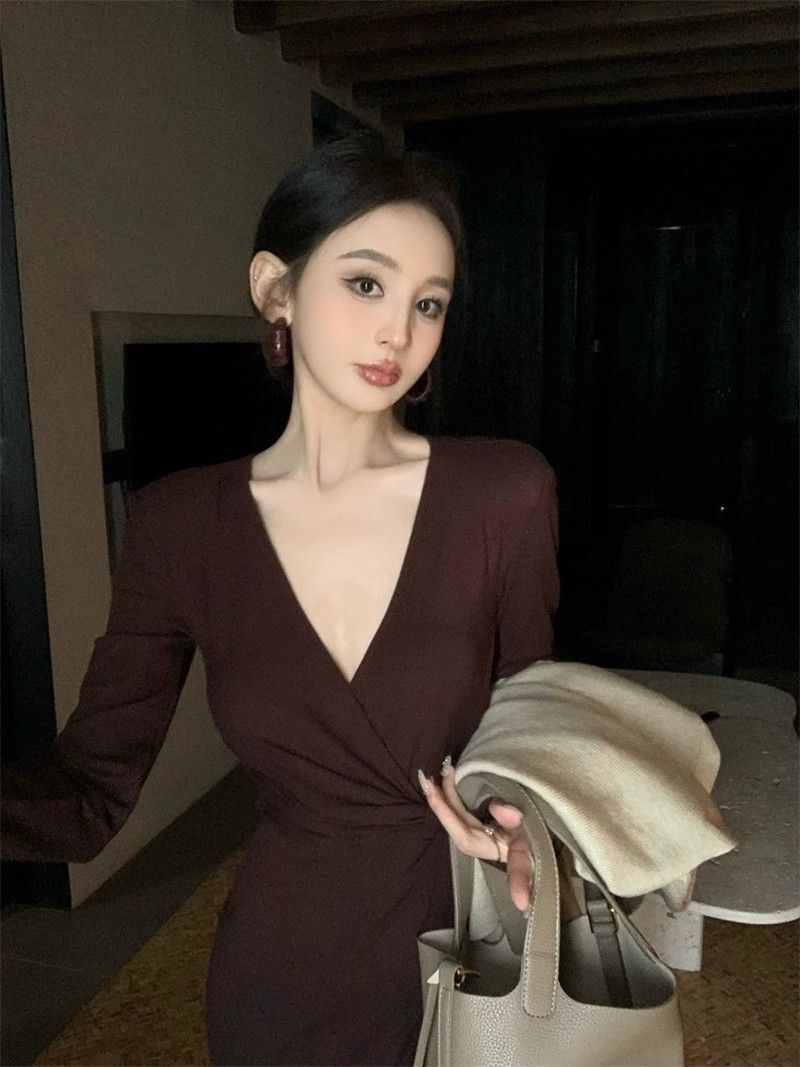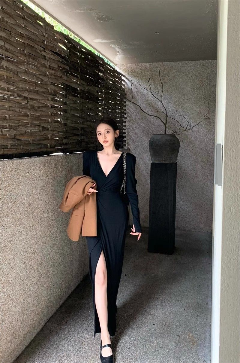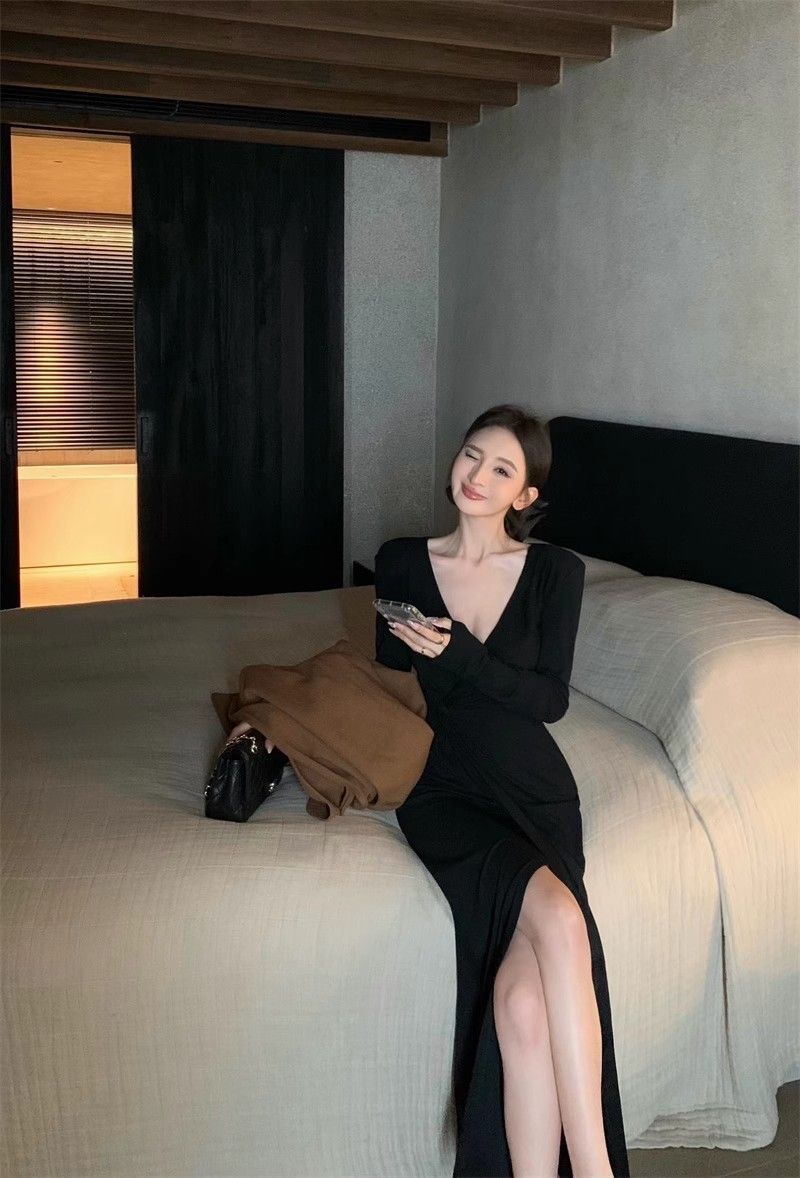 French-style alluring V-neck knotted long-sleeved dress, slim-fitting, slit maxi skirt, elegant, waist-cinching, bodycon dress.