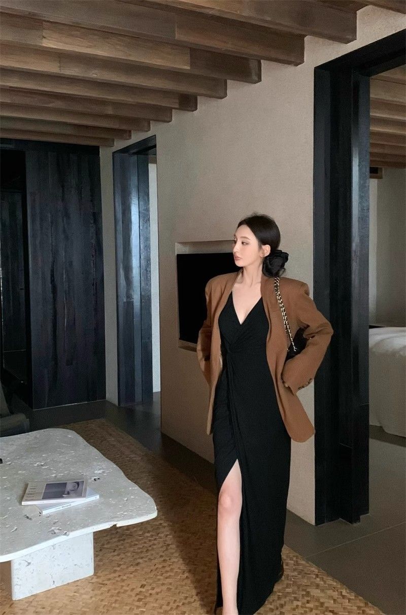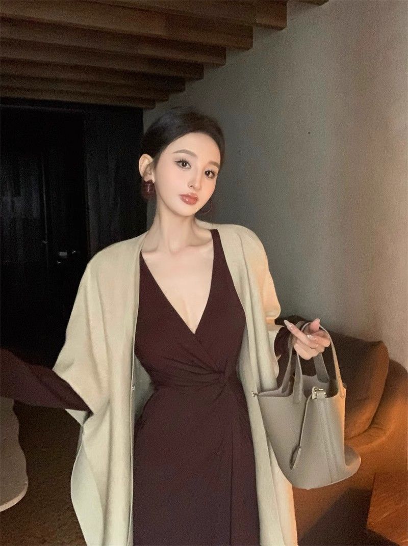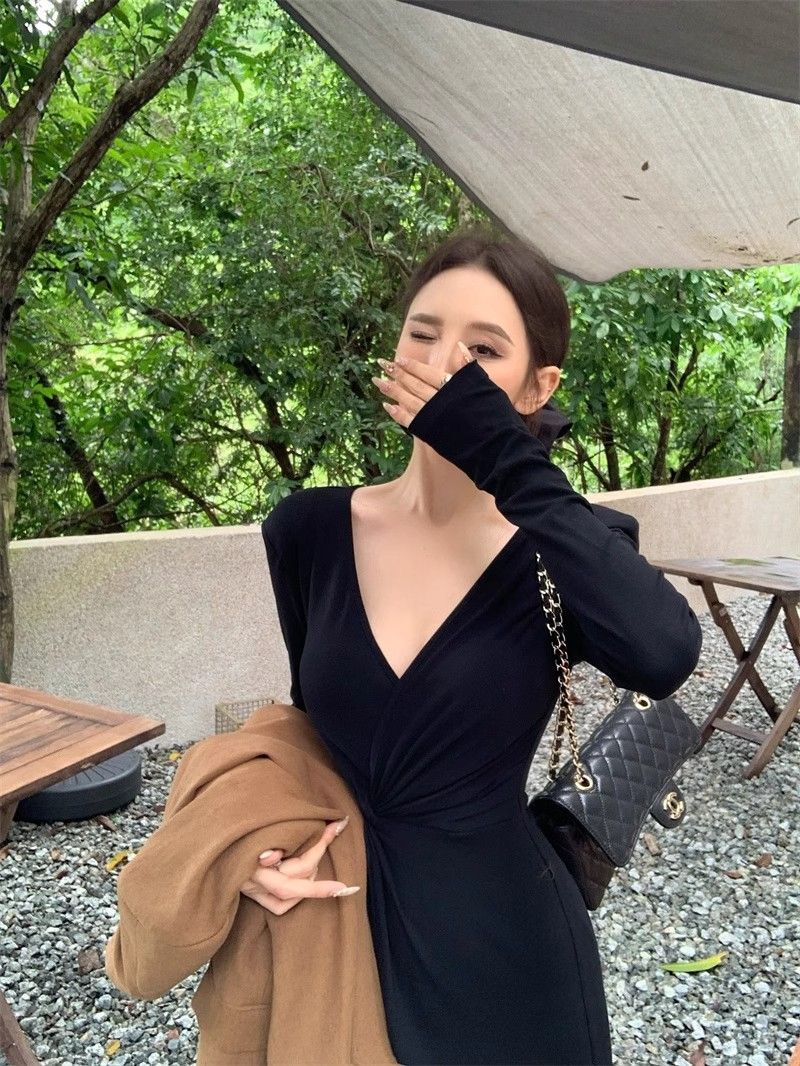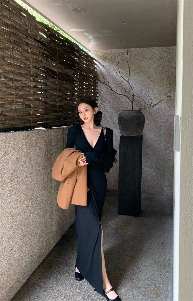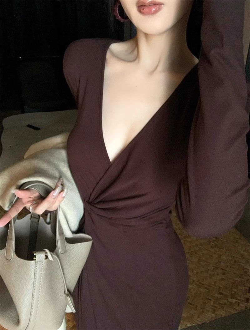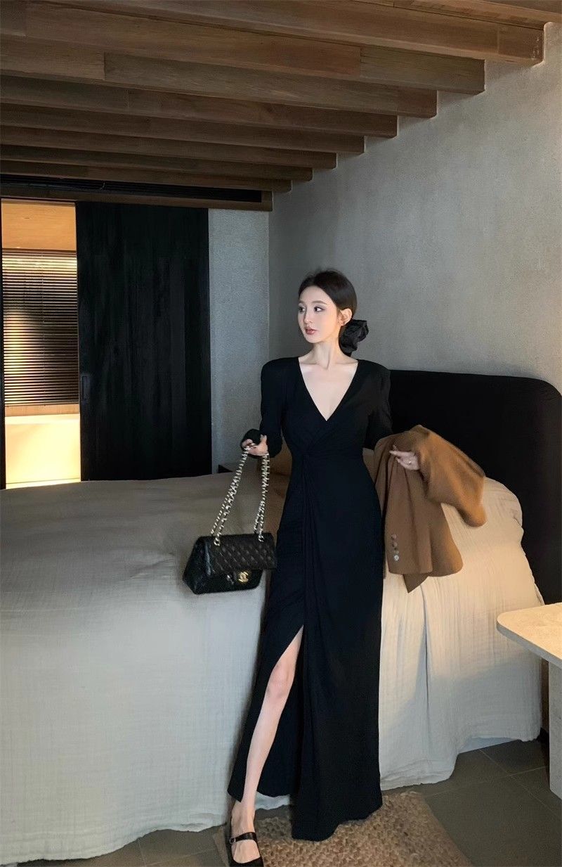 French-style alluring V-neck knotted long-sleeved dress, slim-fitting, slit maxi skirt, elegant, waist-cinching, bodycon dress.