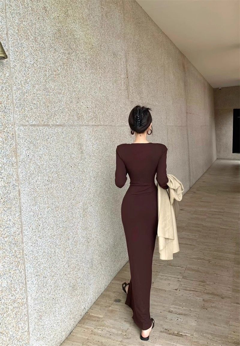 • French-style alluring V-neck knotted long-sleeved dress, slim-fitting, slit maxi skirt, elegant, waist-cinching, bodycon dress.