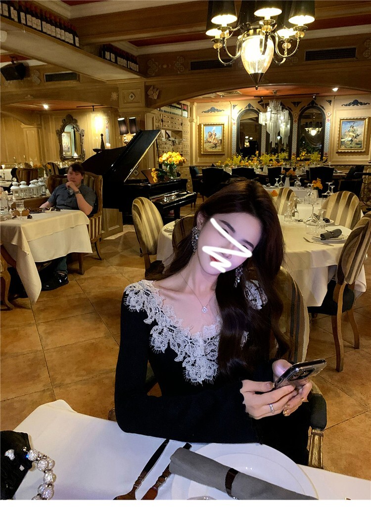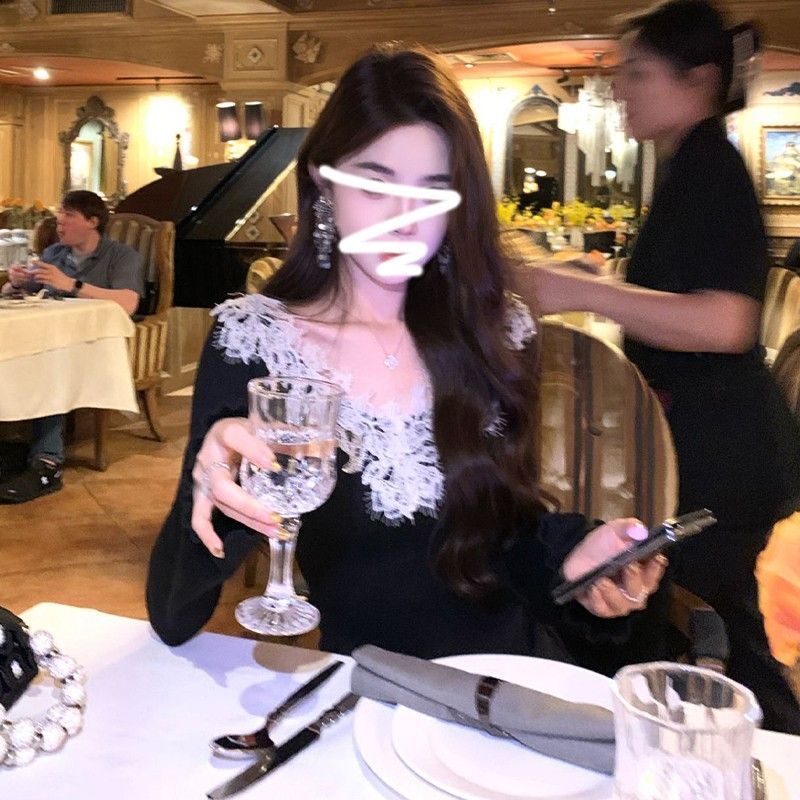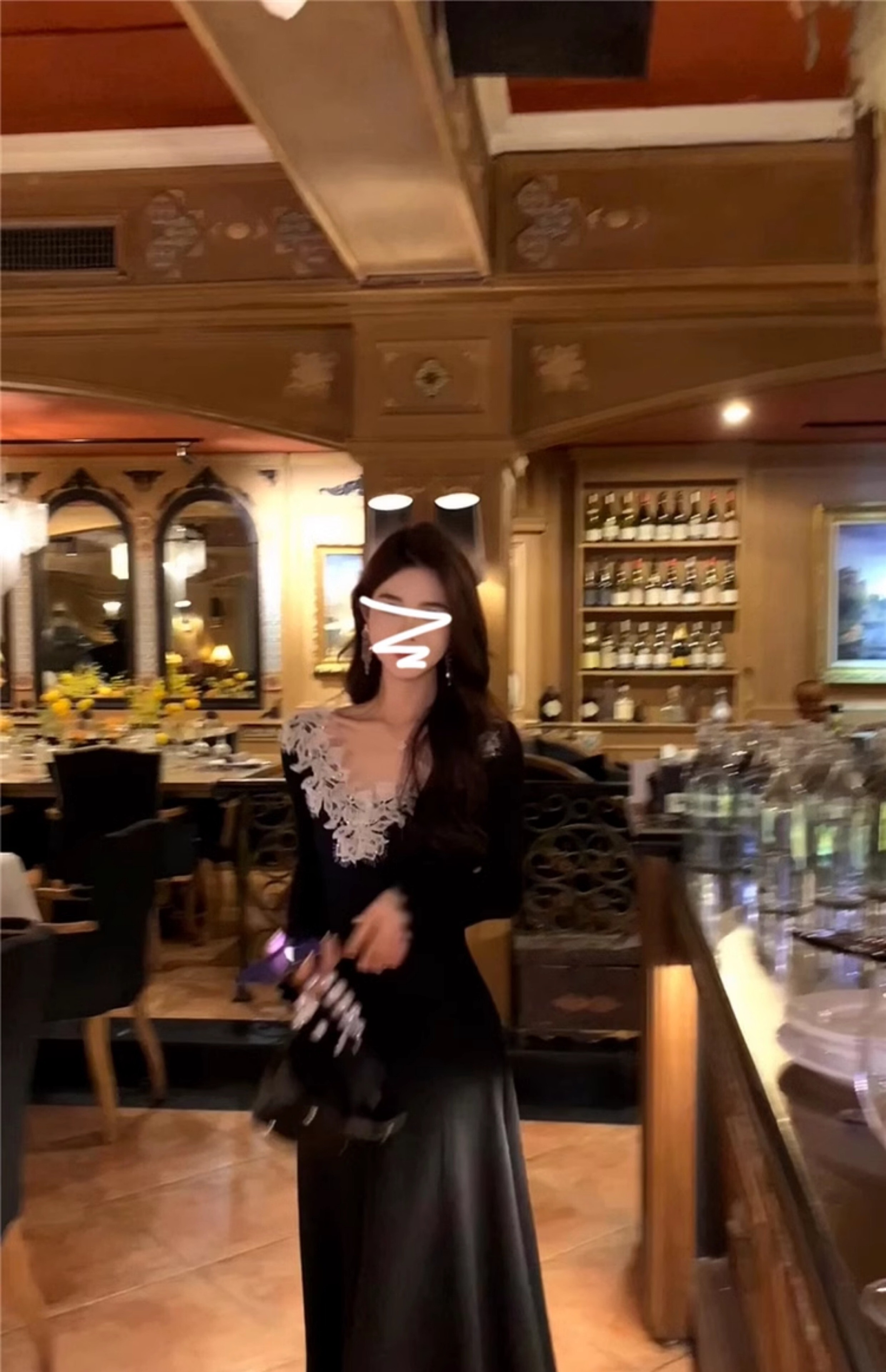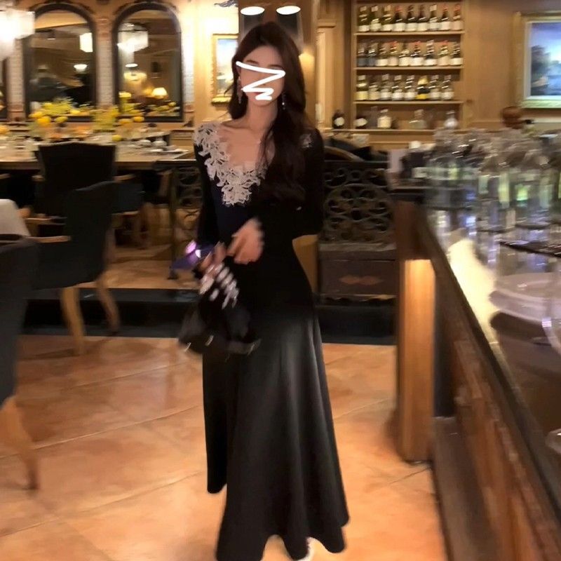 • French Chanel-inspired Hepburn-style black V-neck dress for women, new autumn/winter 2024 style, sophisticated inner layer.