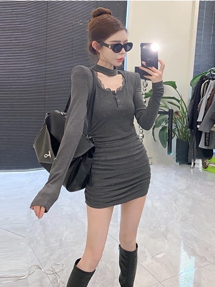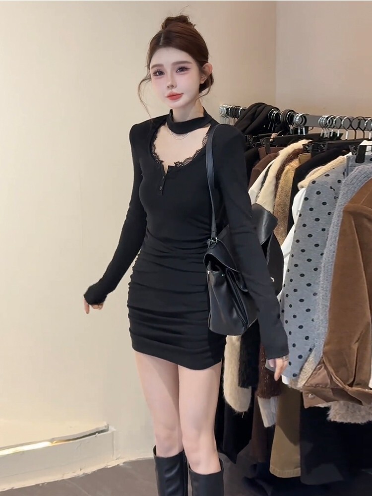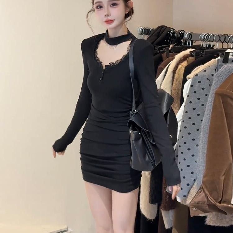 Spicy halter neck lace collar dress for women, Korean style, pure and sexy design, elegant, slimming, pleated bodycon skirt