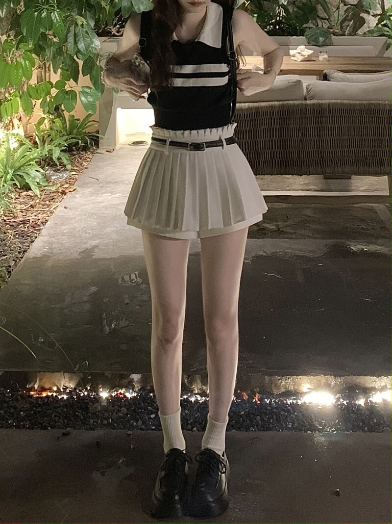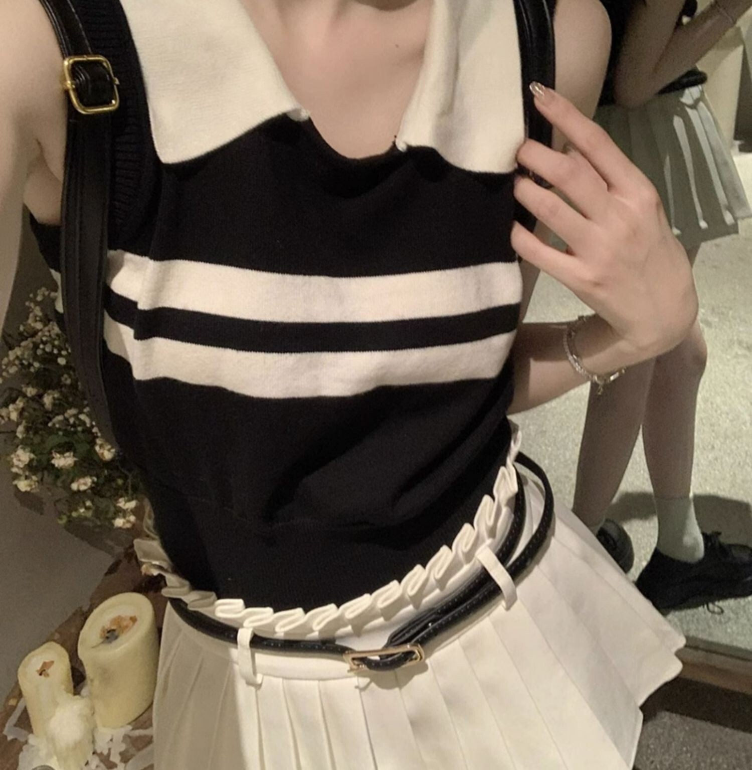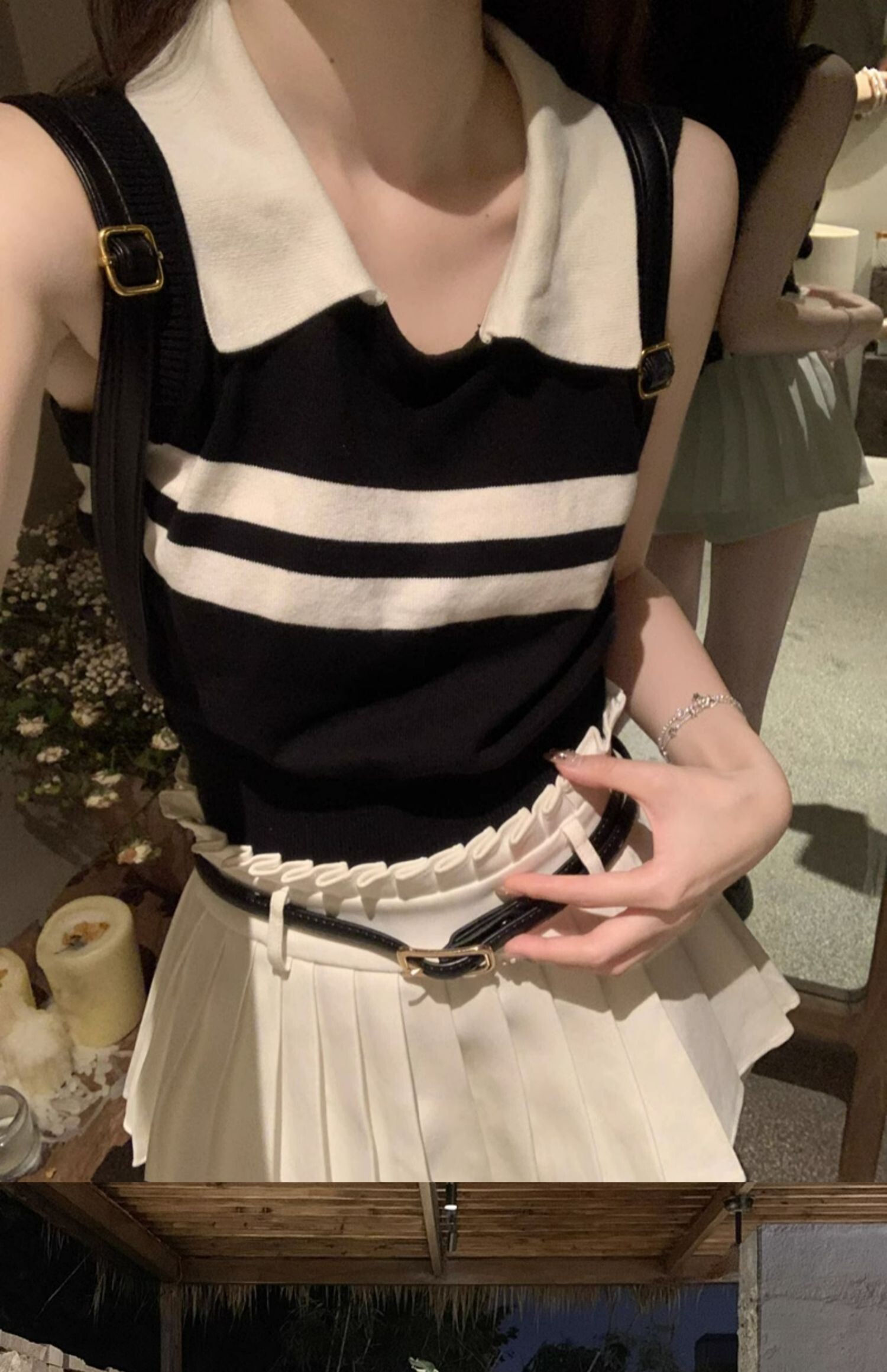 • Goddess-style Polo Neck Striped Knit Vest Pleated Skirt Women's Summer 2024 New Style