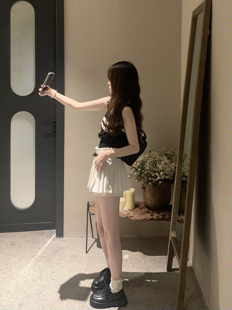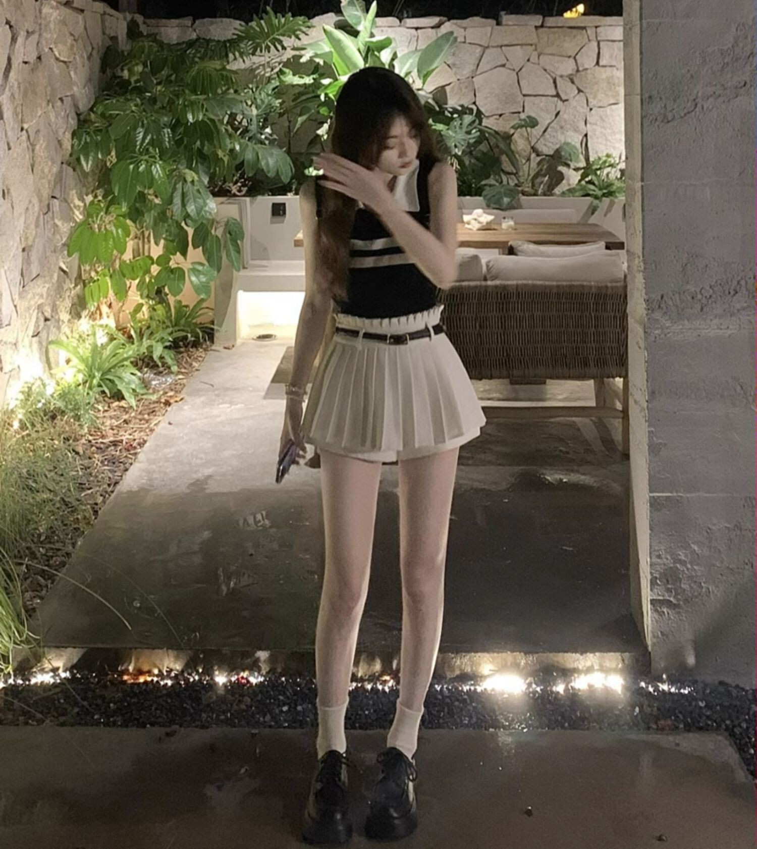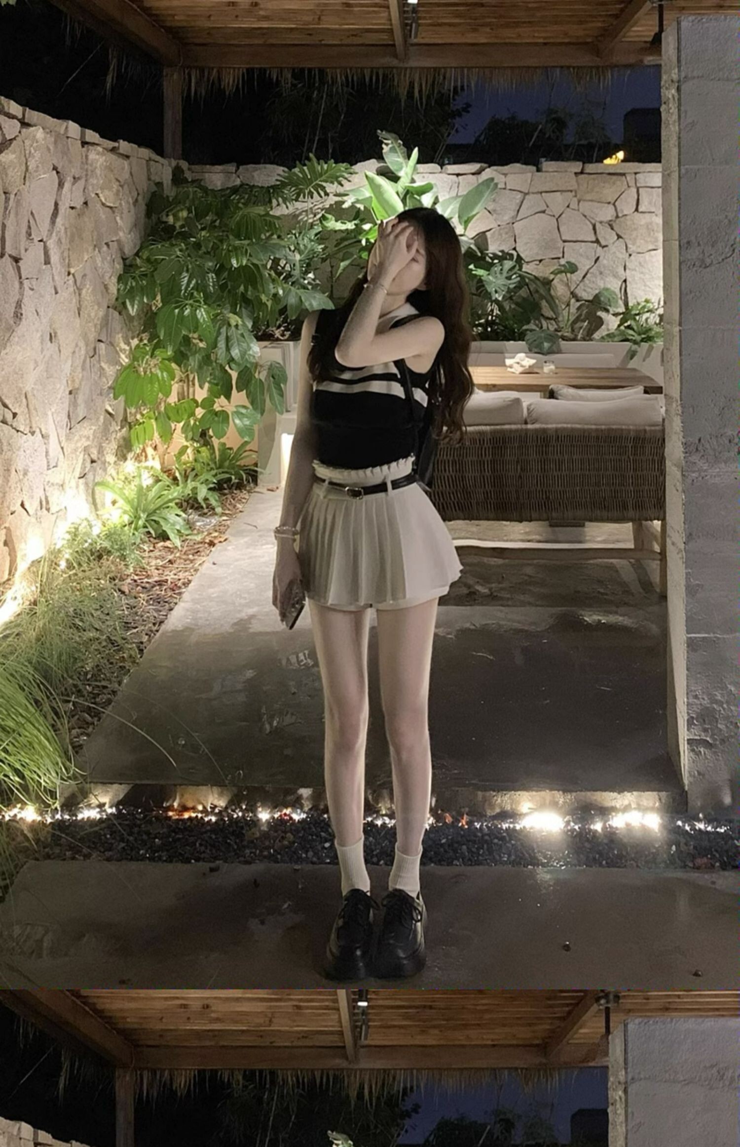 • Goddess-style Polo Neck Striped Knit Vest Pleated Skirt Women's Summer 2024 New Style