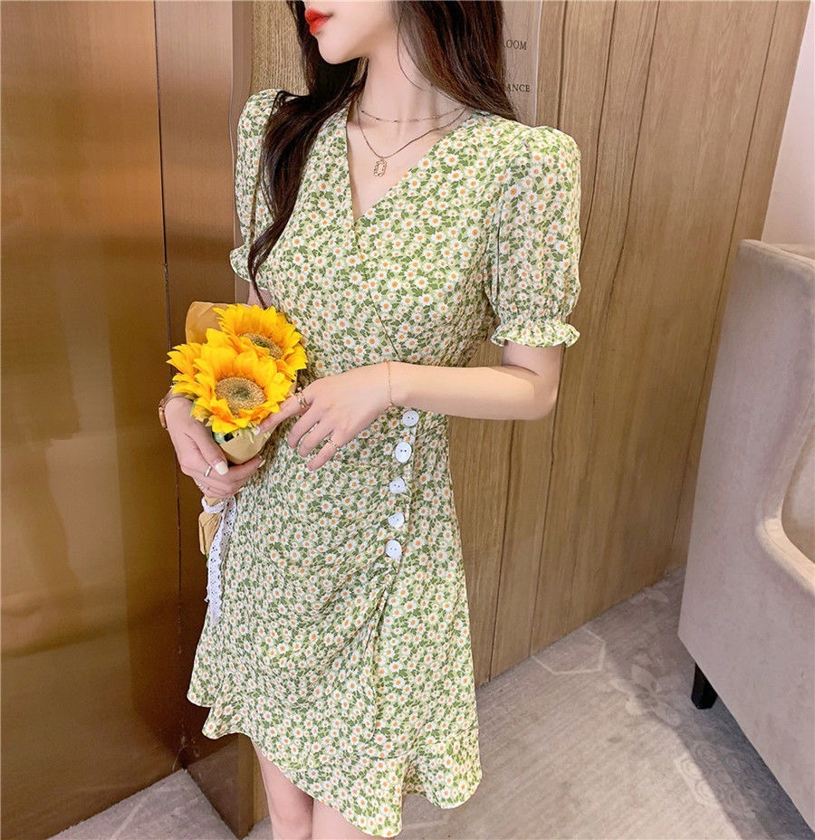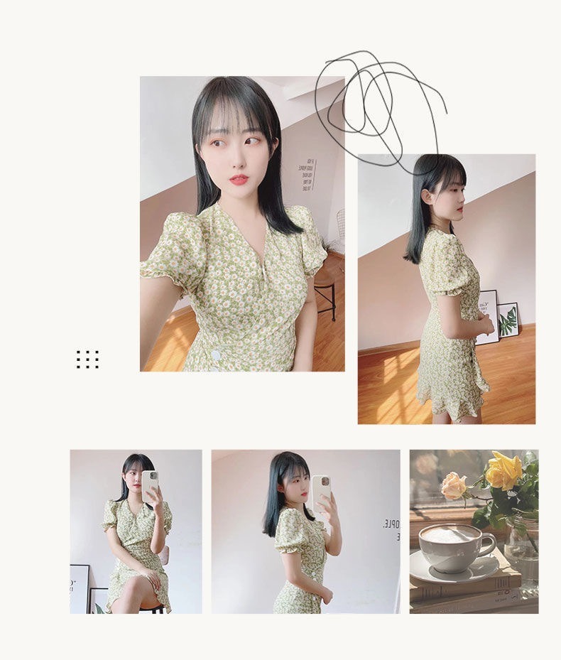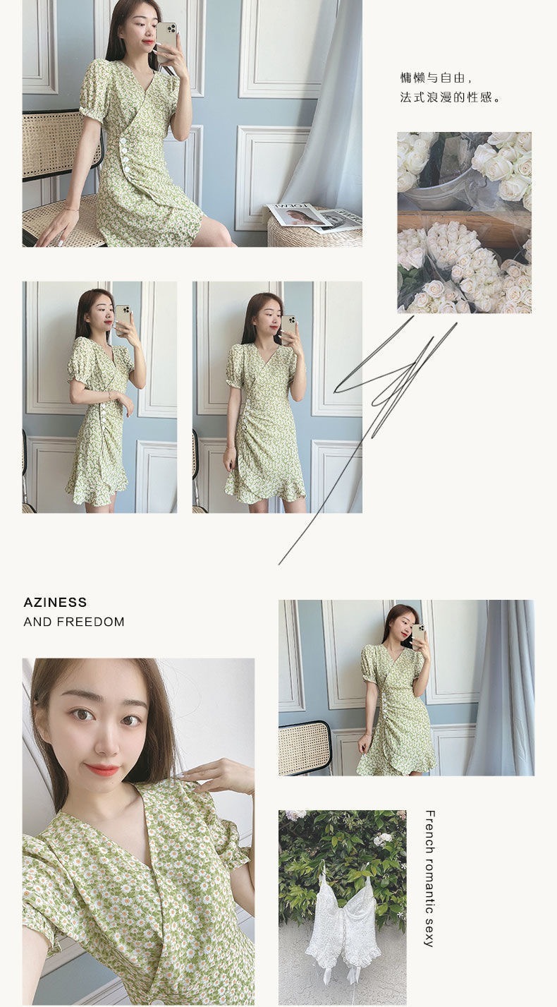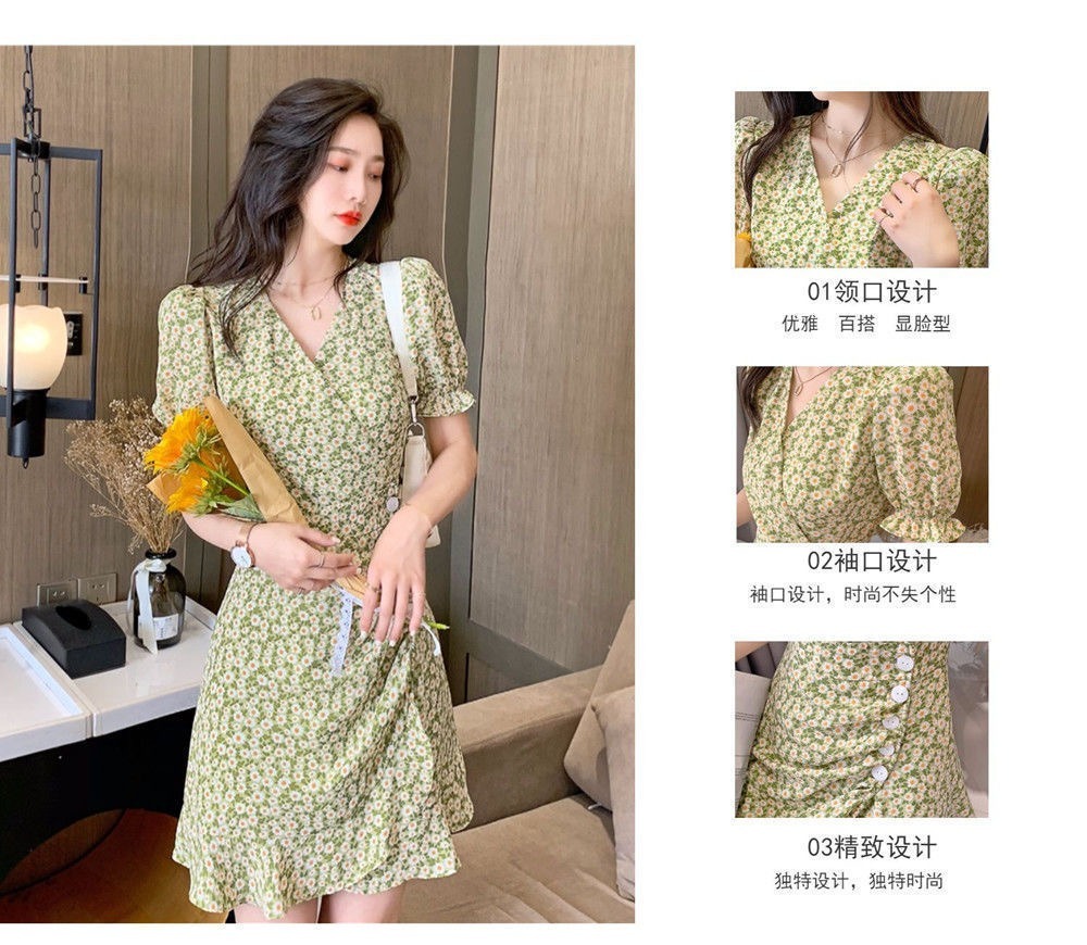• French-style women's dress, 2022 new summer style, short green dress with puff sleeves and small daisy print.