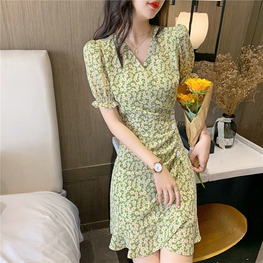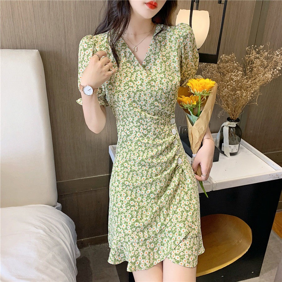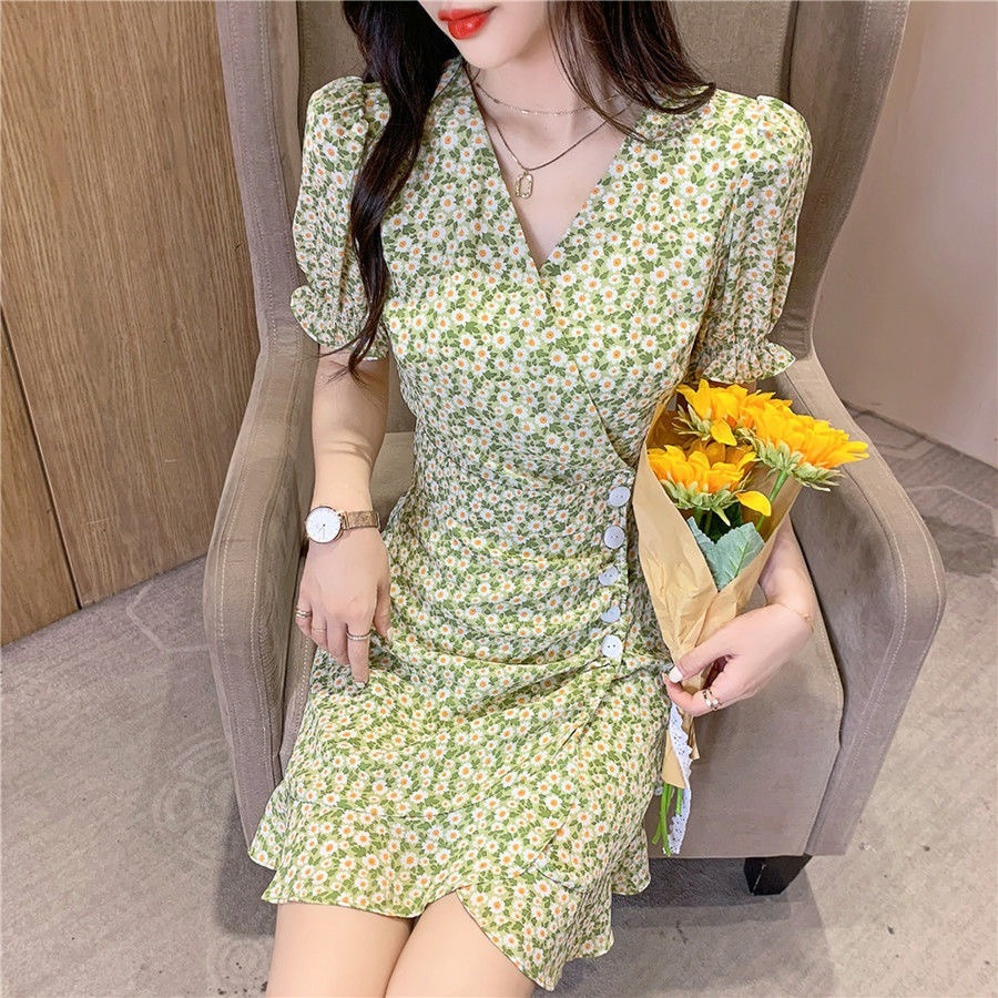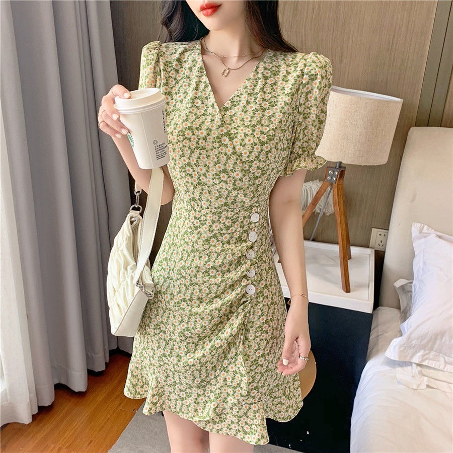 • French-style women's dress, 2022 new summer style, short green dress with puff sleeves and small daisy print.