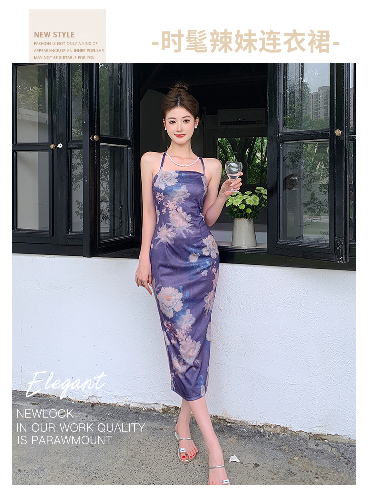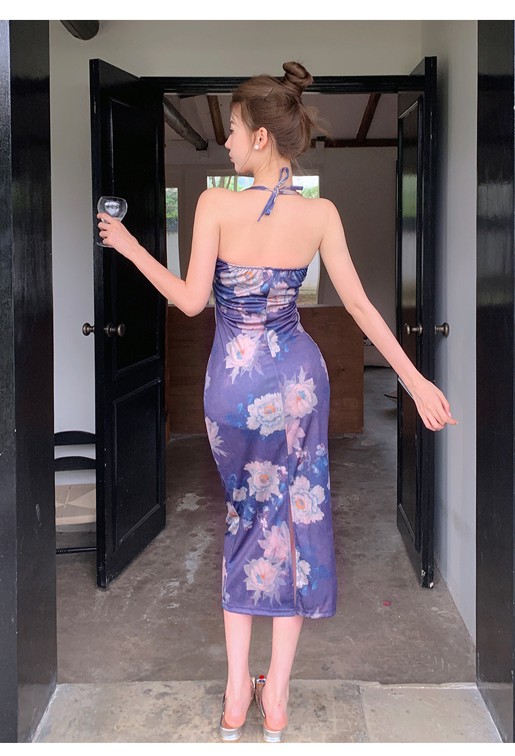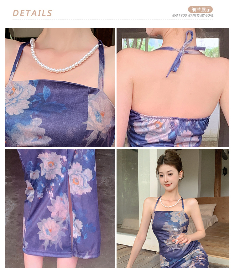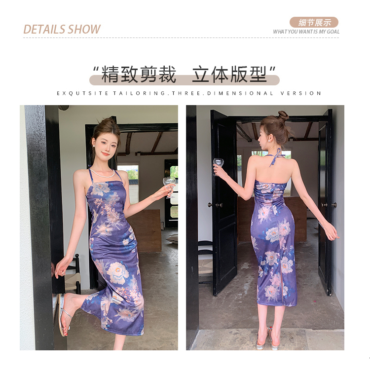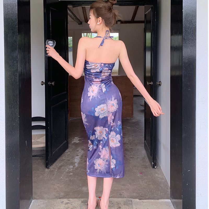 • Real shot of a new Chinese retro halter neck suspender pearl dress for women, with a waist-cinching, elegant and sophisticated look, purple with a back slit.