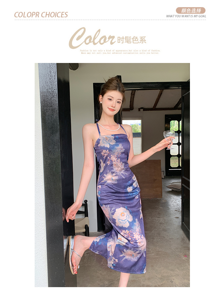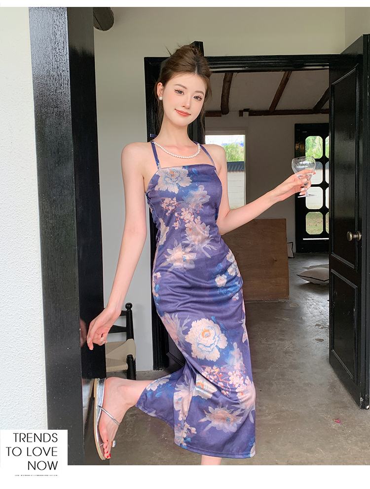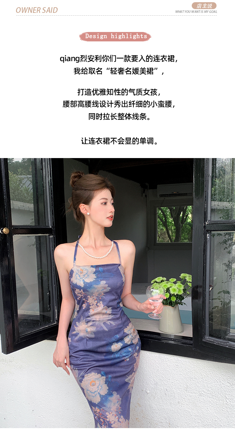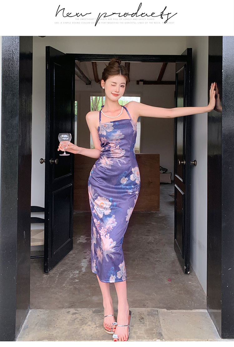 • Real shot of a new Chinese retro halter neck suspender pearl dress for women, with a waist-cinching, elegant and sophisticated look, purple with a back slit.