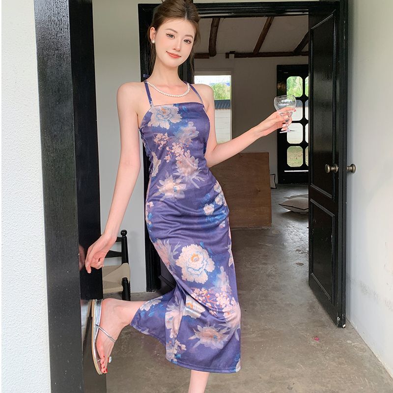 Real shot of a new Chinese retro halter neck suspender pearl dress for women, with a waist-cinching, elegant and sophisticated look, purple with a back slit.