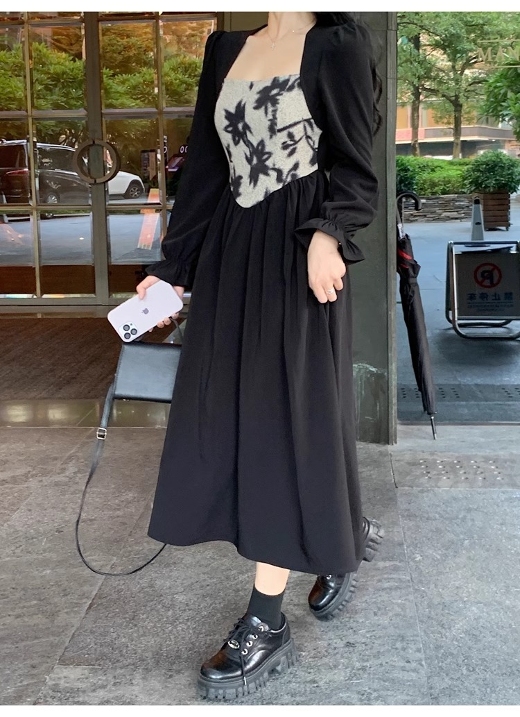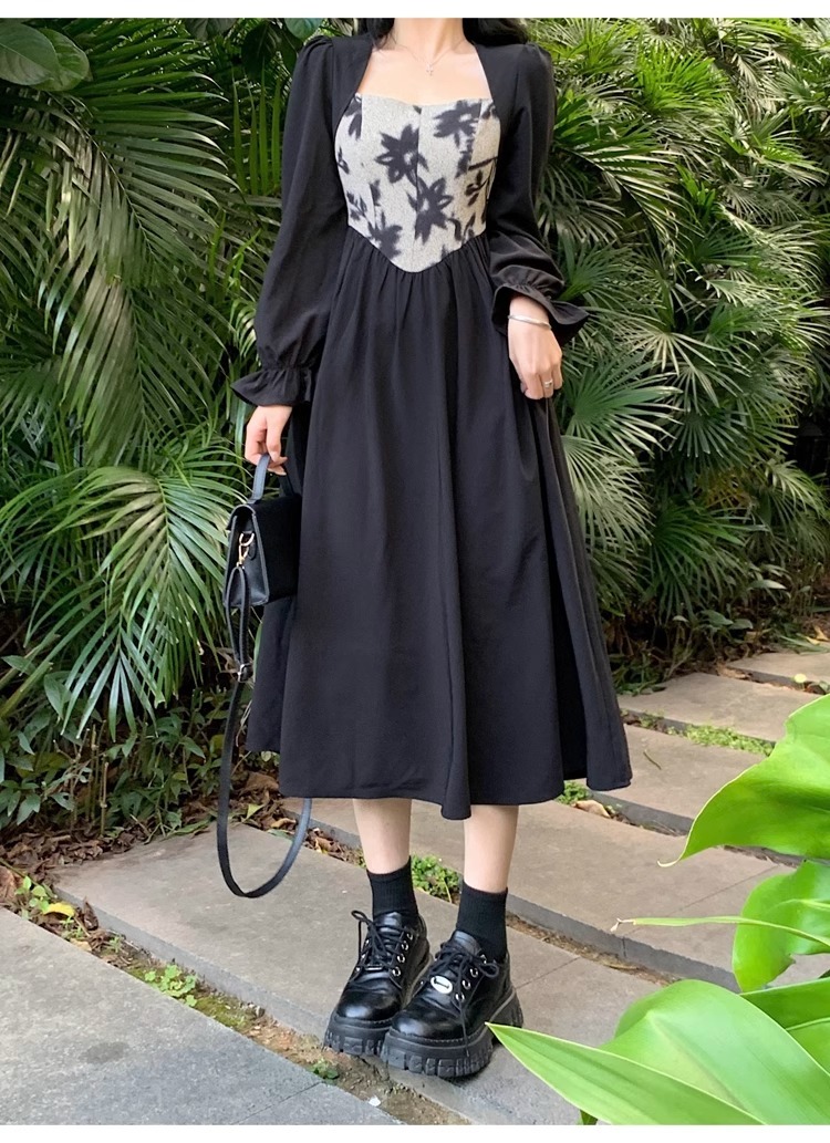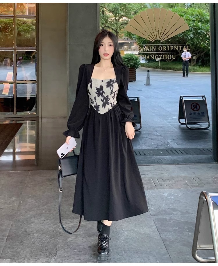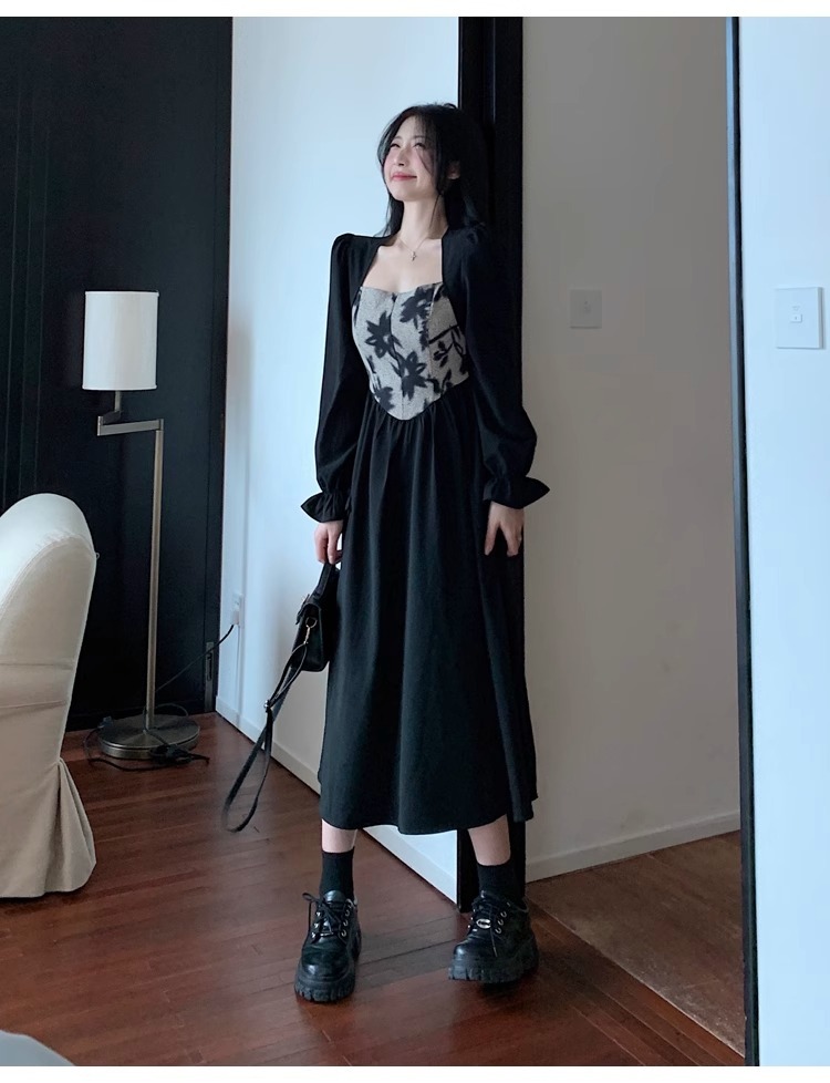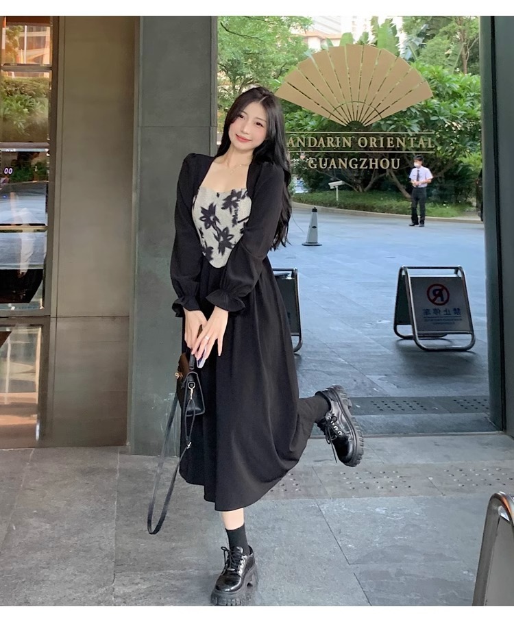 • Plus-size women's French Hepburn style black square neck dress, autumn high-end patchwork waist slimming dress
