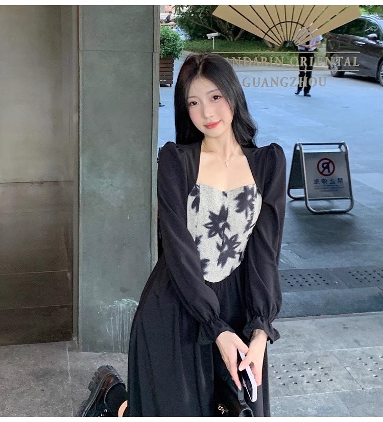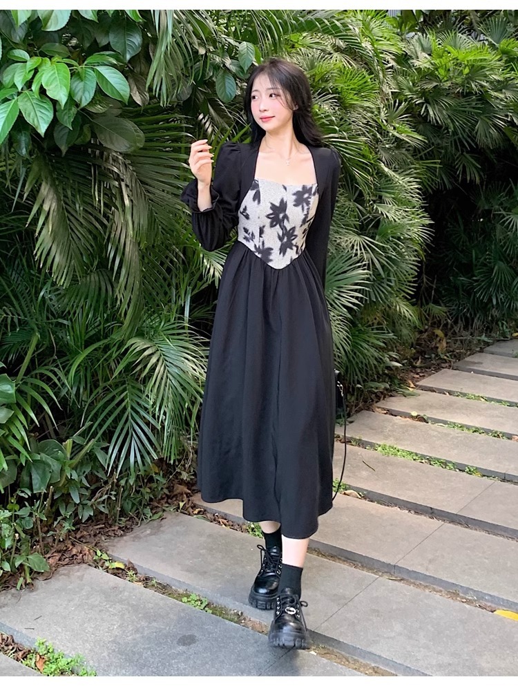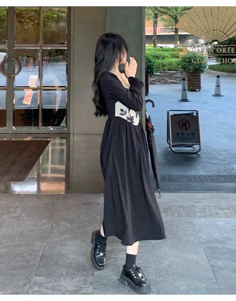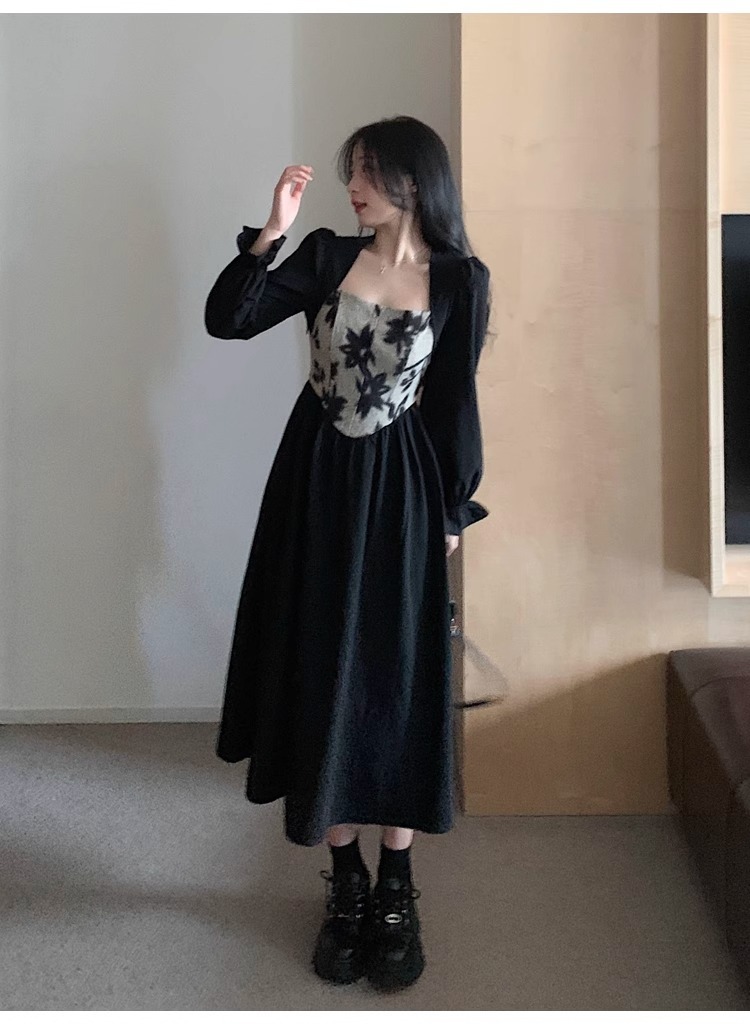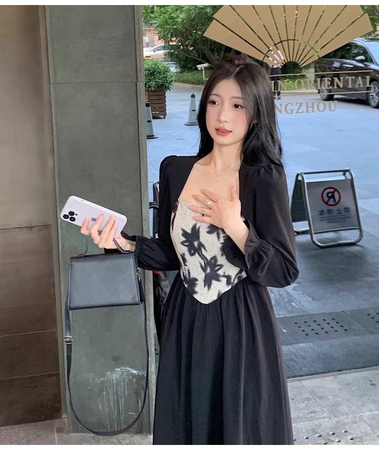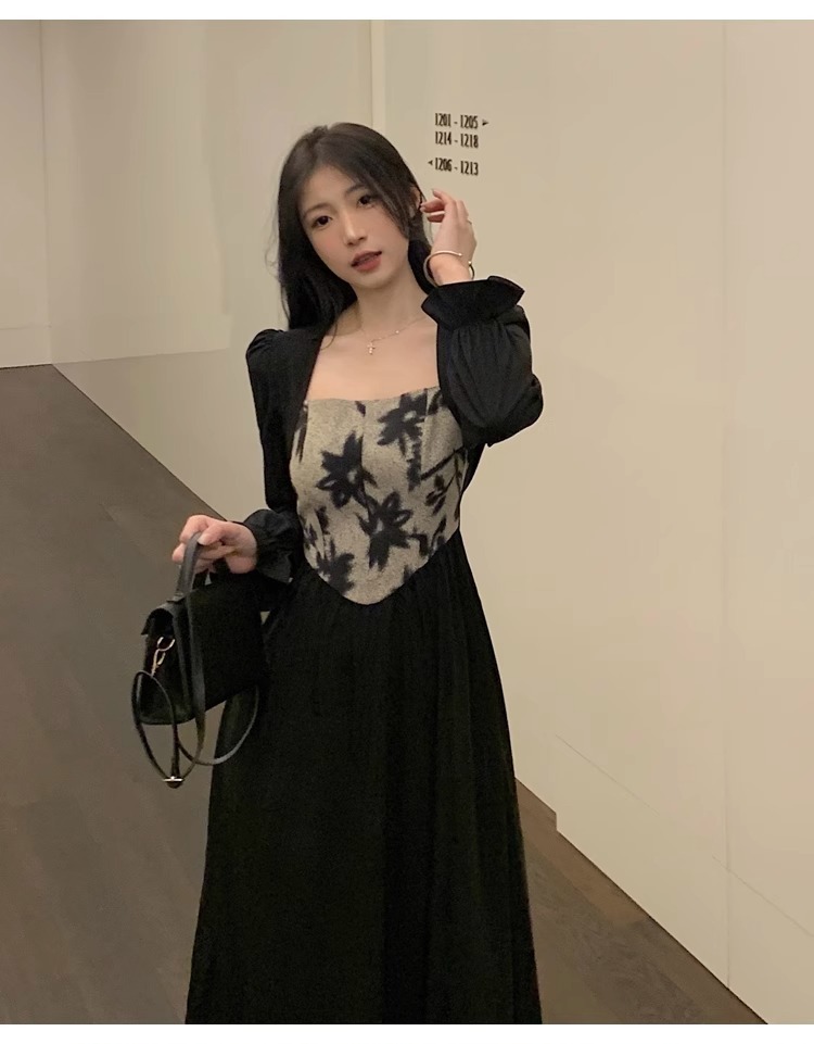 • Plus-size women's French Hepburn style black square neck dress, autumn high-end patchwork waist slimming dress