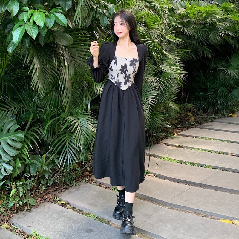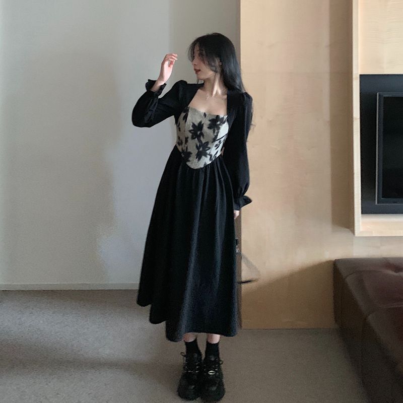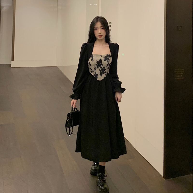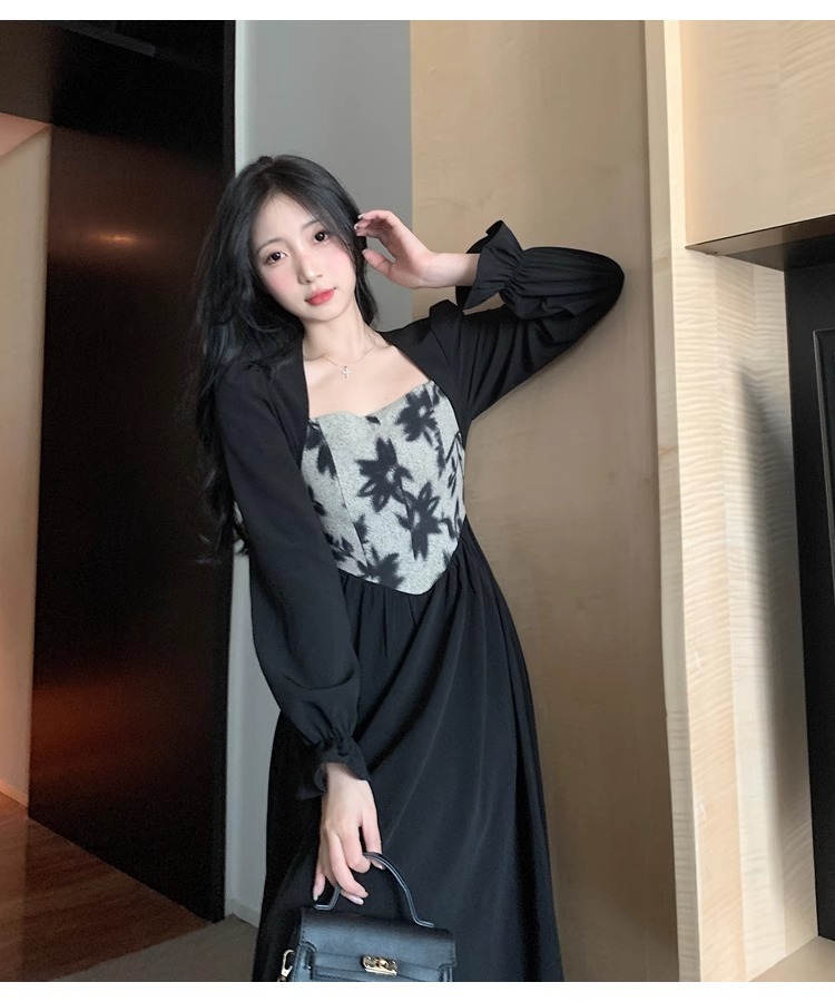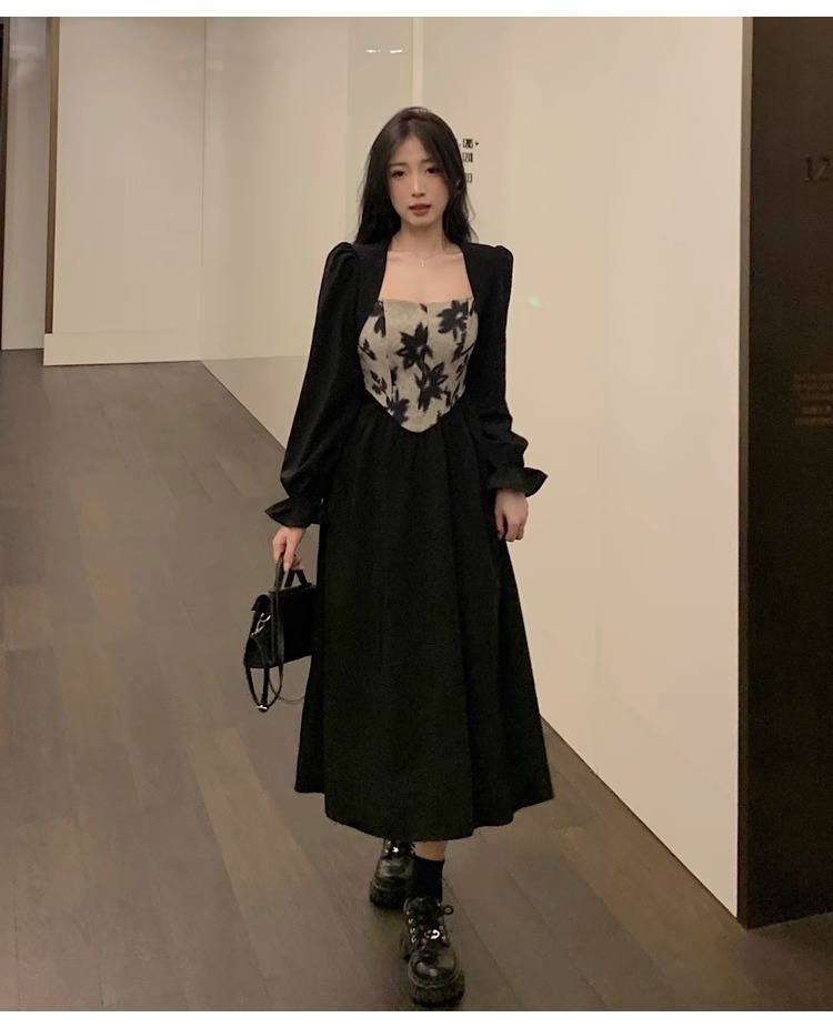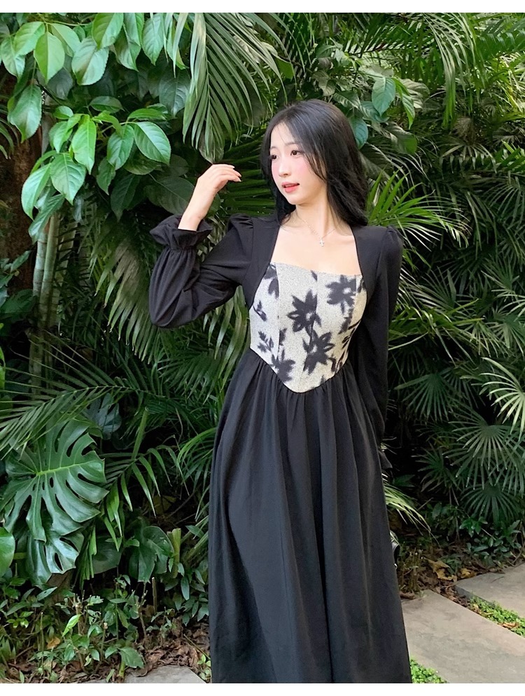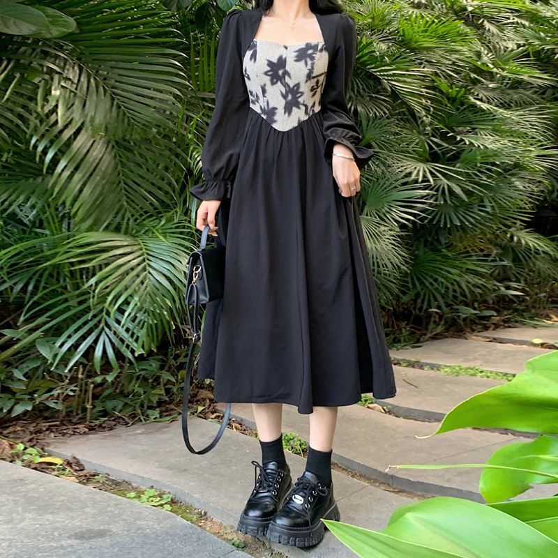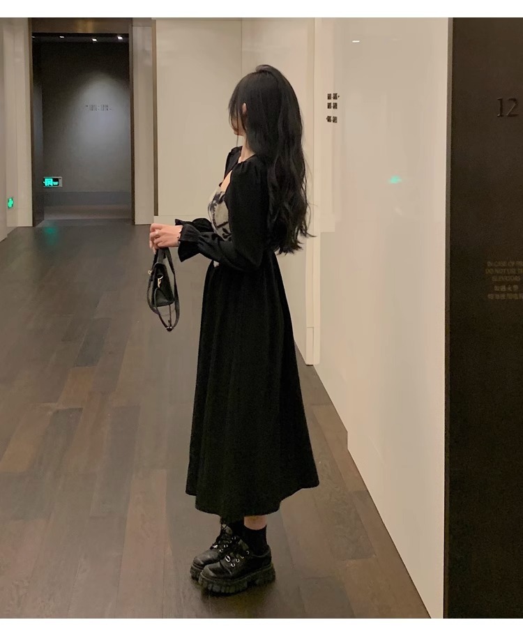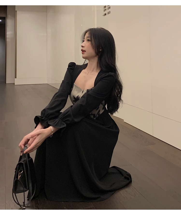 Plus-size women's French Hepburn style black square neck dress, autumn high-end patchwork waist slimming dress