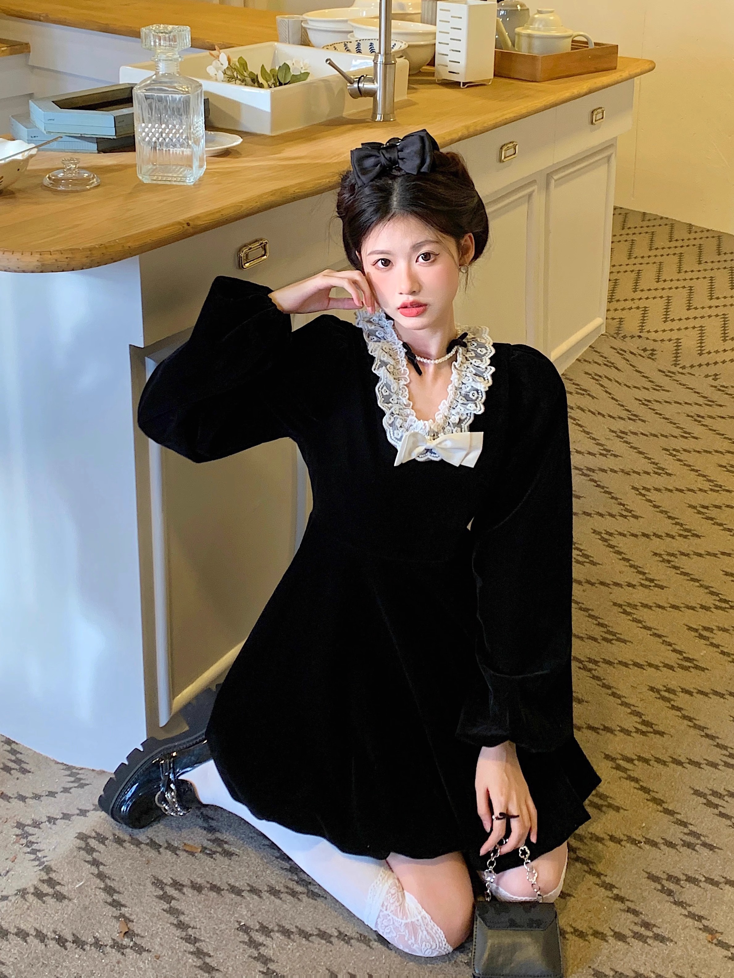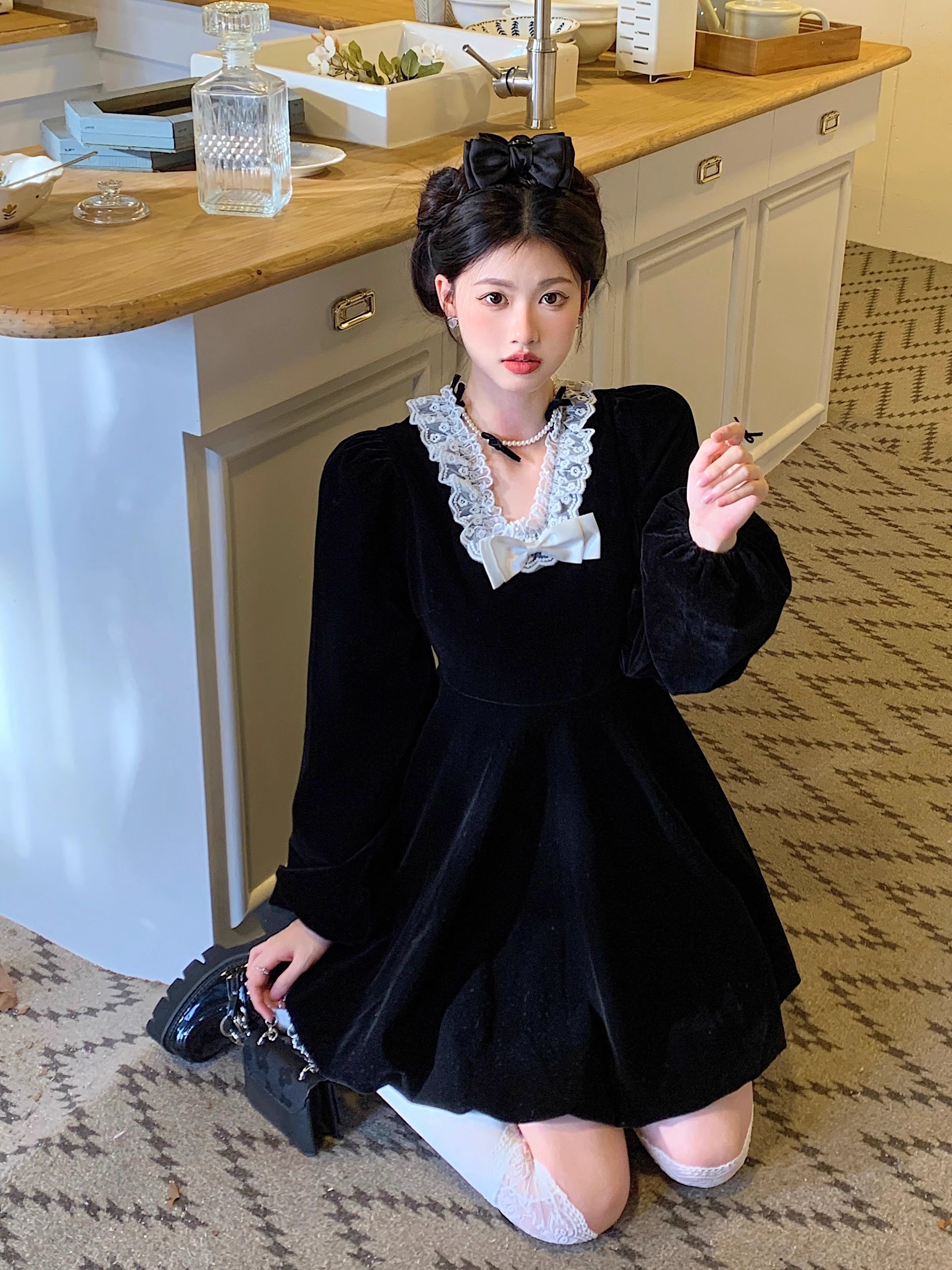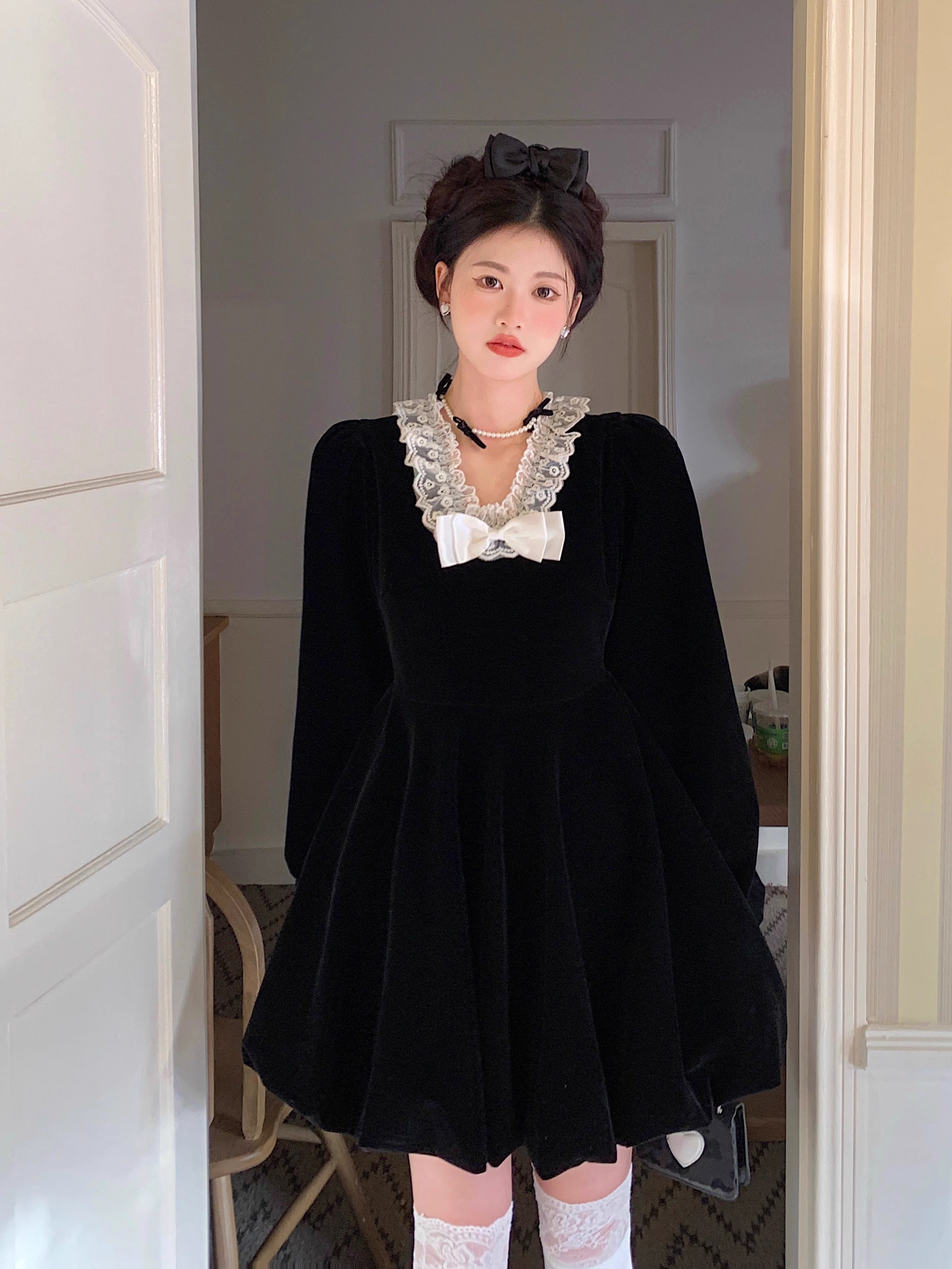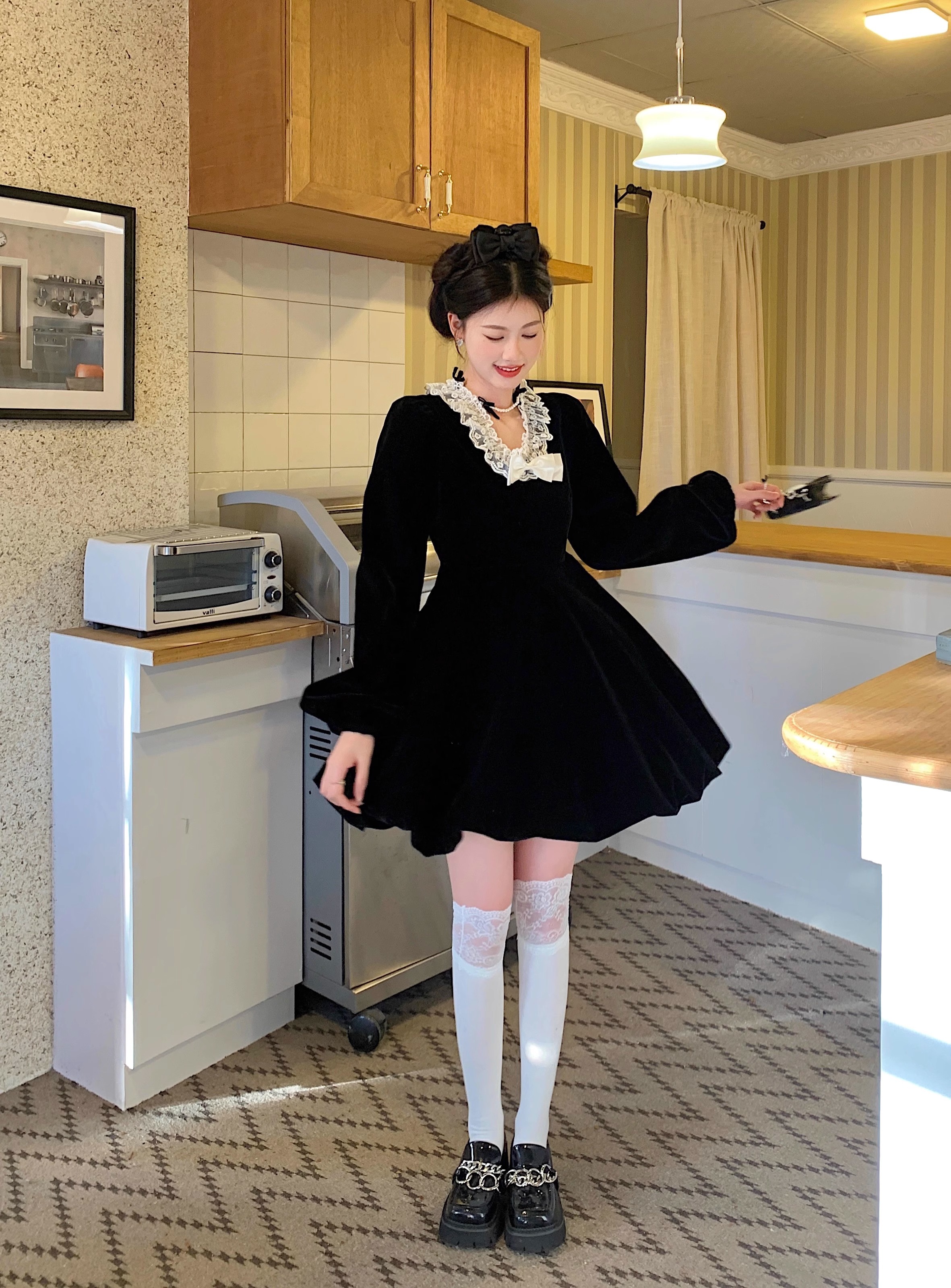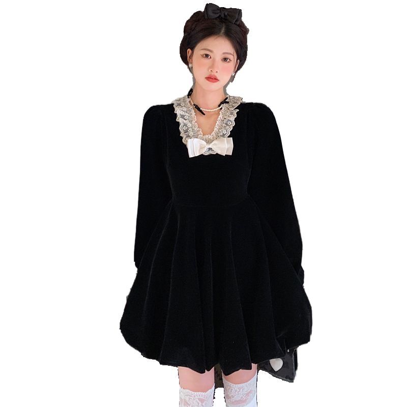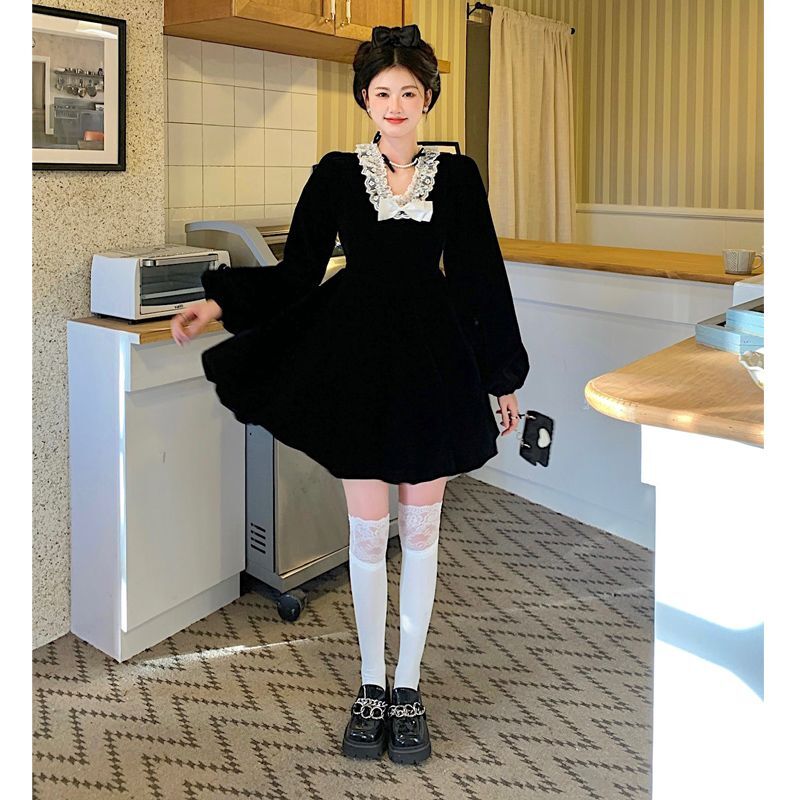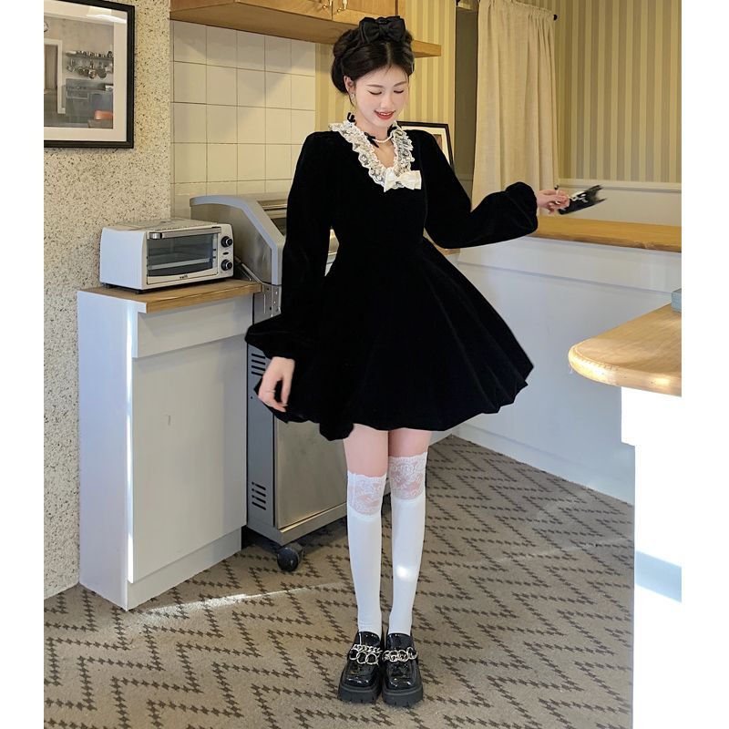 • Plus-size autumn/winter French Hepburn-inspired elegant little black dress for petite women; princess dress for a slimming effect.