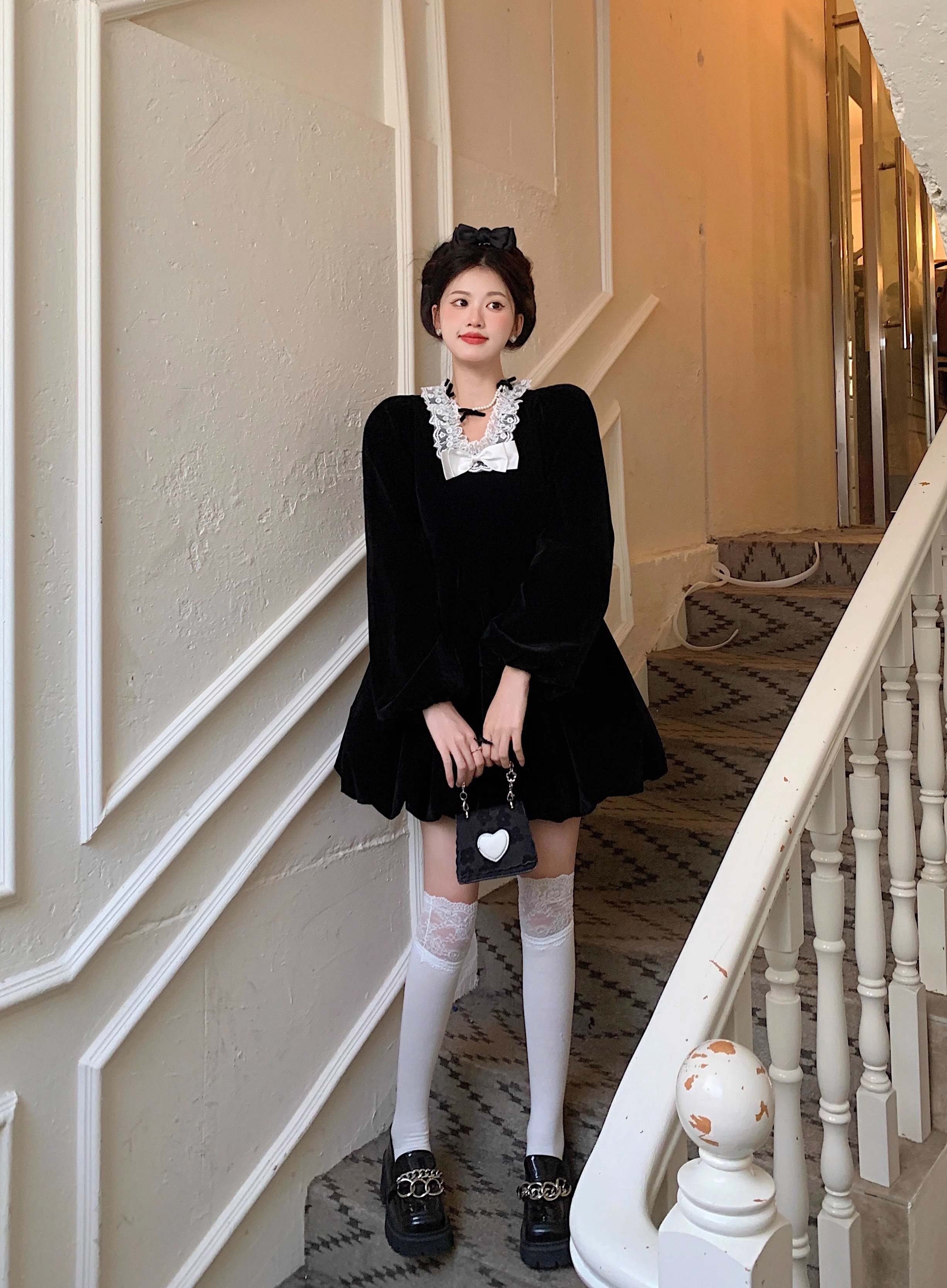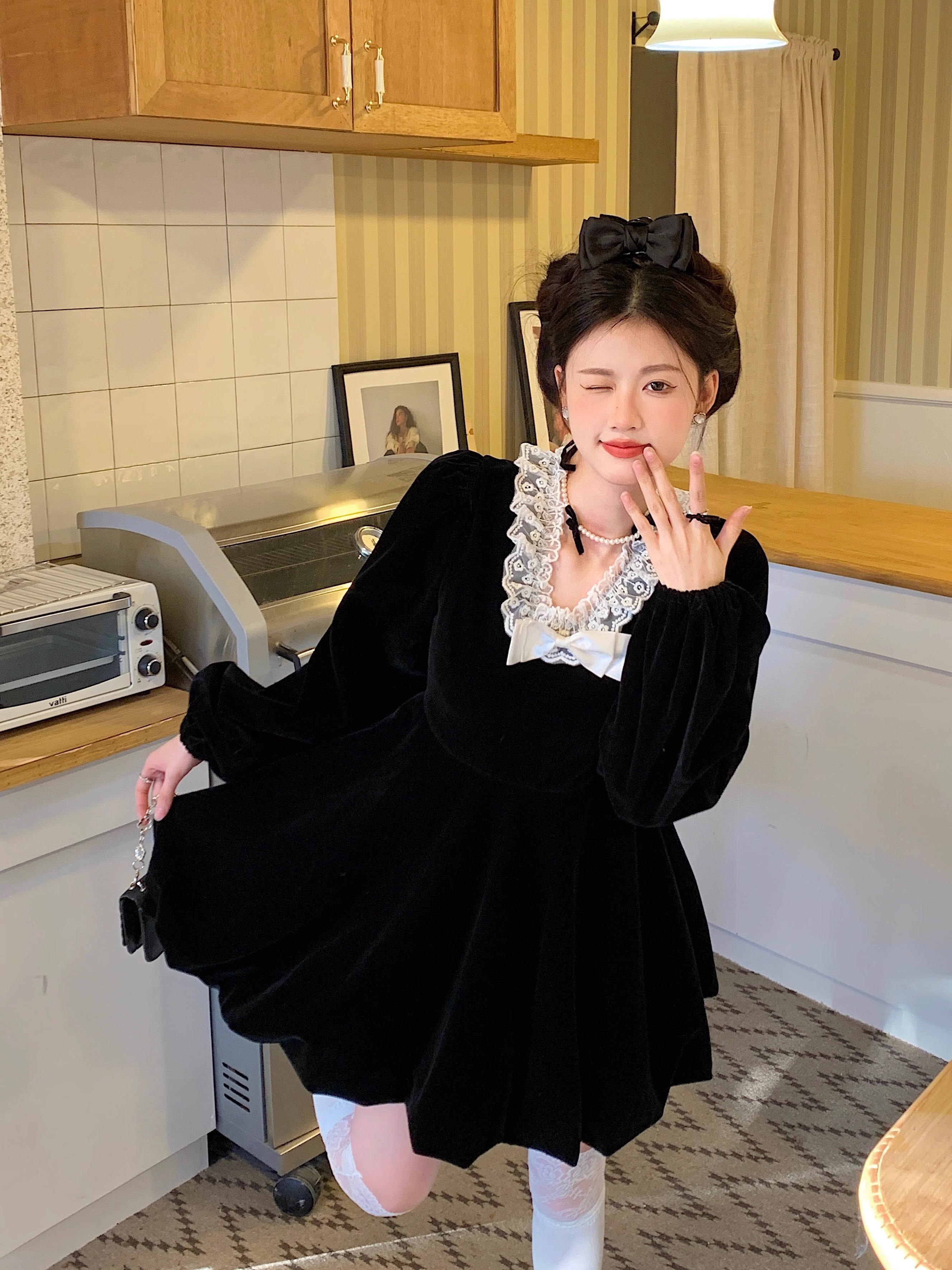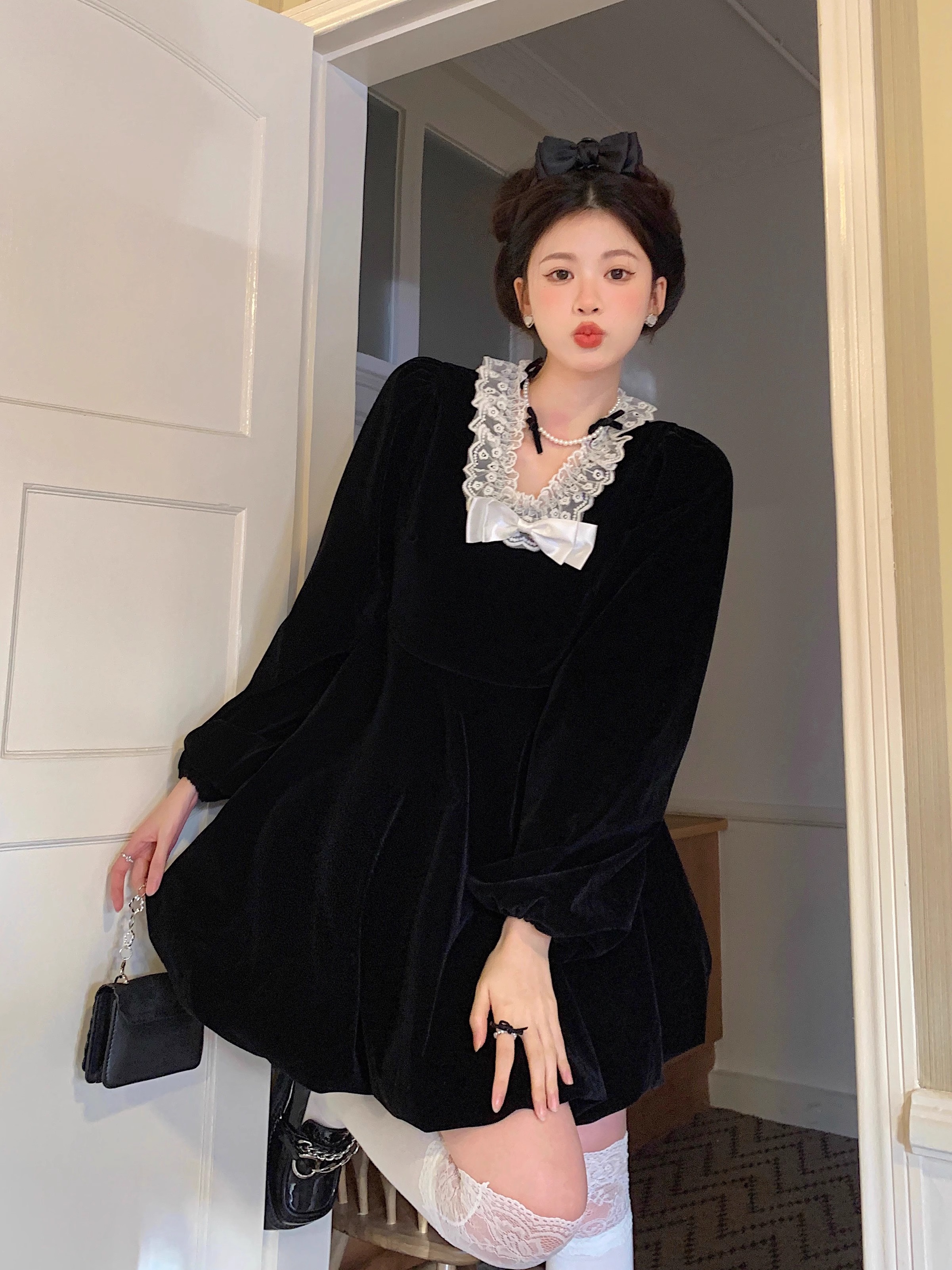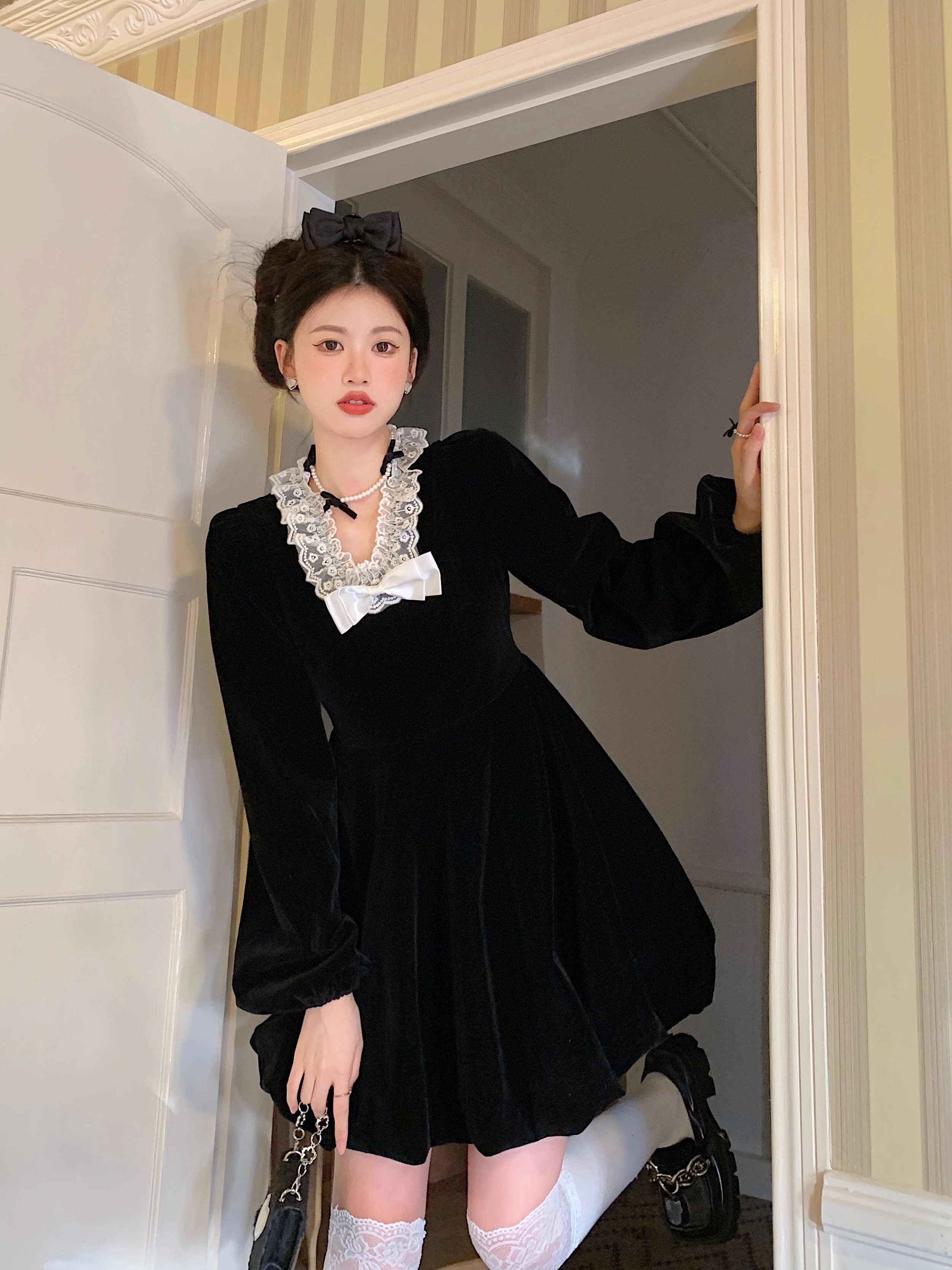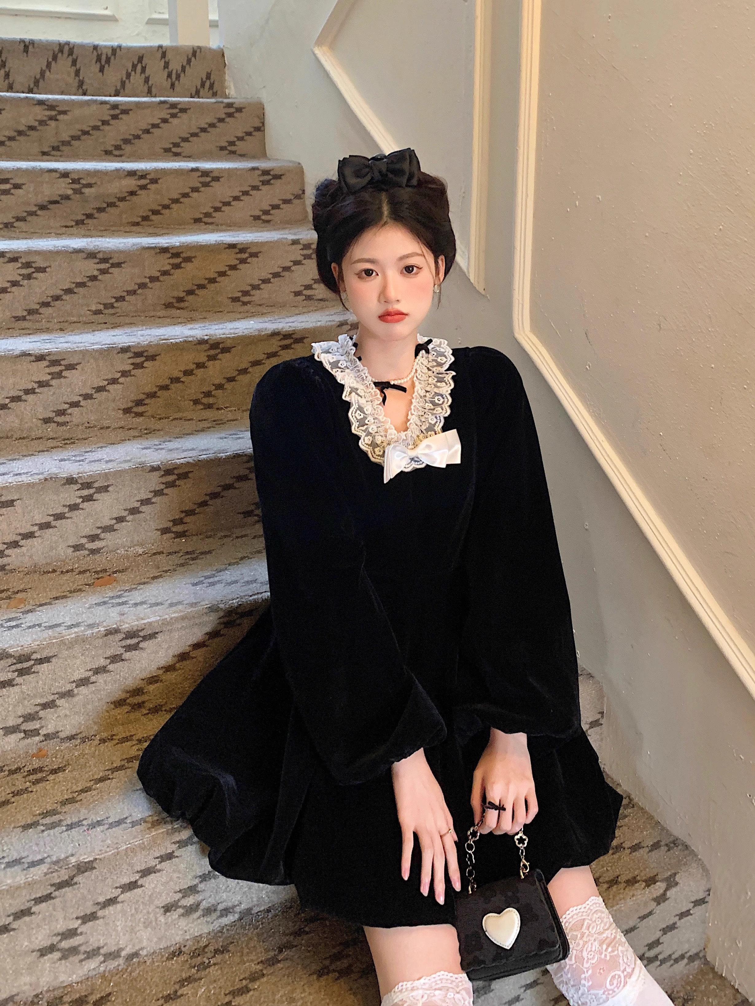 • Plus-size autumn/winter French Hepburn-inspired elegant little black dress for petite women; princess dress for a slimming effect.