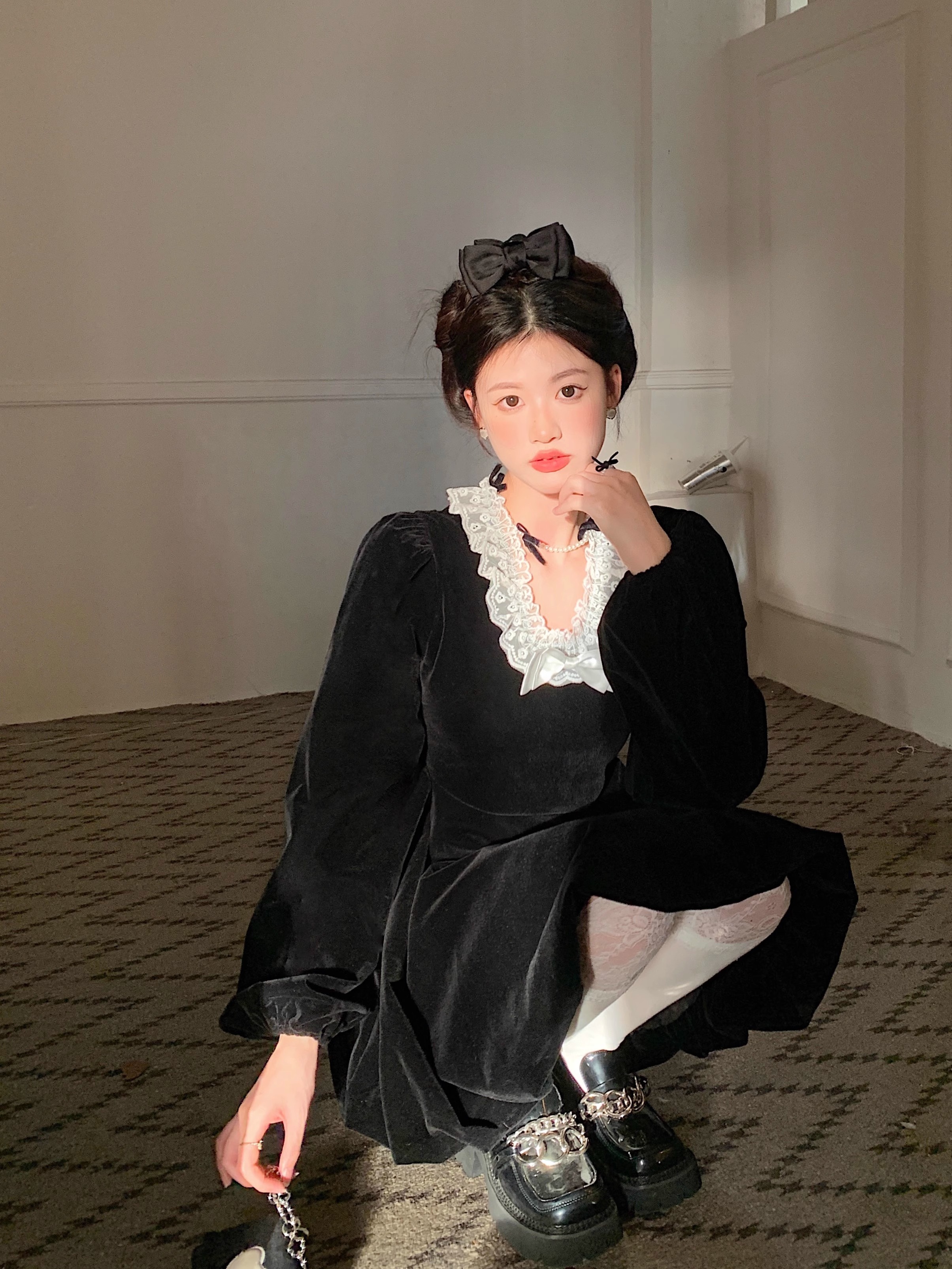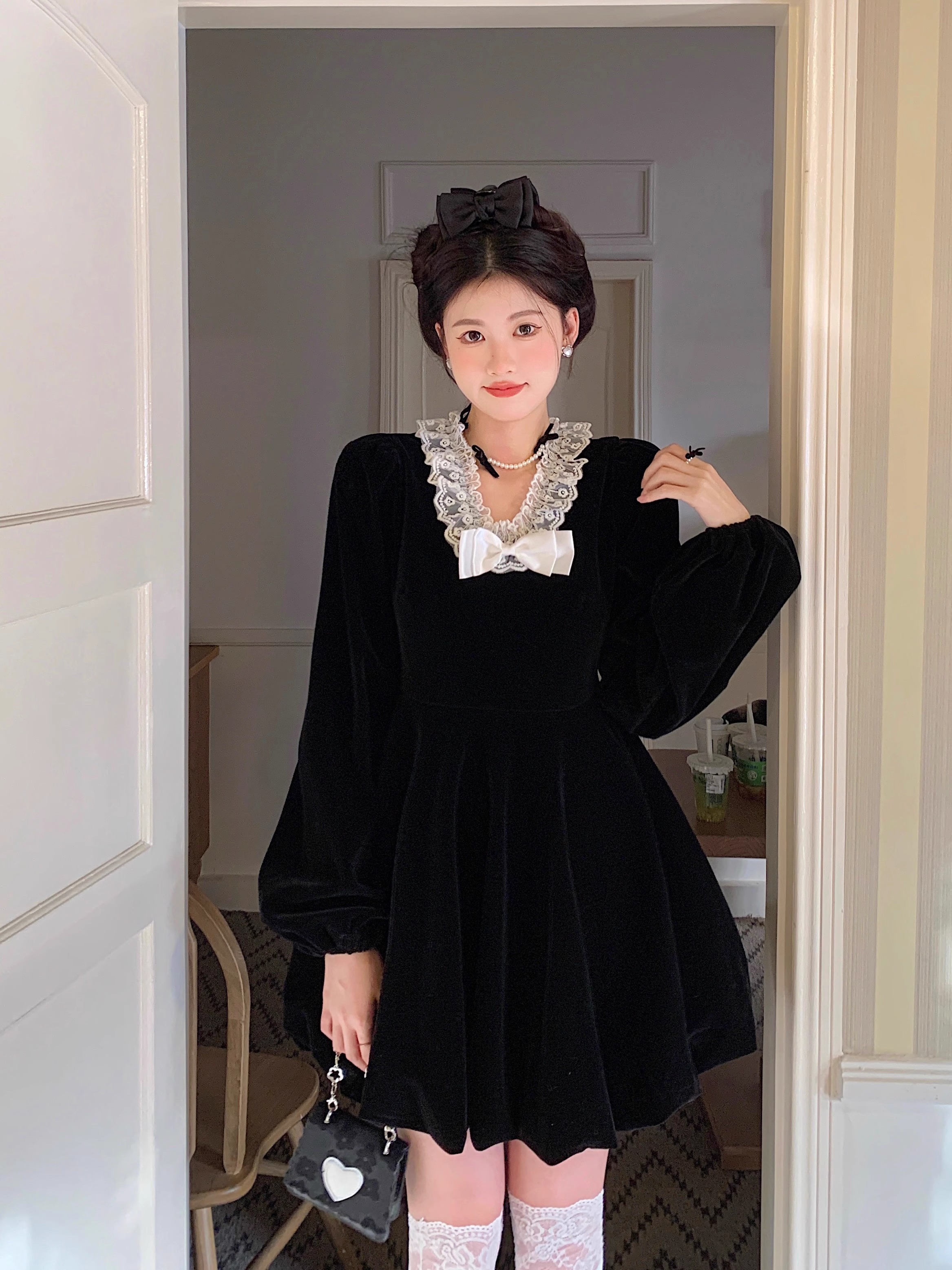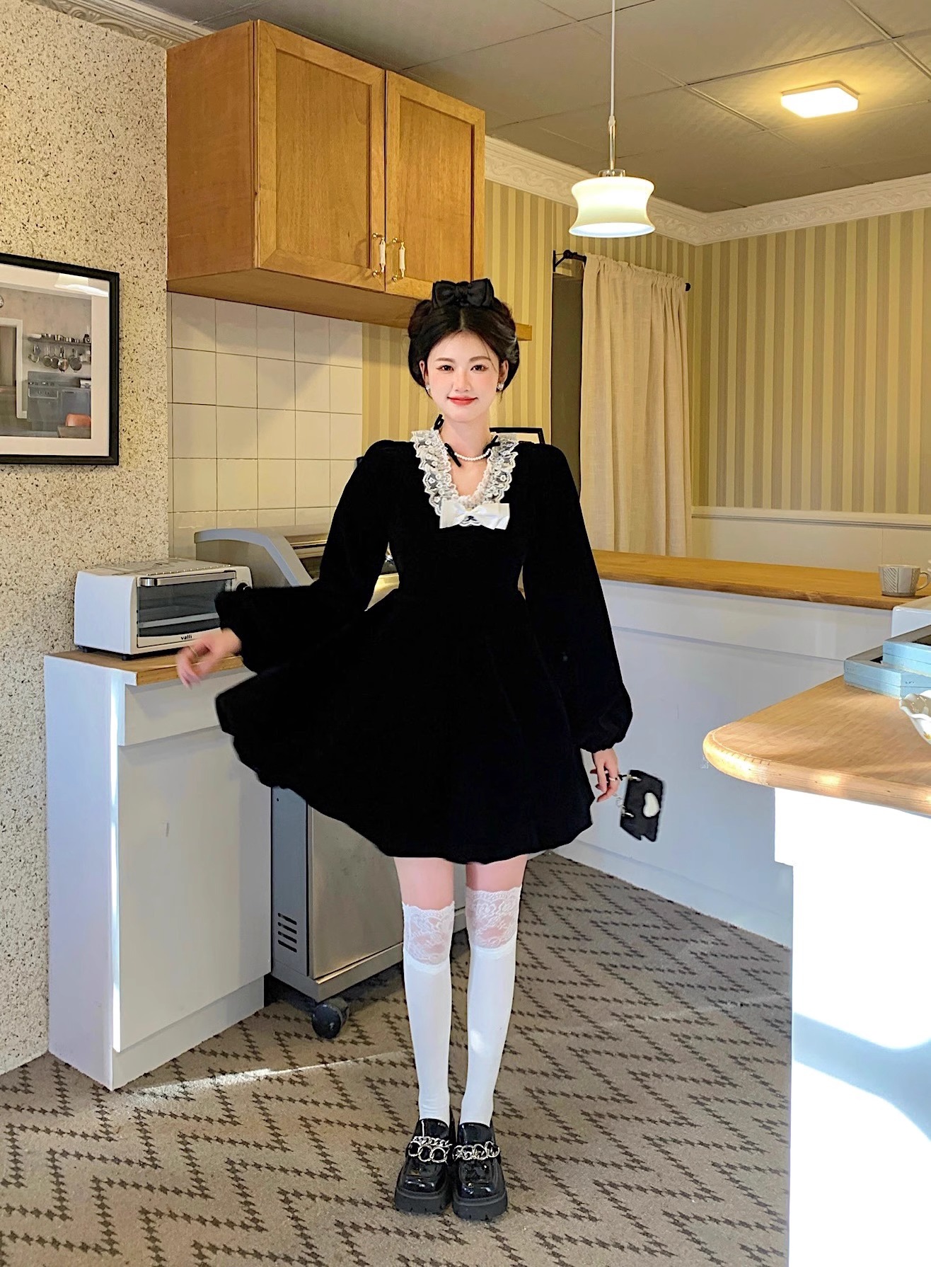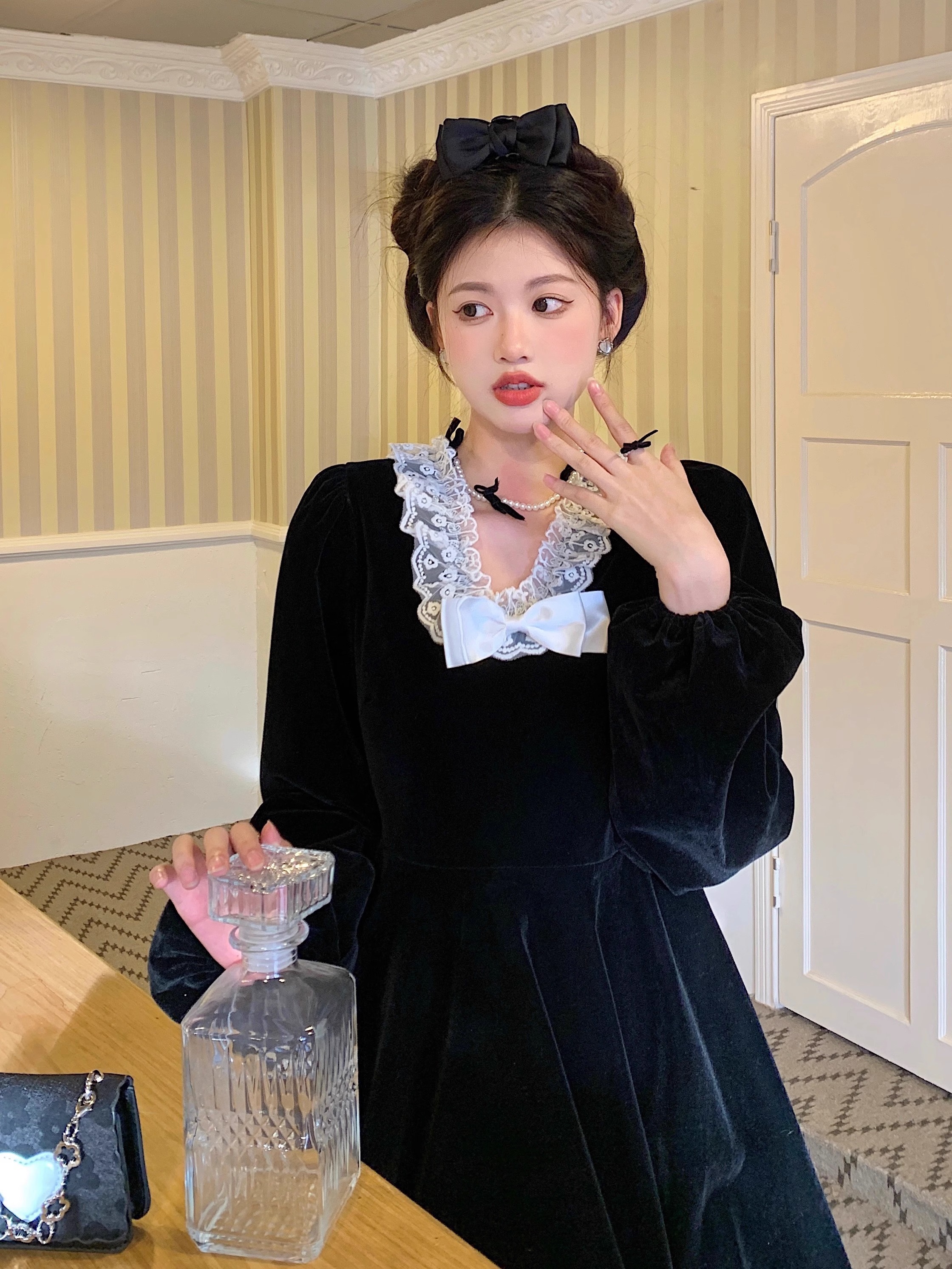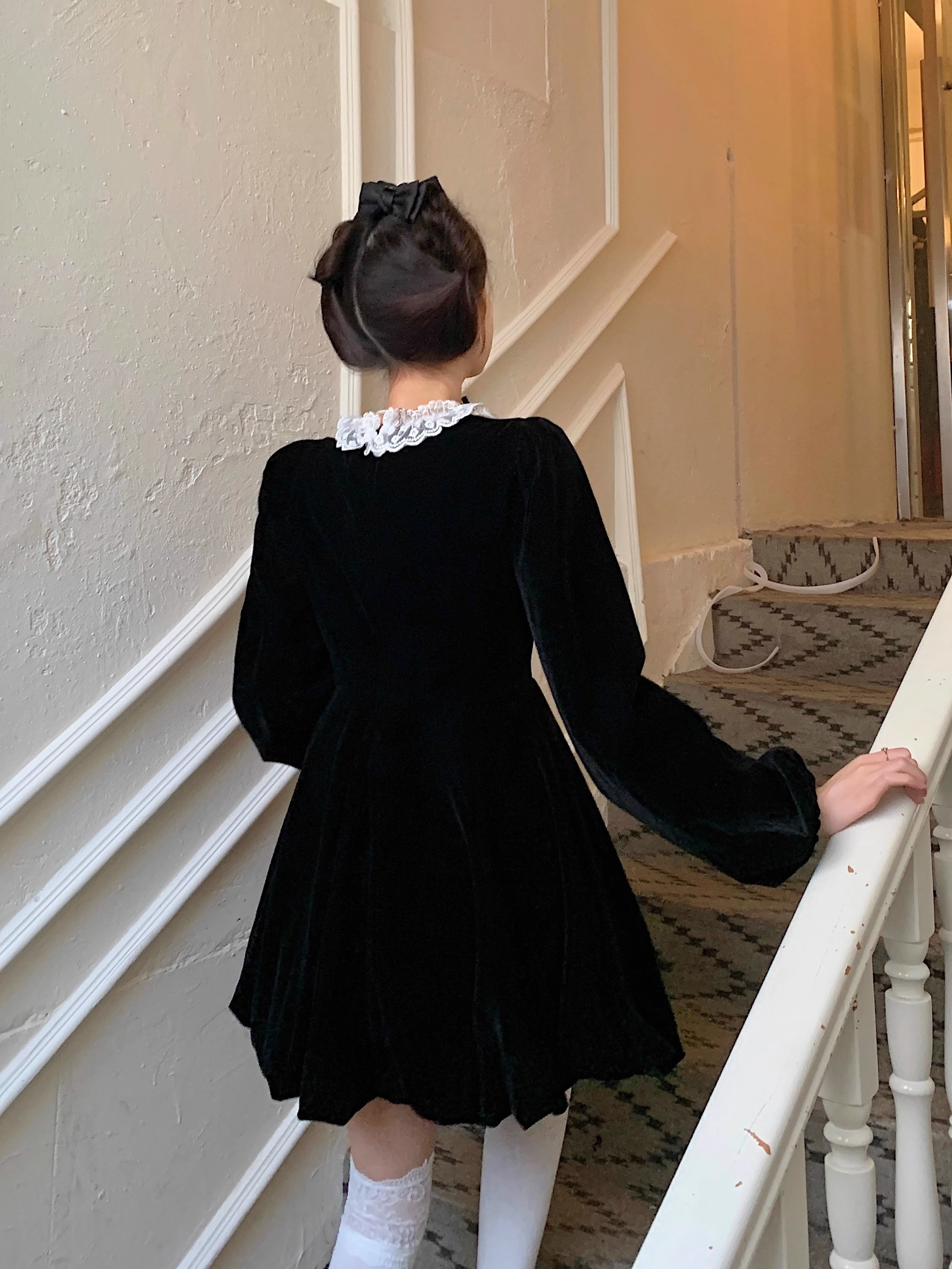 • Plus-size autumn/winter French Hepburn-inspired elegant little black dress for petite women; princess dress for a slimming effect.