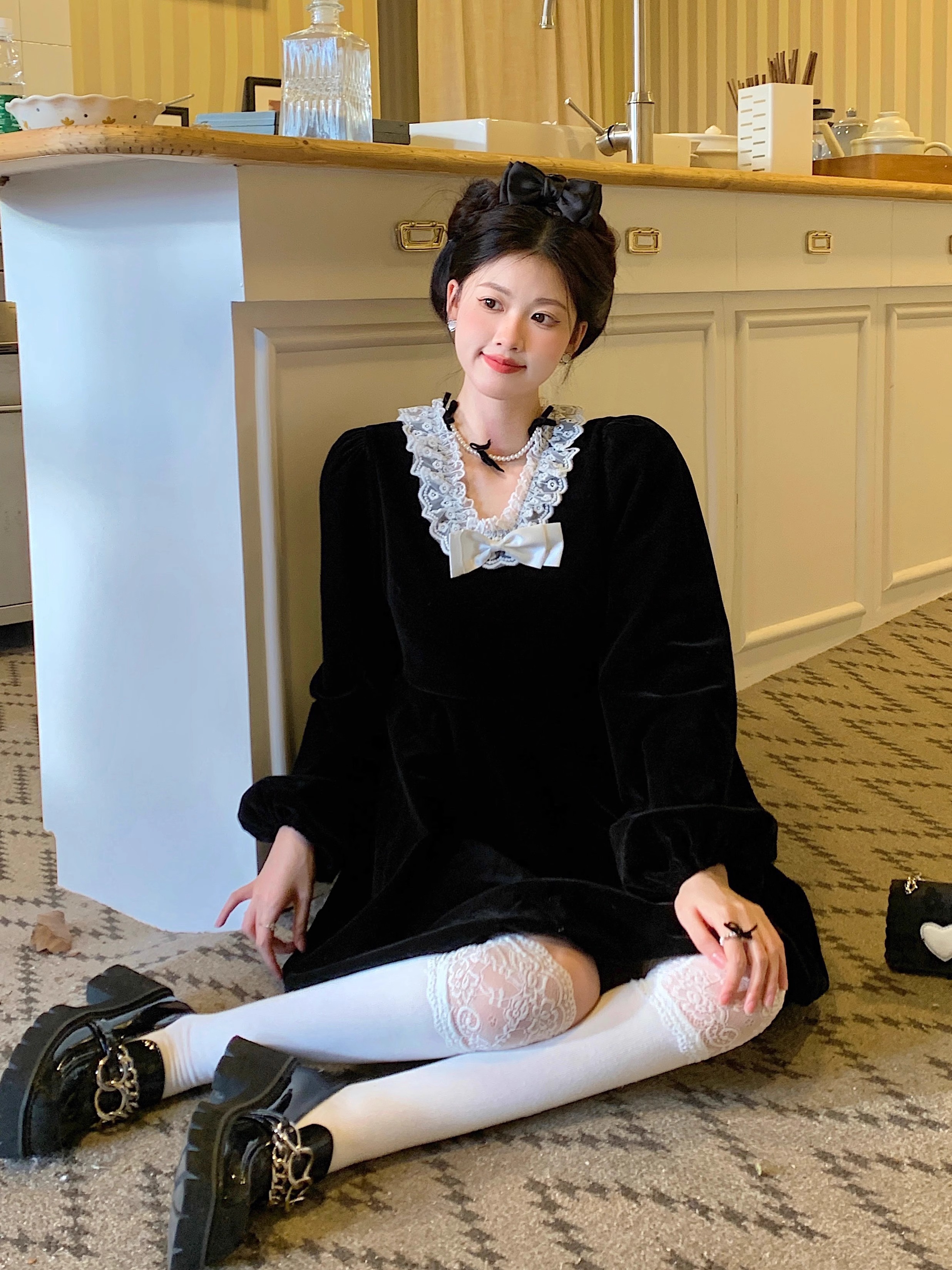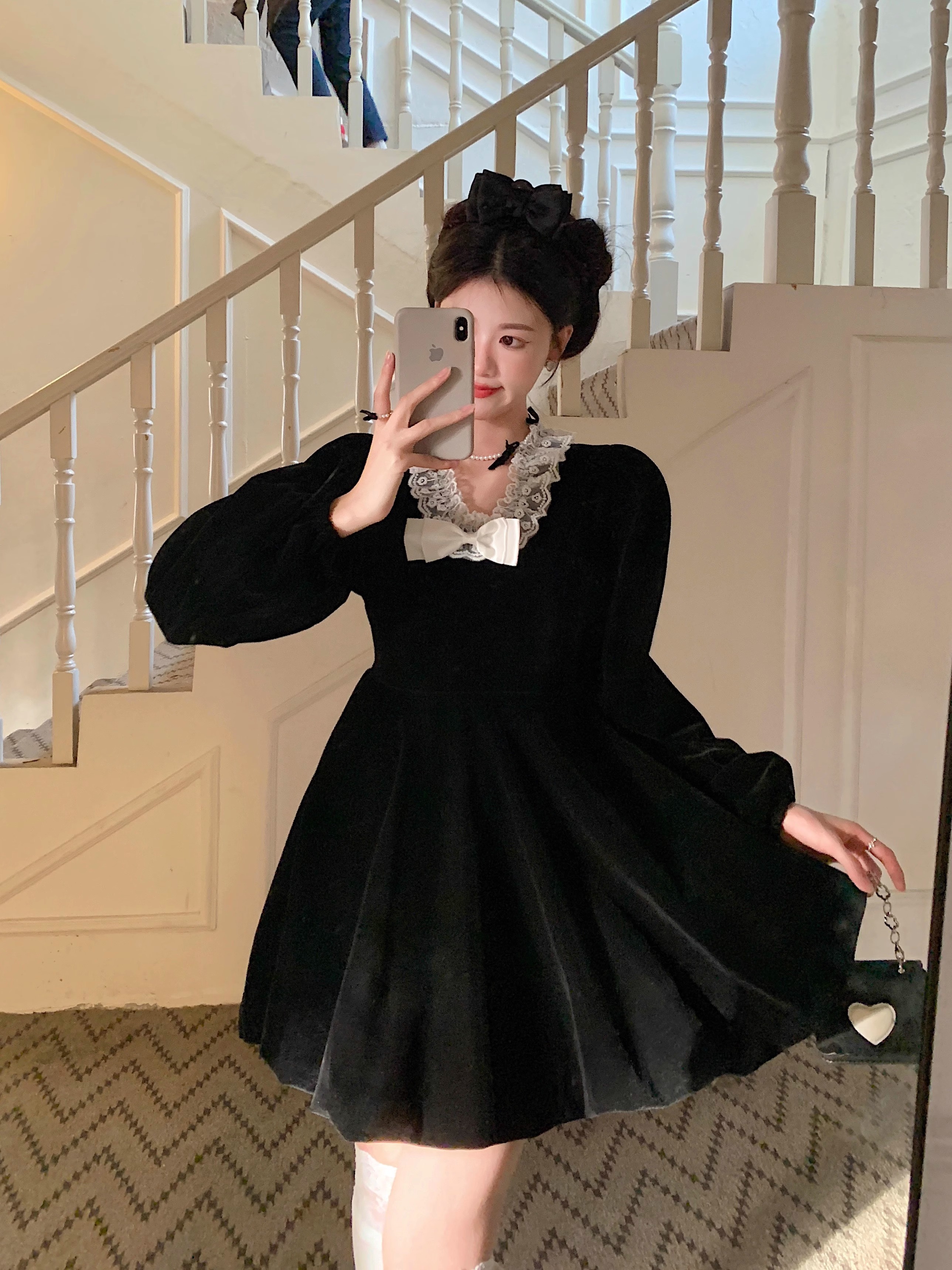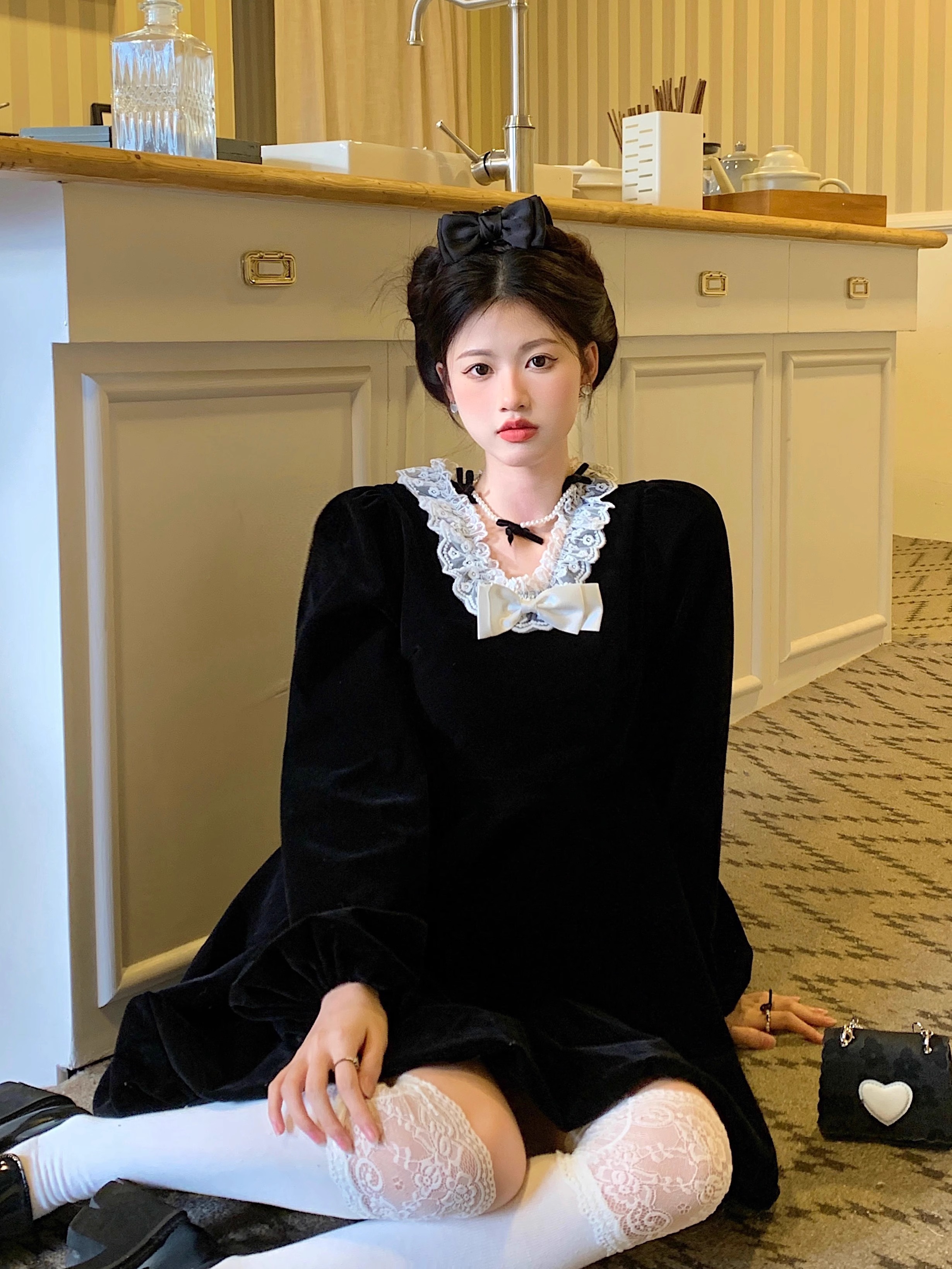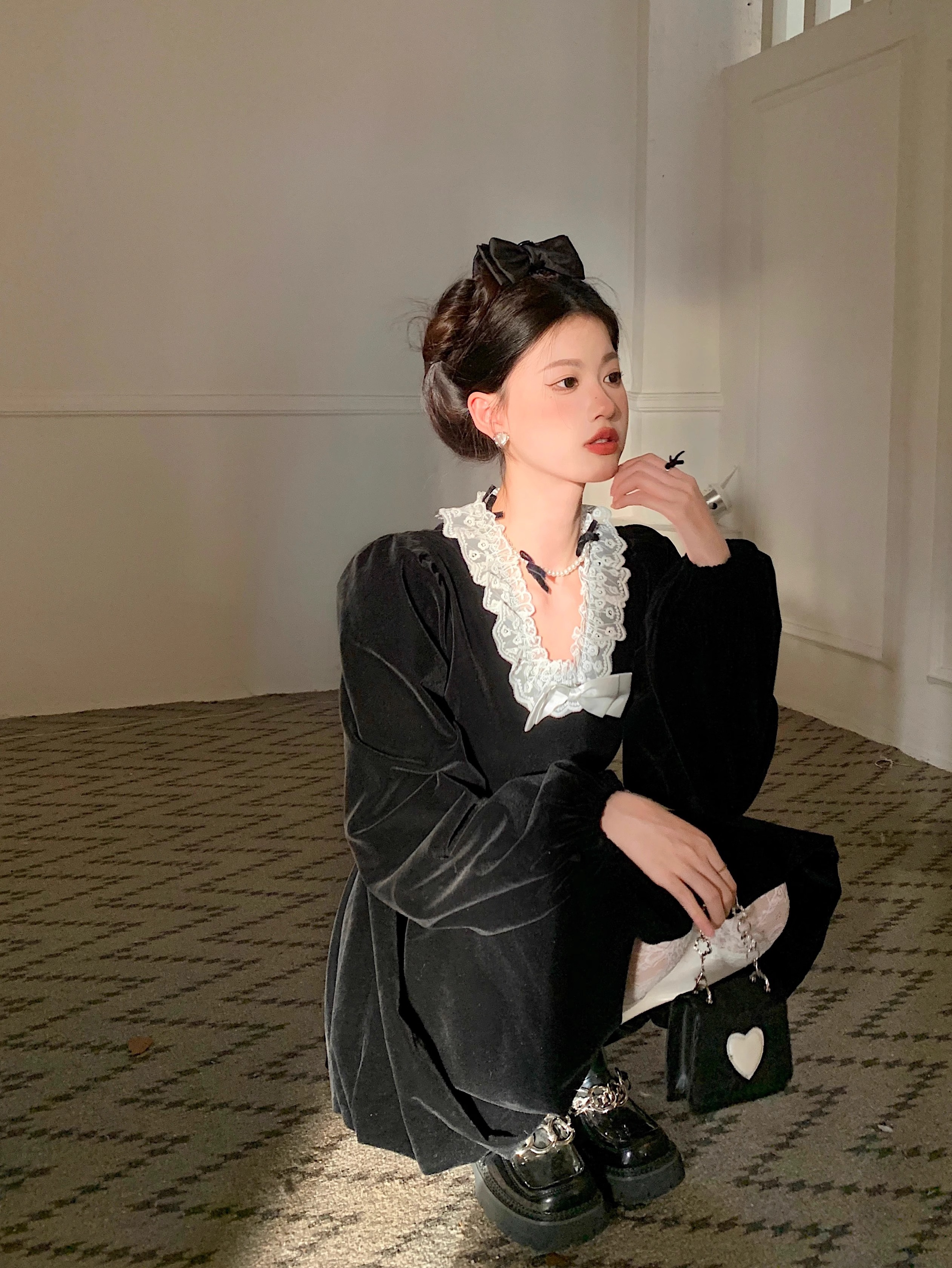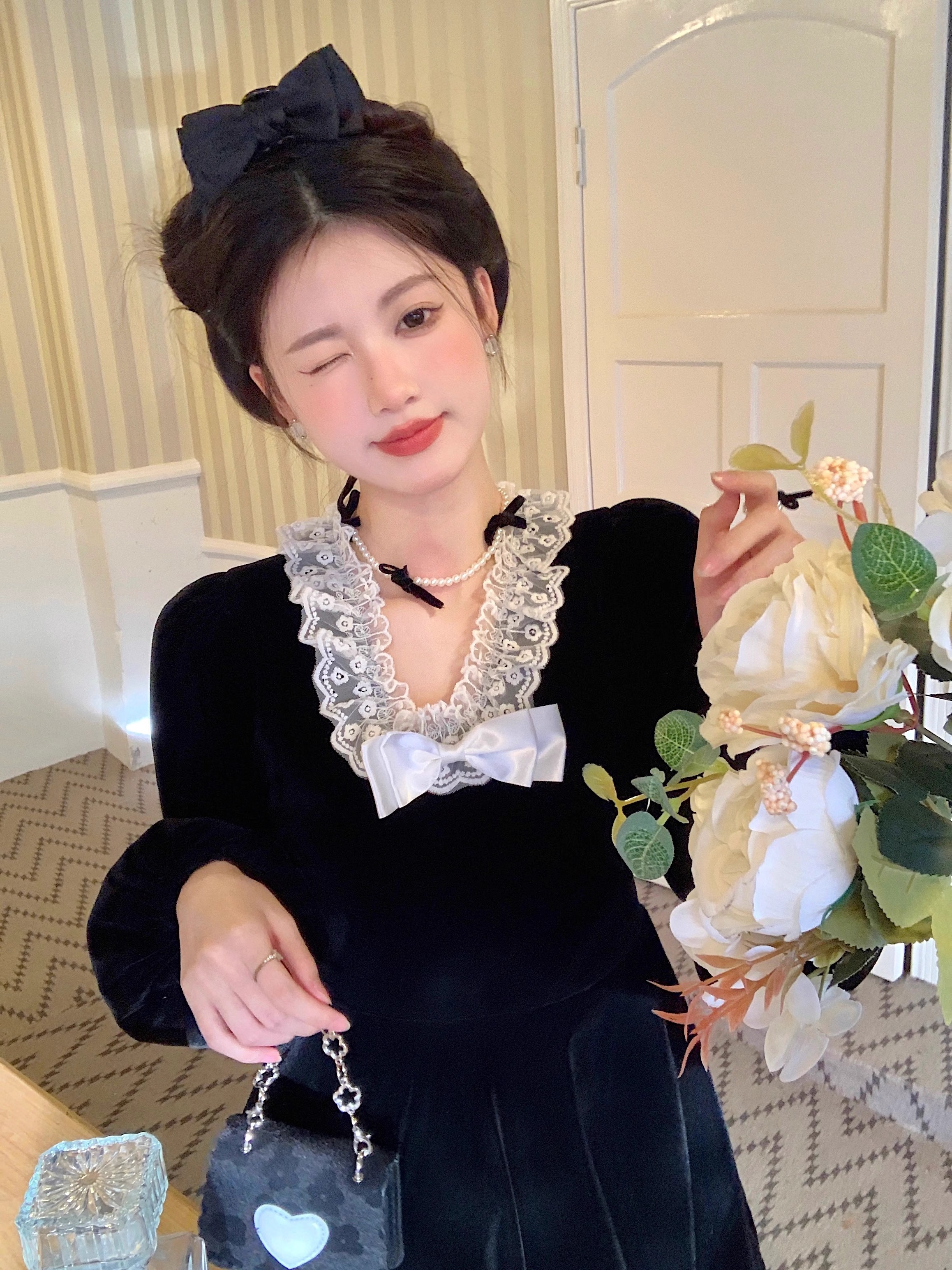 • Plus-size autumn/winter French Hepburn-inspired elegant little black dress for petite women; princess dress for a slimming effect.