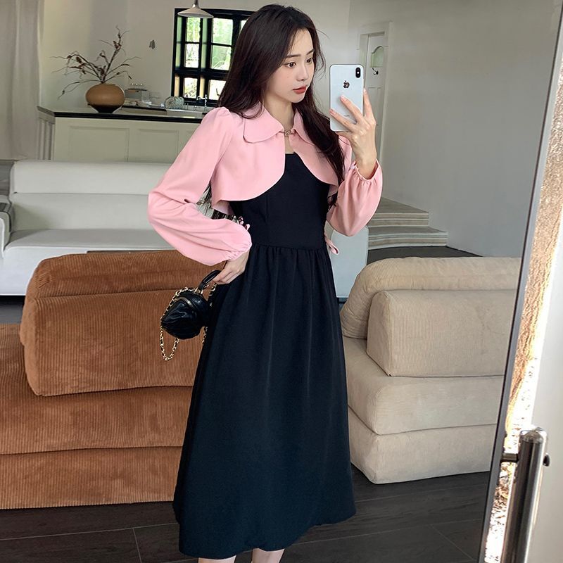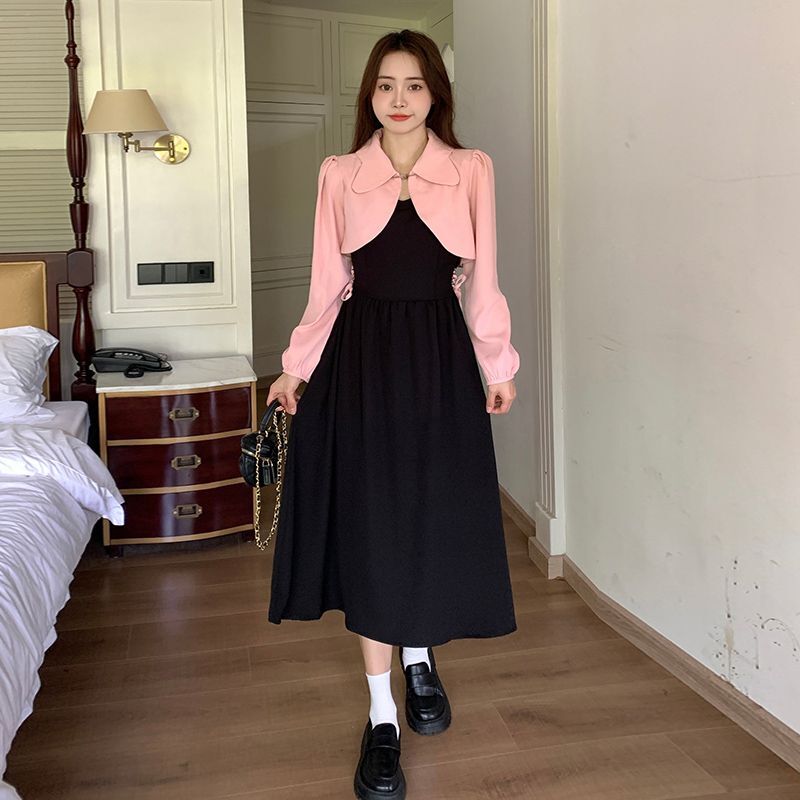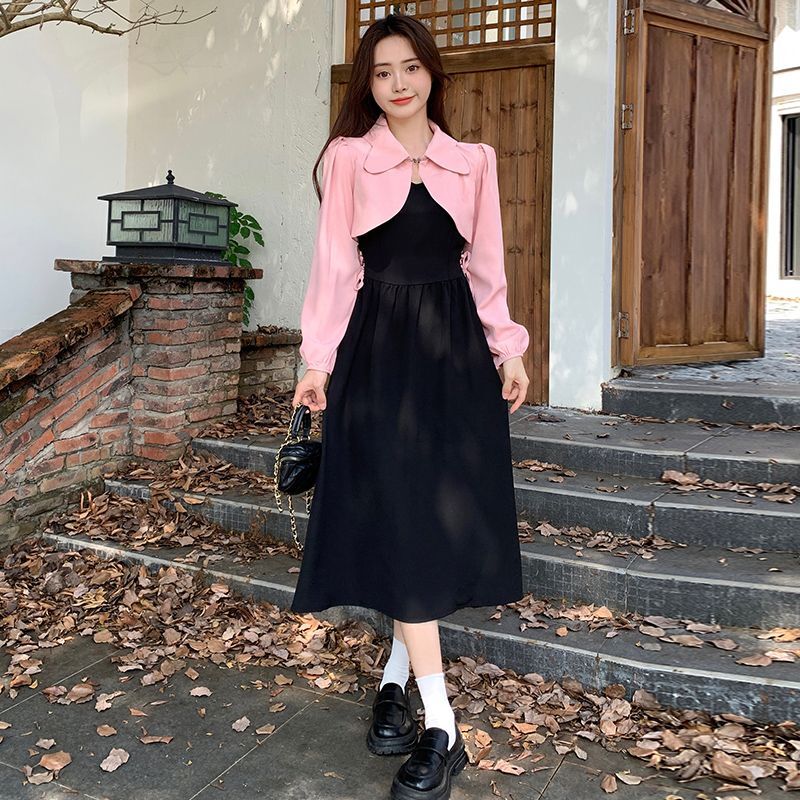 #345 Real shot of a two-piece plus-size French dress for women, slimming and elegant pink top and jacket + tie