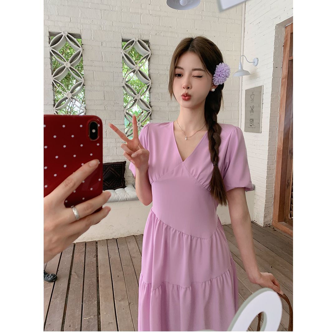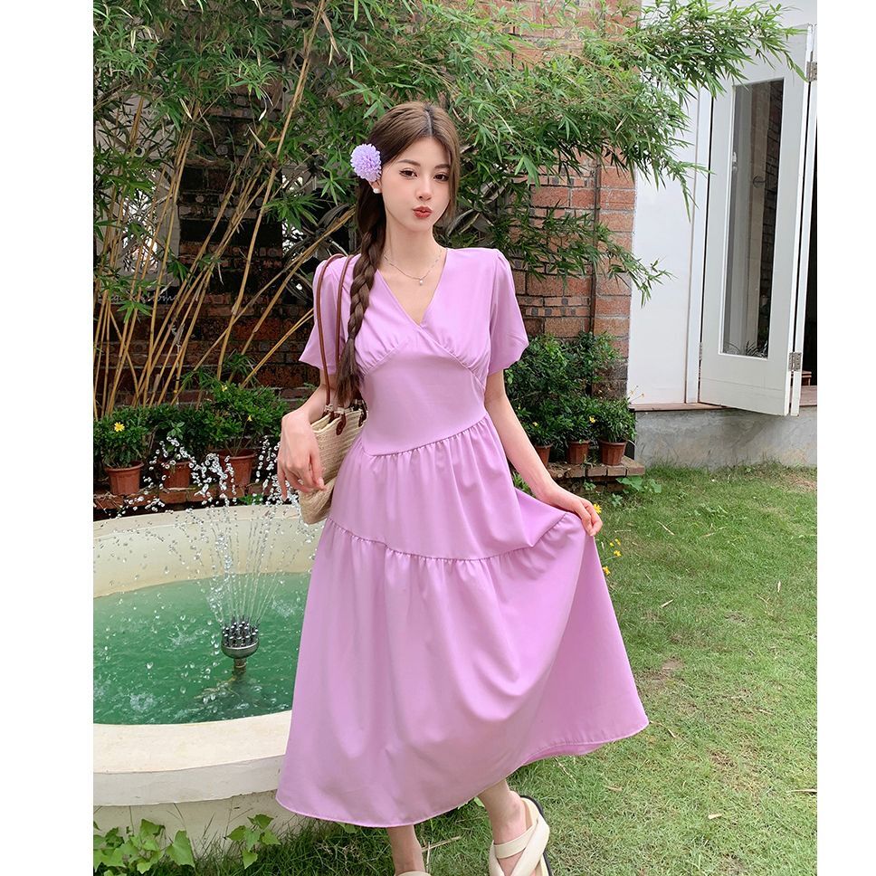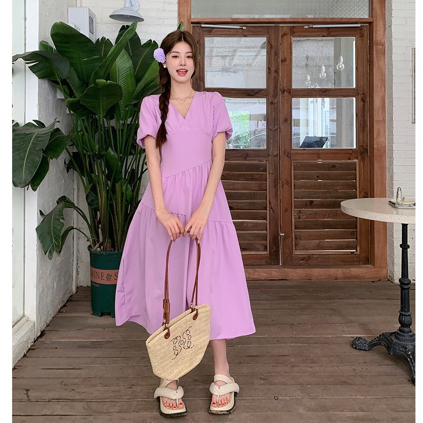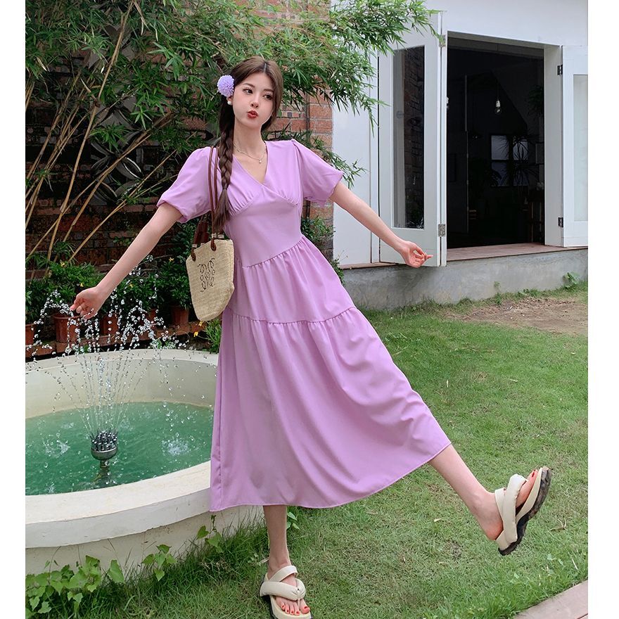 • Real shot of a French purple dress for summer, a new style for women, with a gentle, high-waisted, slimming, puff sleeve long dress.
