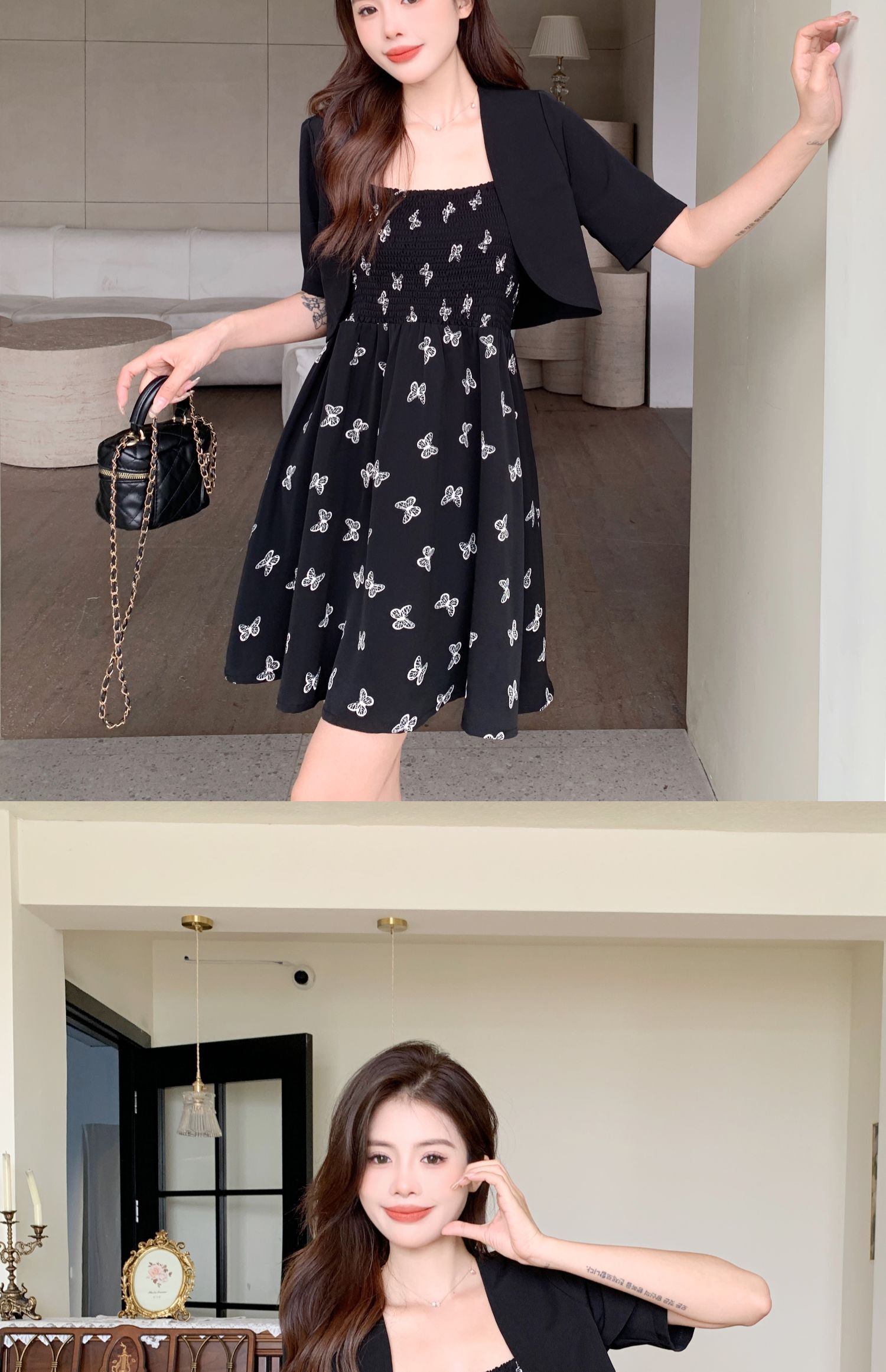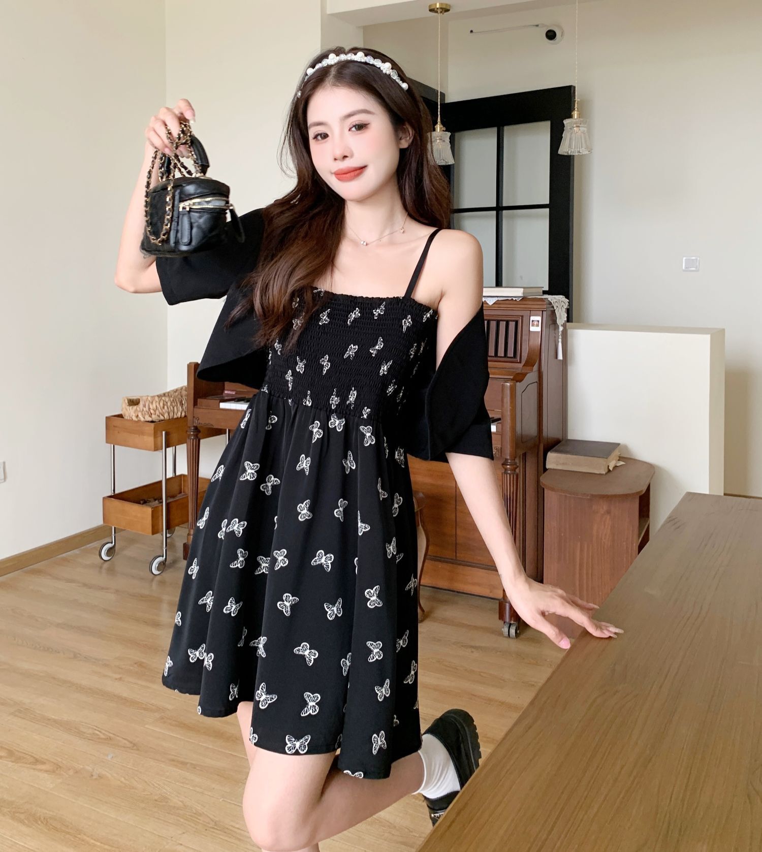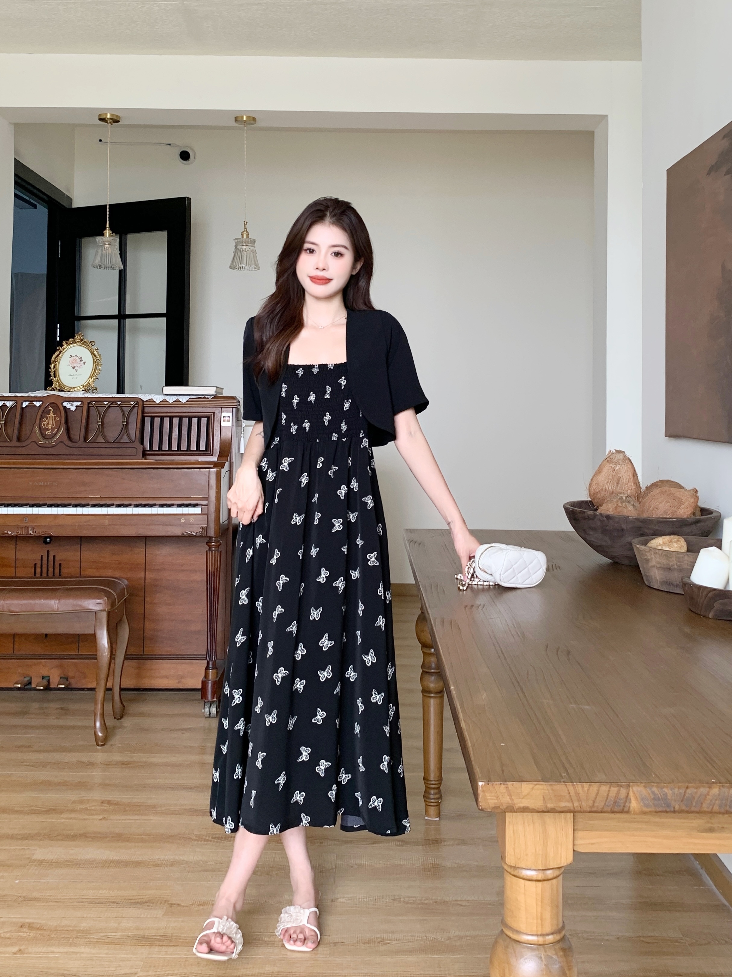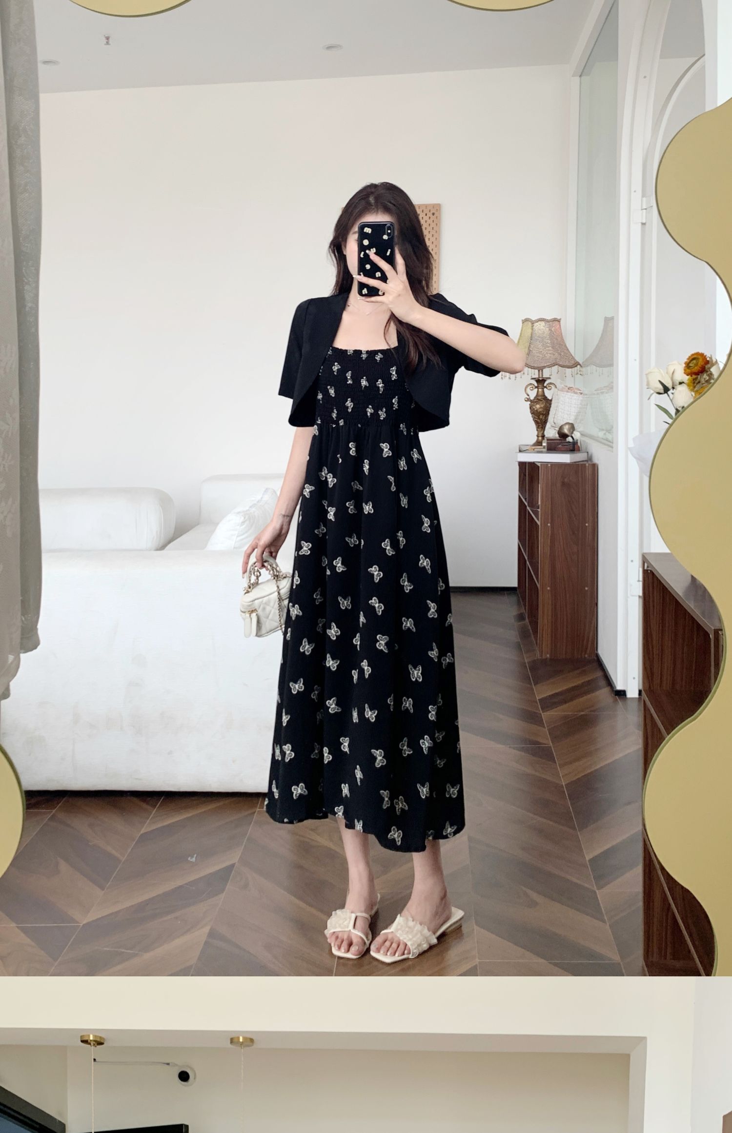 Plus-size women's summer new style, flattering and youthful, floral print suspender dress two-piece set.