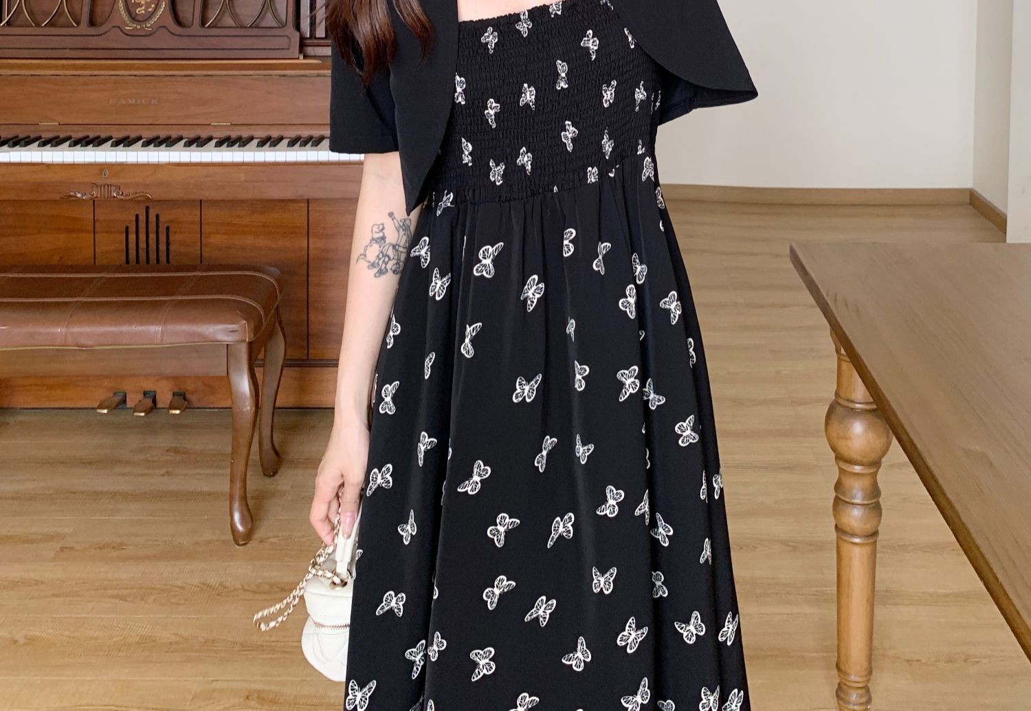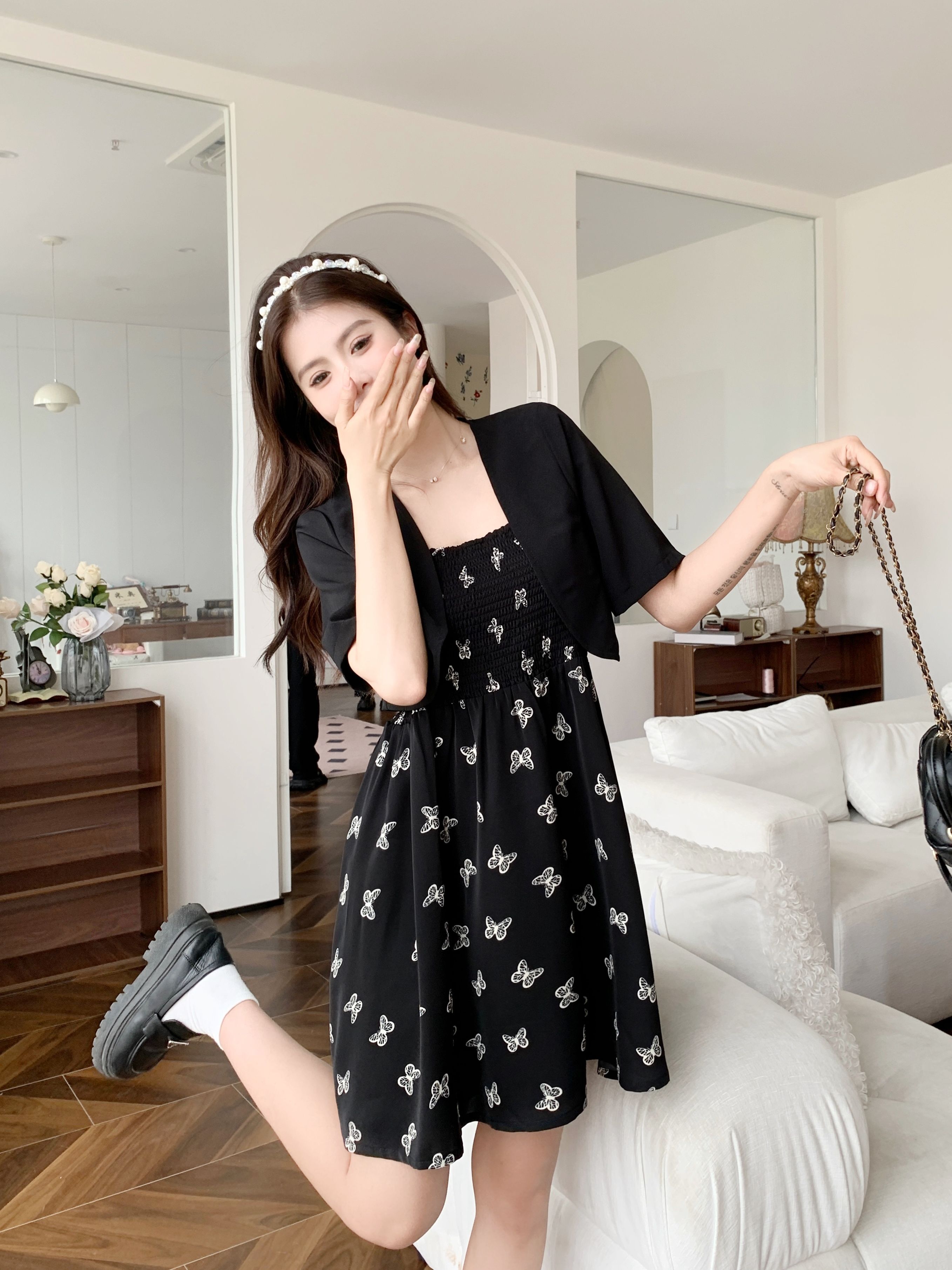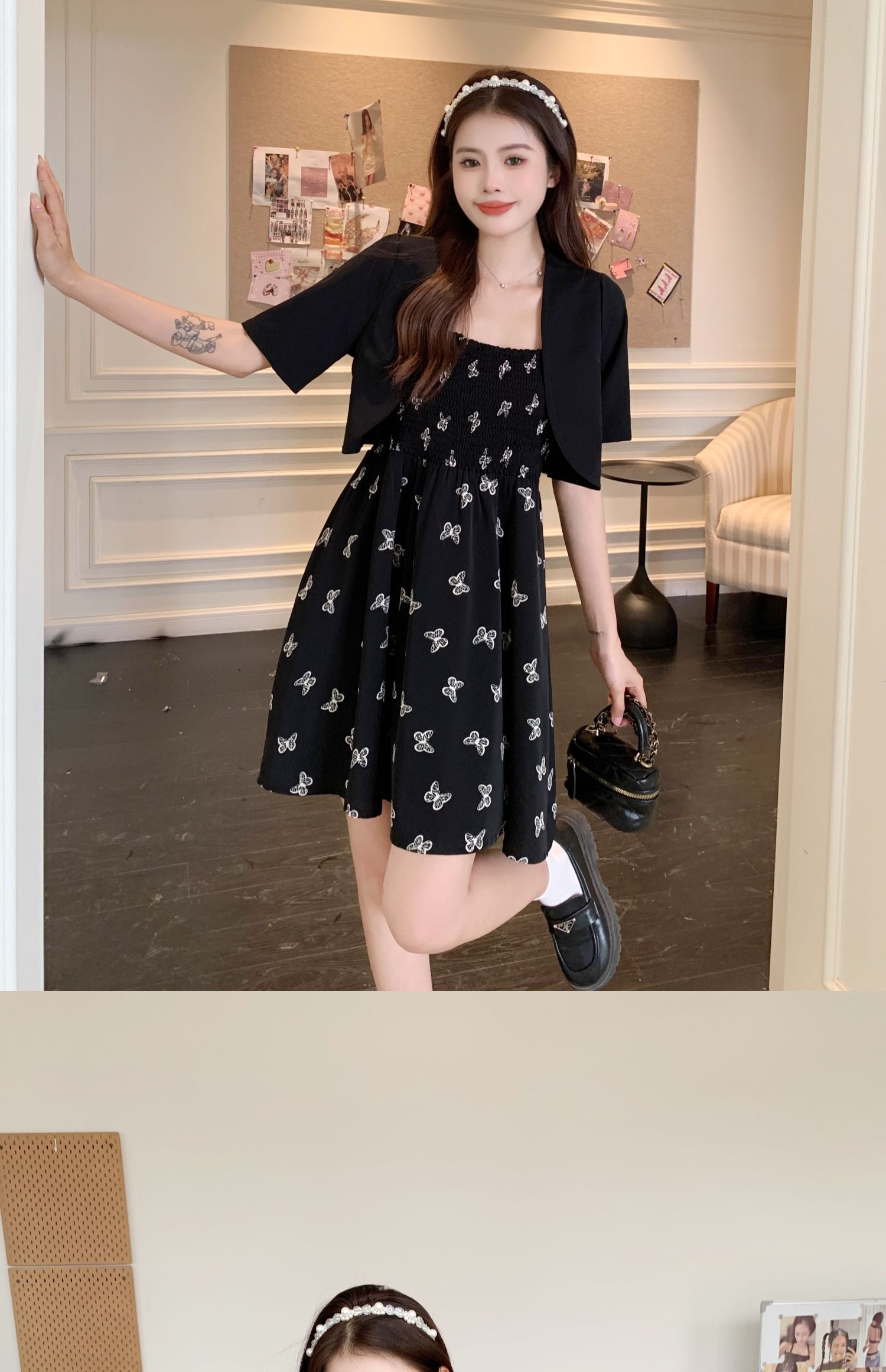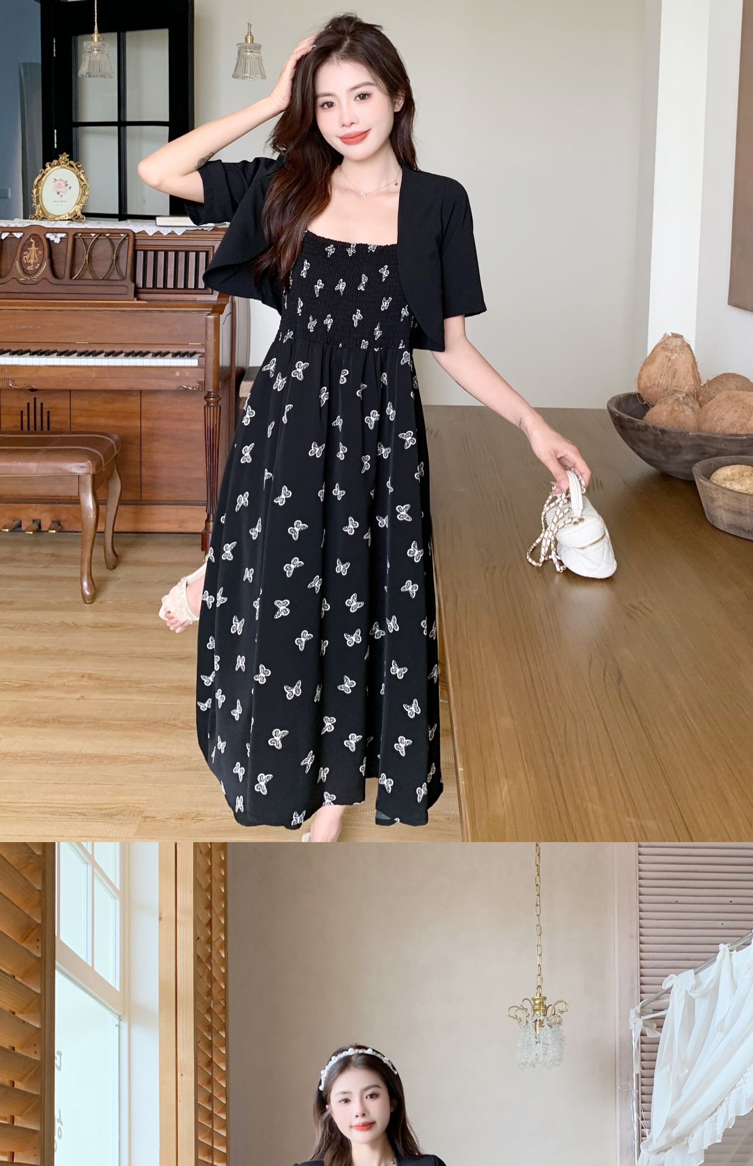 Plus-size women's summer new style, flattering and youthful, floral print suspender dress two-piece set.
