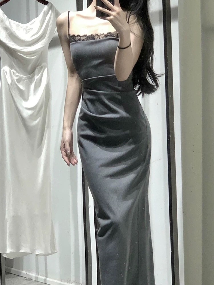 • Grey heiress style suspender dress, summer long dress, lace patchwork, pleated, sexy and alluring bodycon skirt.