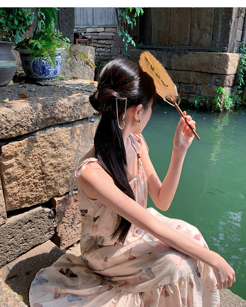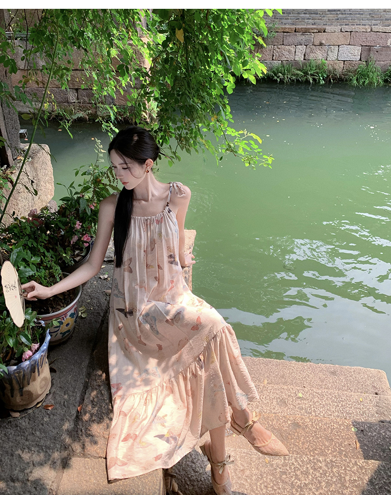 • Butterfly Print Floral Beaded Sundress Summer Women's Lace Mid-Length Tie-Waist Resort Style Dress
